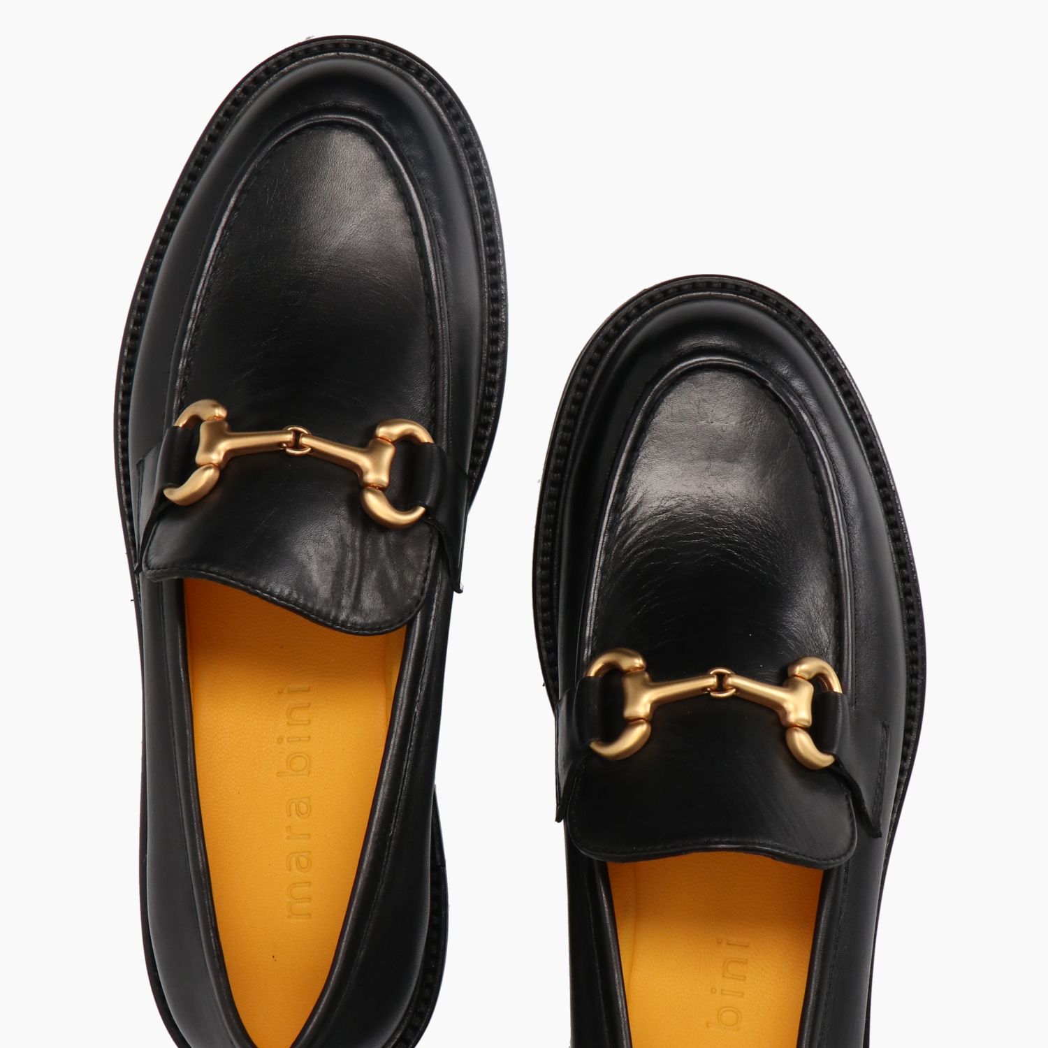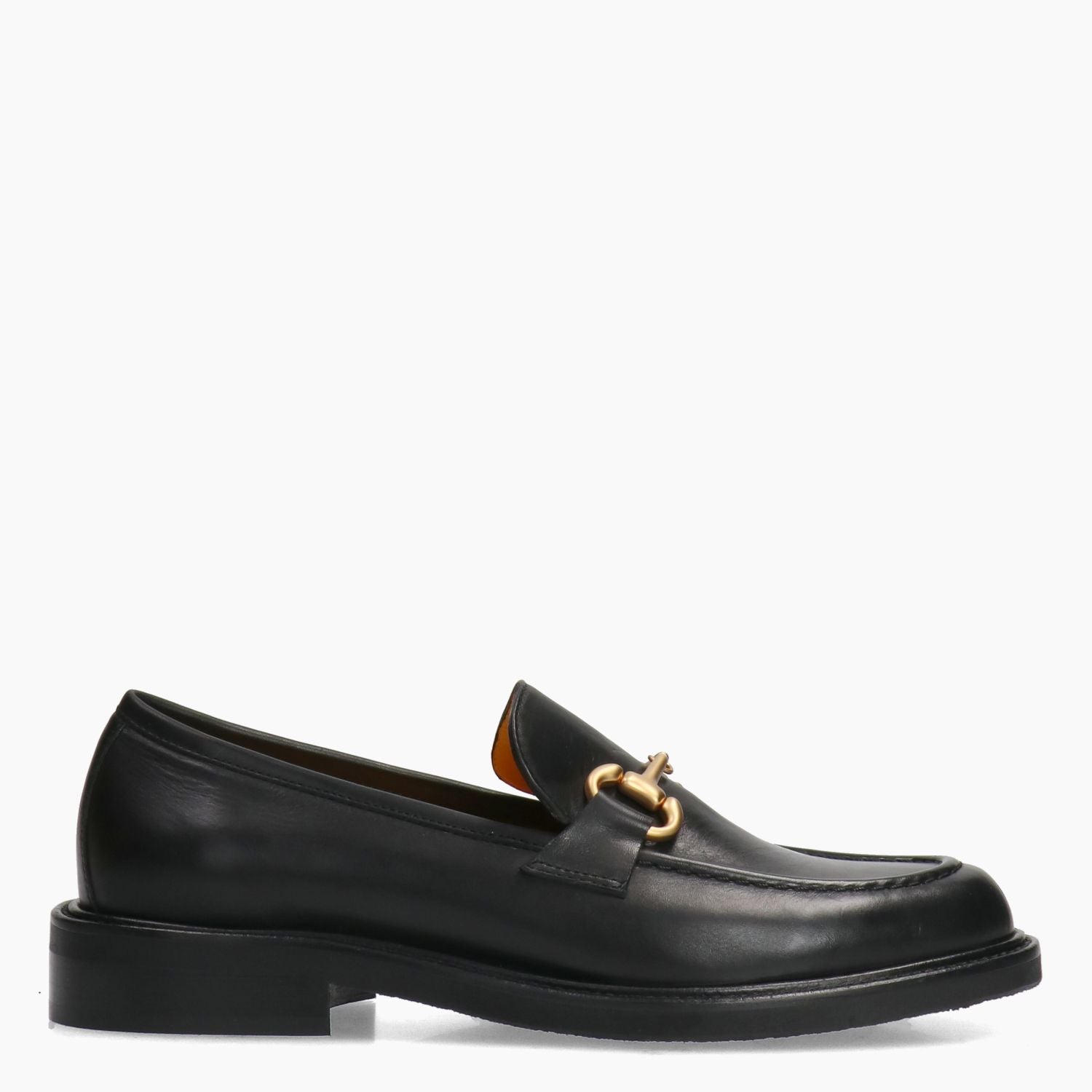 Black leather loafer with brass-plated buckle. Satchel-style leather interior. Non-slip rubber sole with 2.5 cm heel. Mara Bini women's Fall/Winter collection.