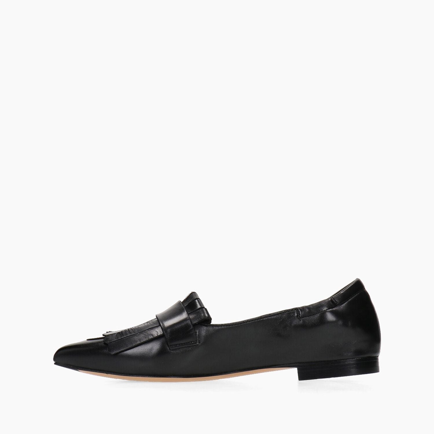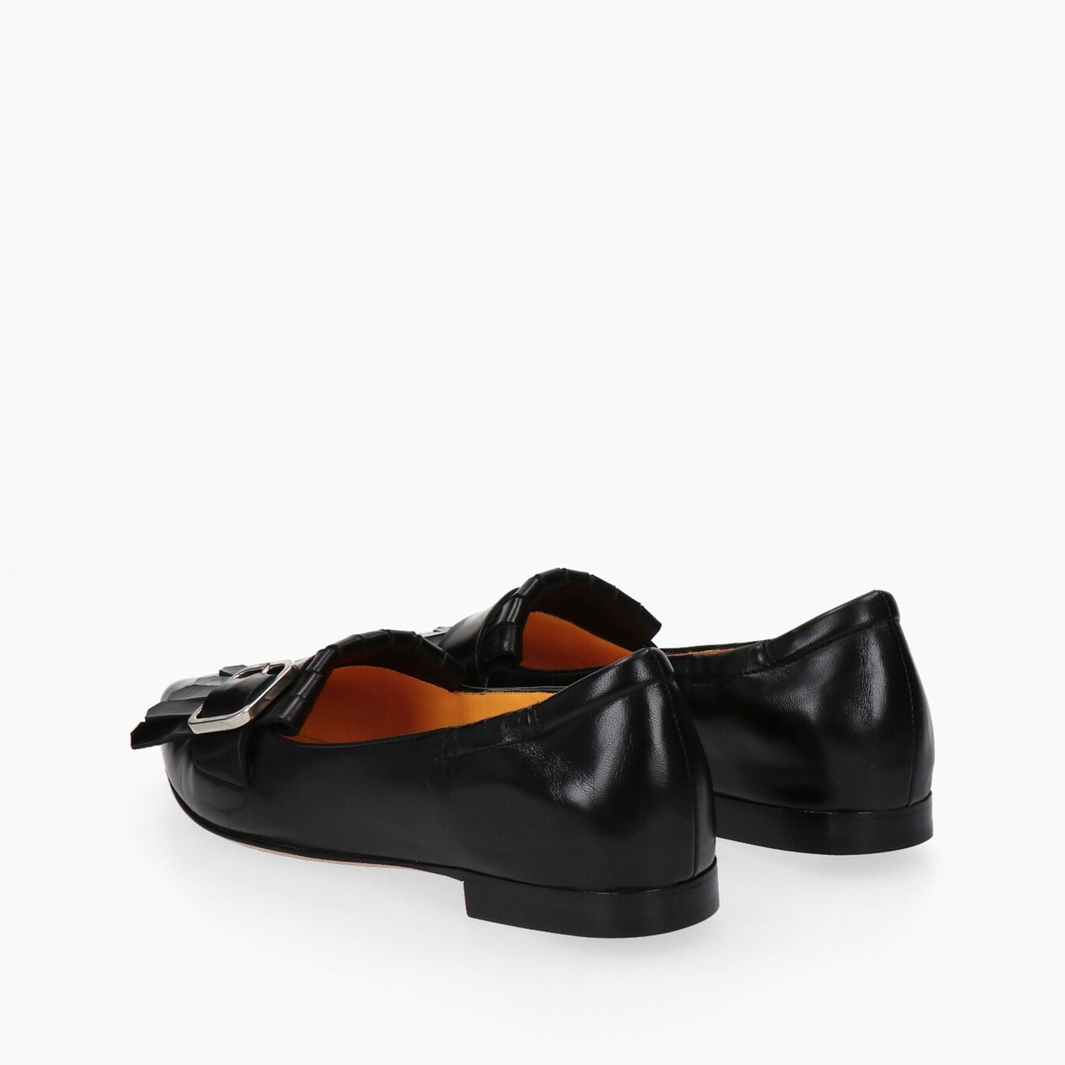 Black leather loafers with fringe and silver buckle, slip-on construction, 10 cm heel with 15 cm internal lift, leather sole with rubber insulator.