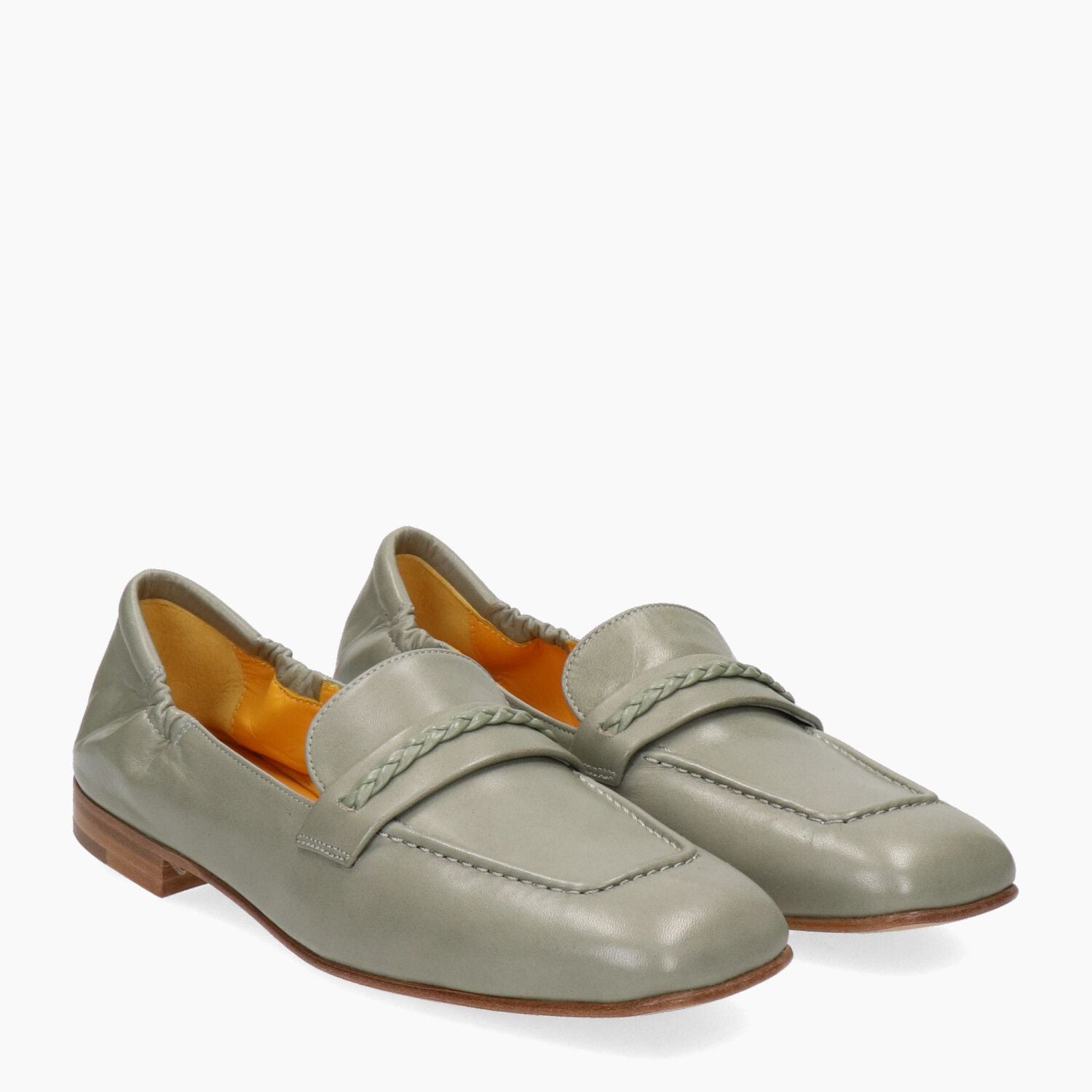 Sage leather loafers with strap and braid, bag workmanship, leather sole with rubber island.