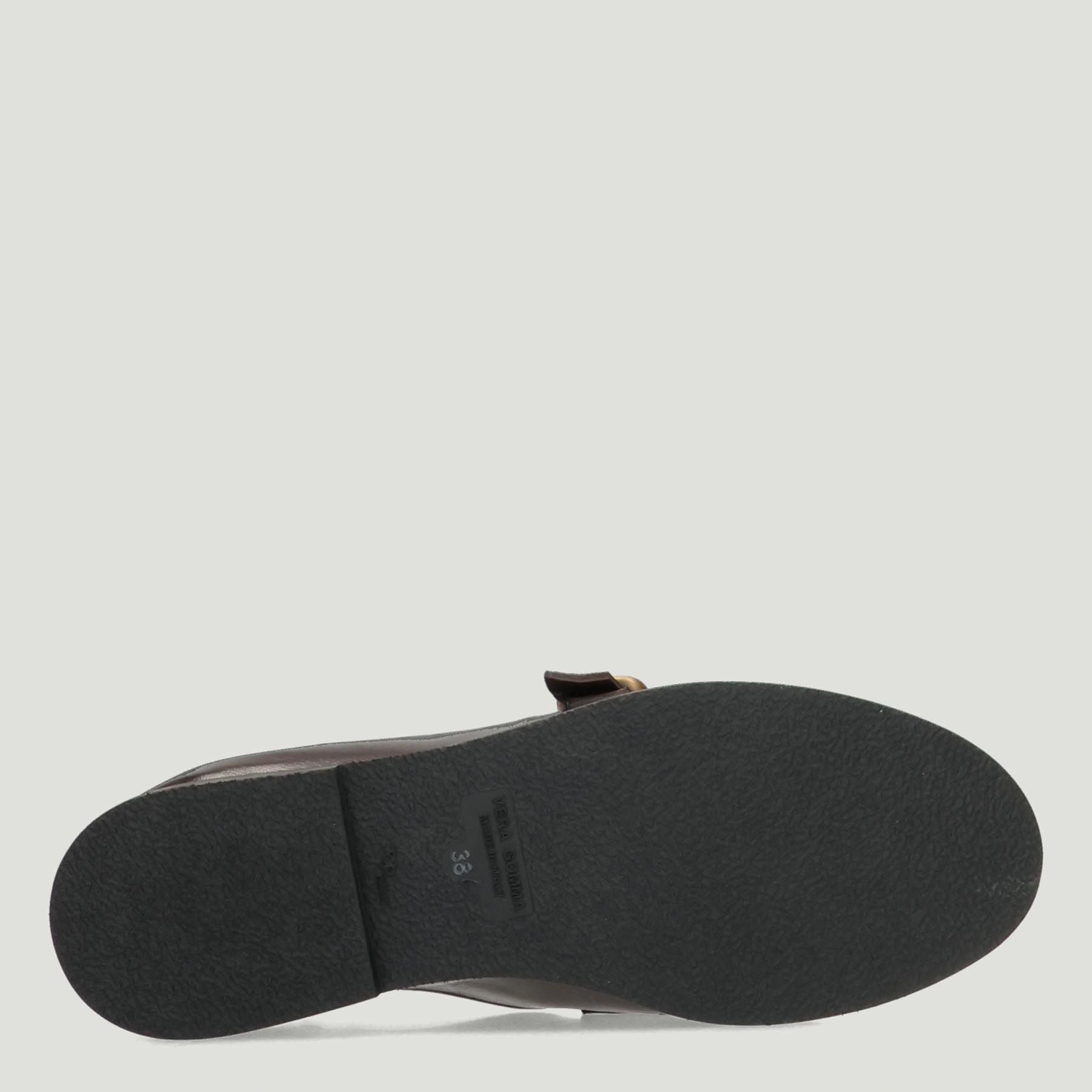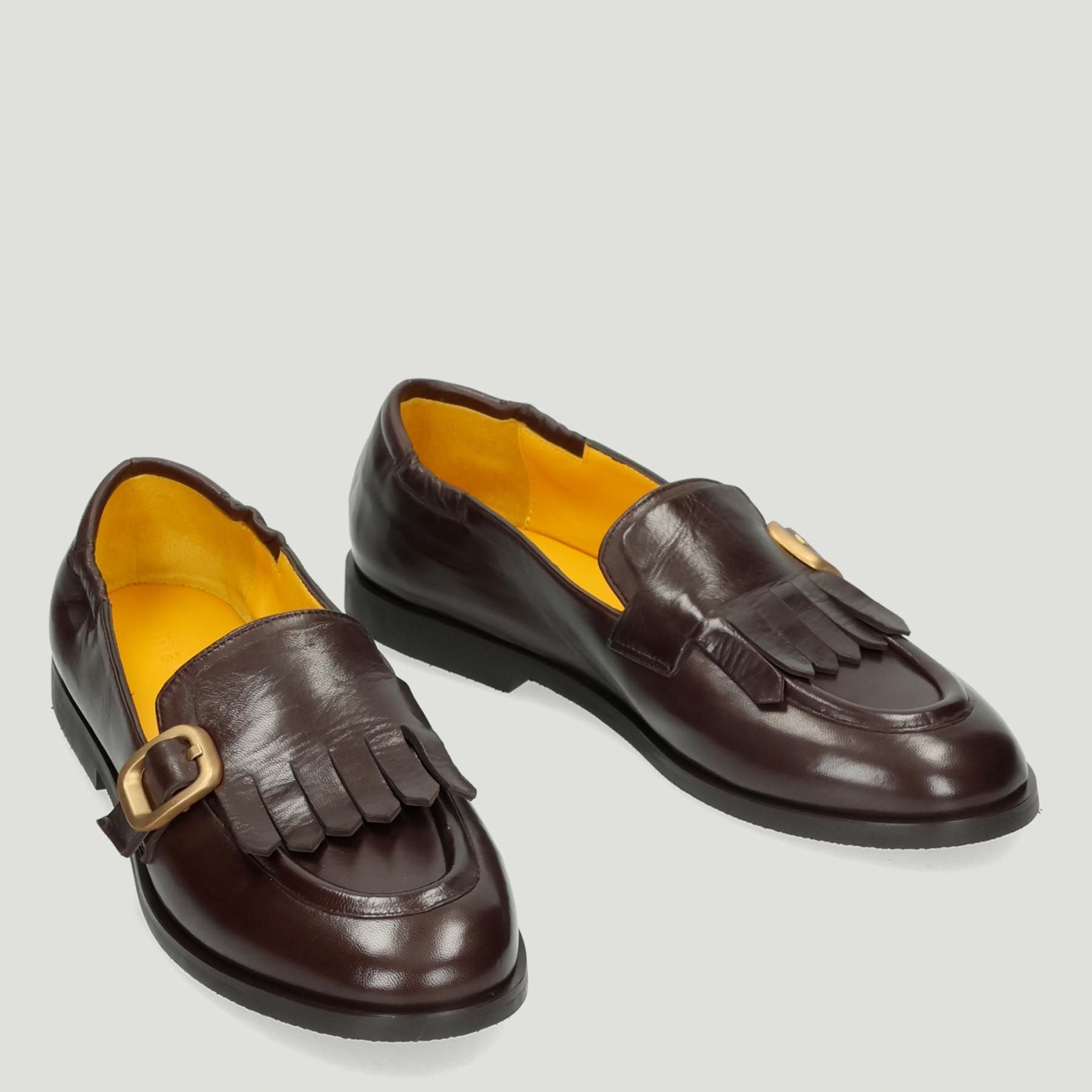 Coffee-colored leather loafer with fringe and gold satin buckle. Satchel-style leather lining. Elastic side cuffs for a better fit. Non-slip rubber sole with a 2 cm heel. Mara Bini women's Fall/Winter collection.