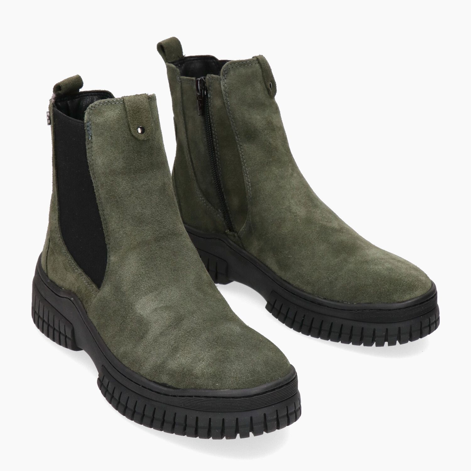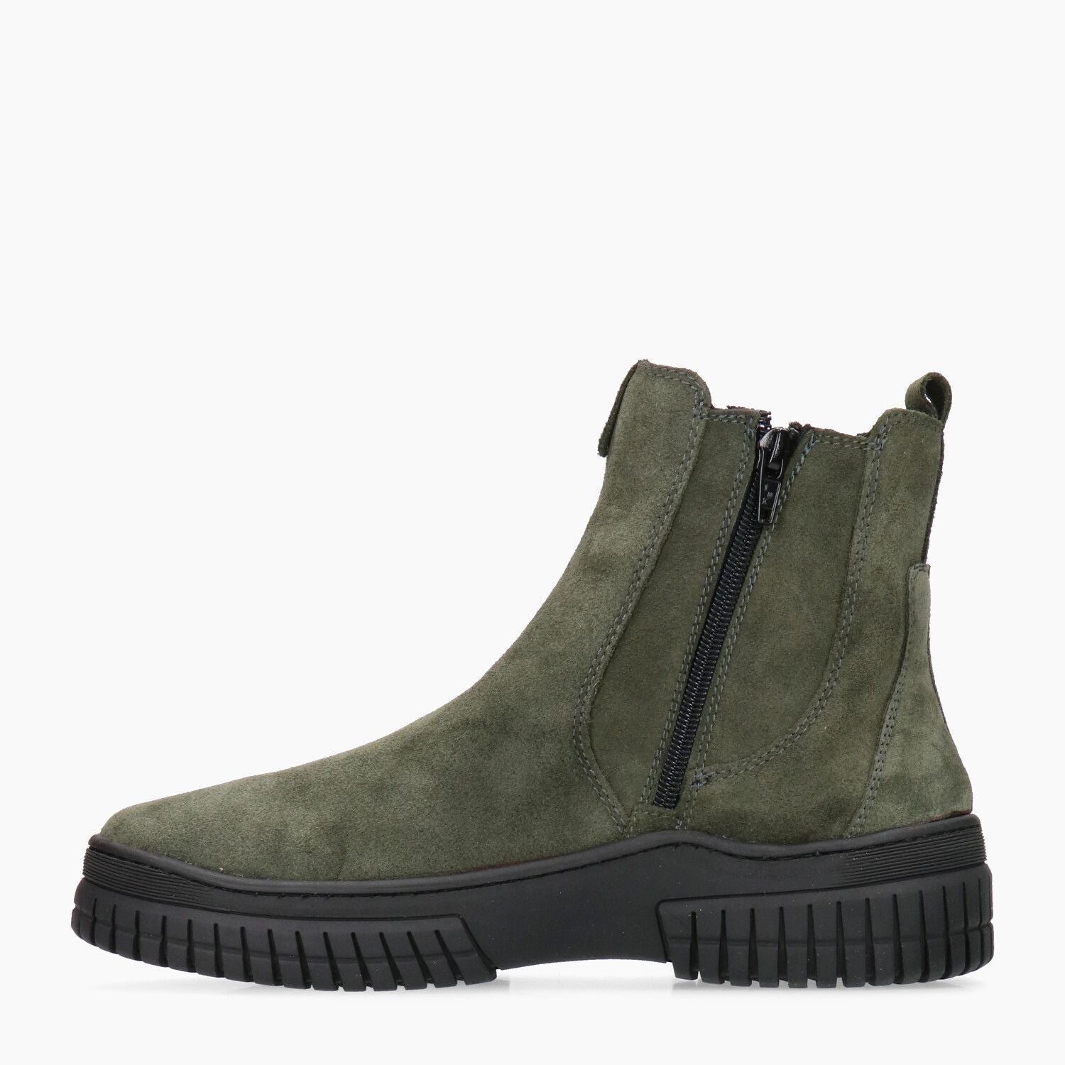 Military suede ankle boots with faux fur trim and side zip, rubber wedge sole.