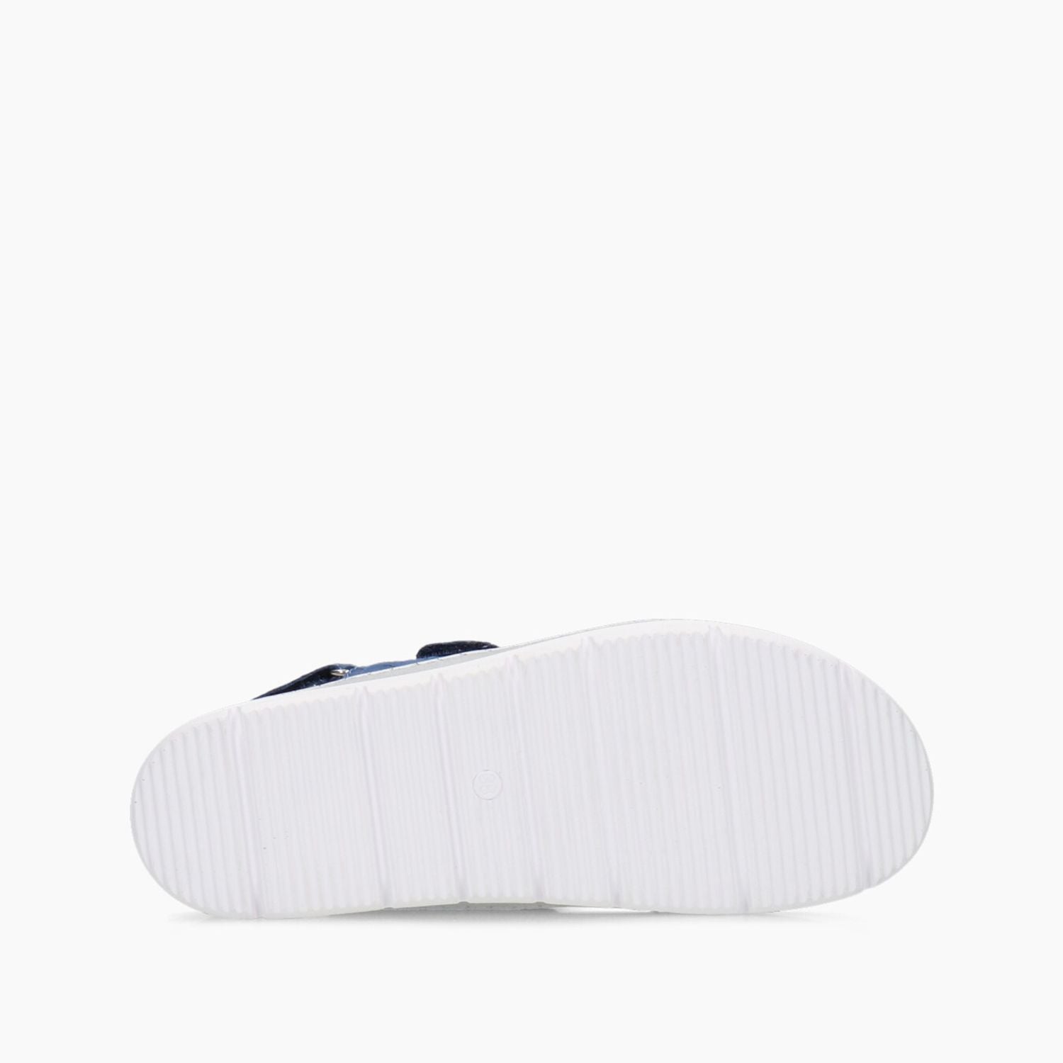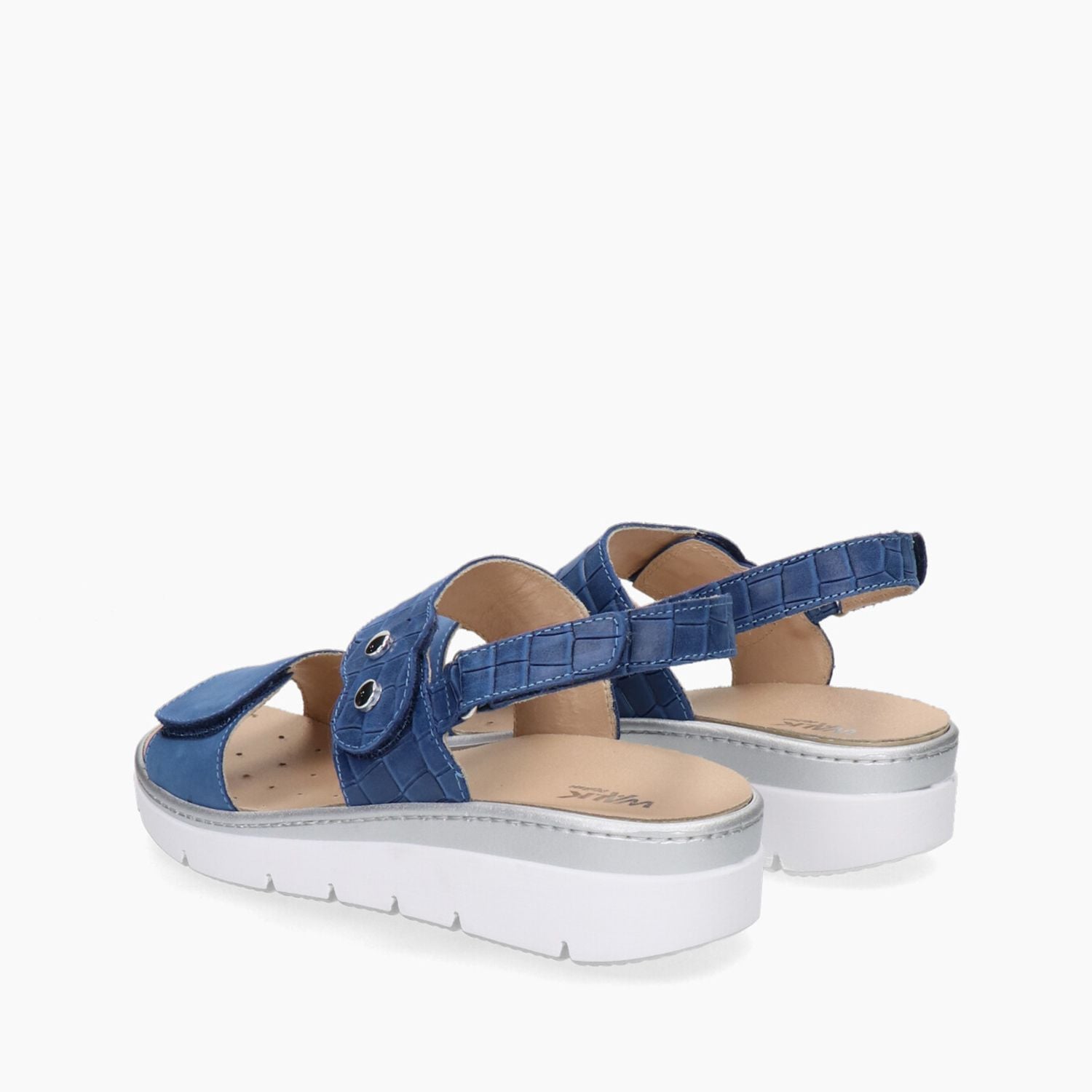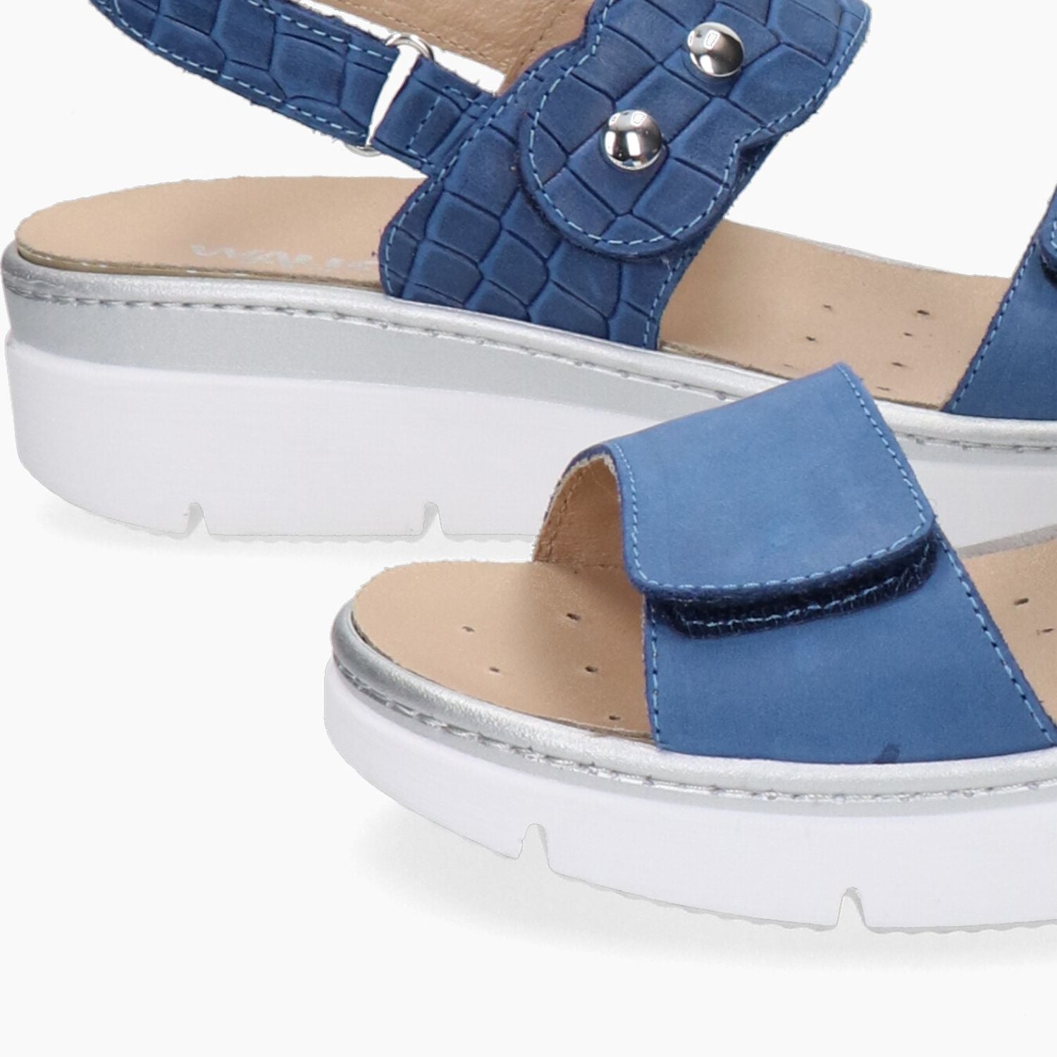 Blue crocodile-print leather sandals with double adjustable velcro, 40 wedge, rubber sole.