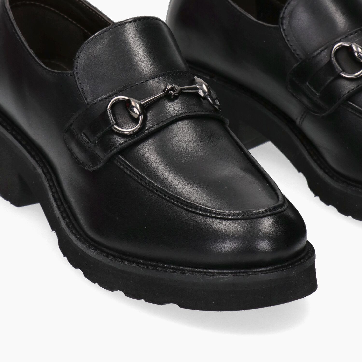 Black leather loafers with metal clip, rubber sole.