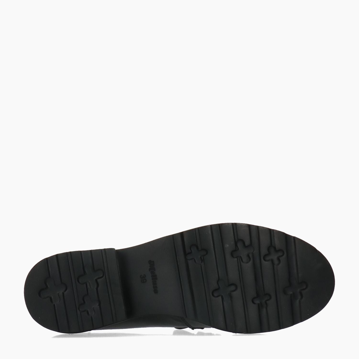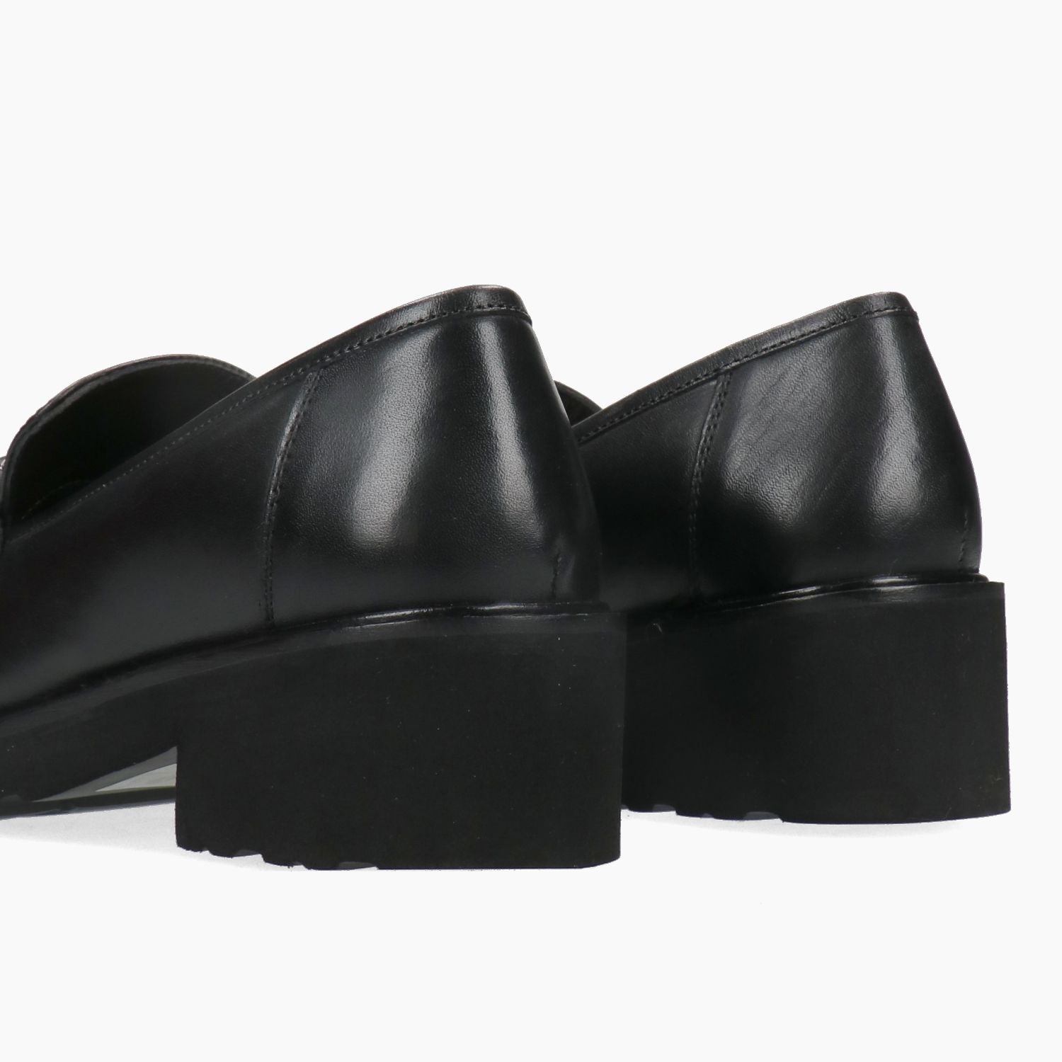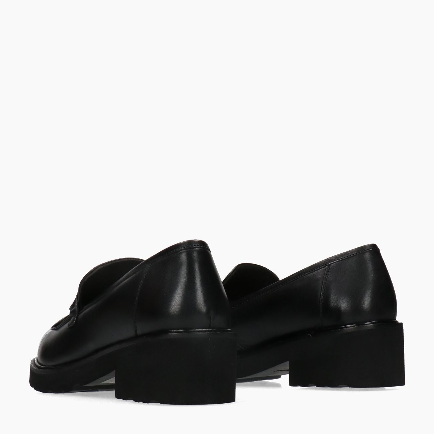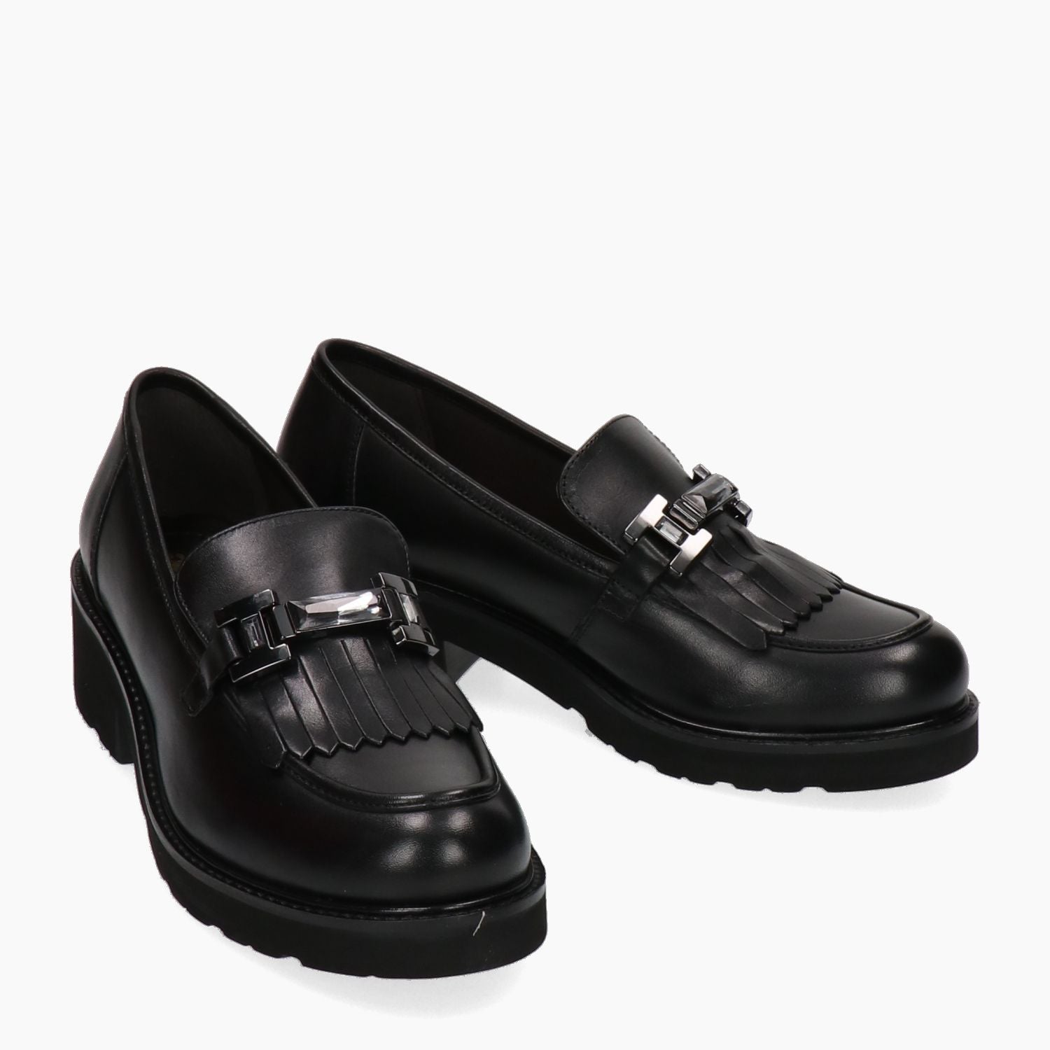 Black leather loafer with a fringed front and a strap with a metal buckle. Leather and fabric lining. Rubber sole with a 4.5 cm heel. Melluso women's Fall/Winter collection.