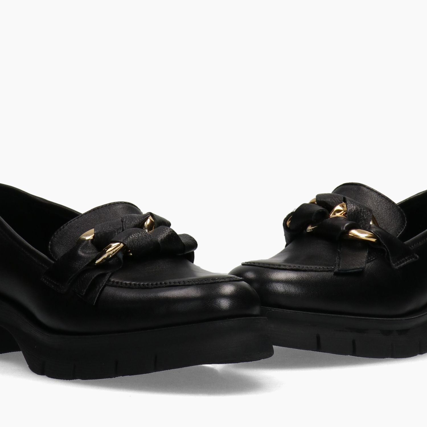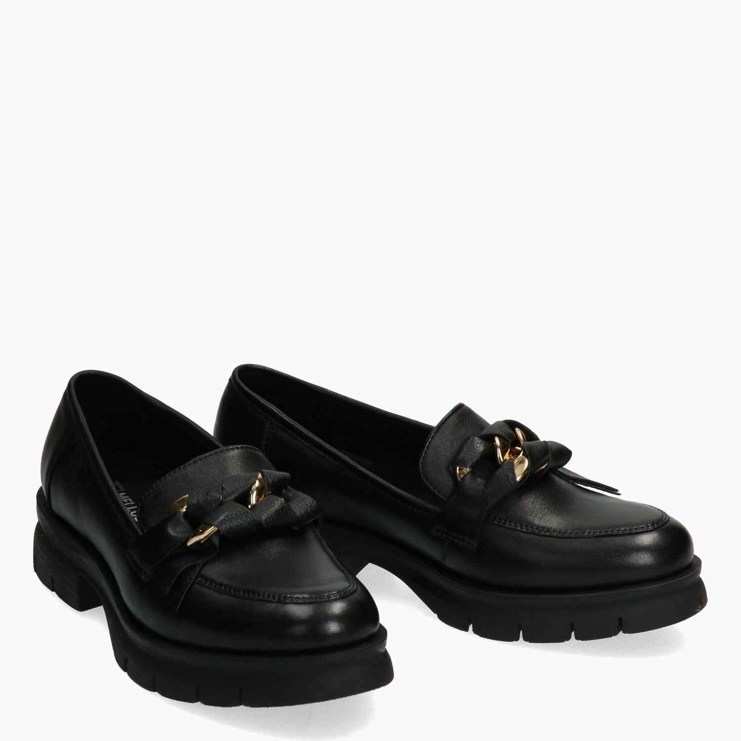 Black leather loafers with a covered gold metal clip. Leather lining with a non-removable insole. Rubber sole with a 4 cm heel. Melluso women's Fall/Winter collection.