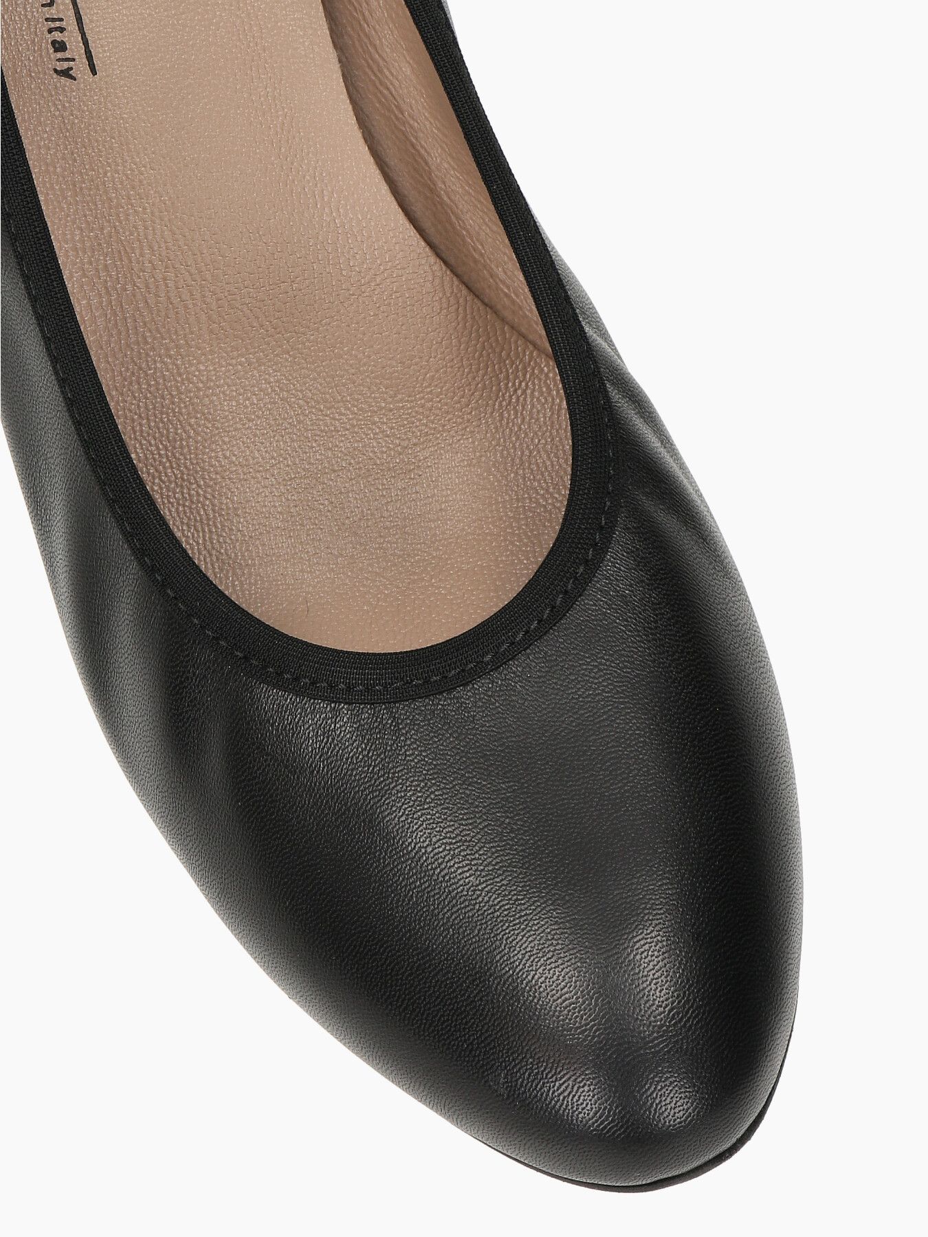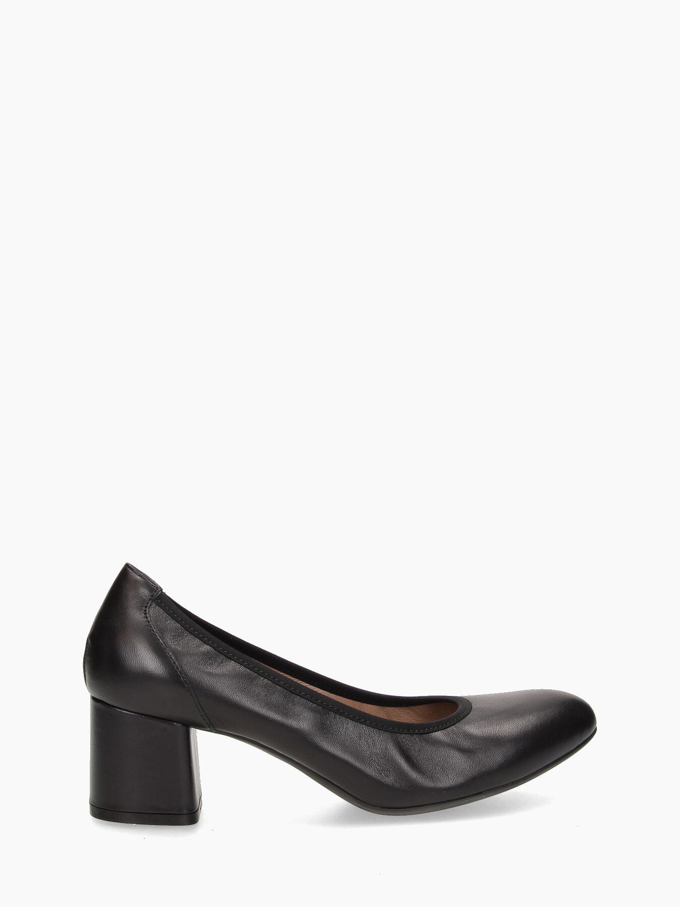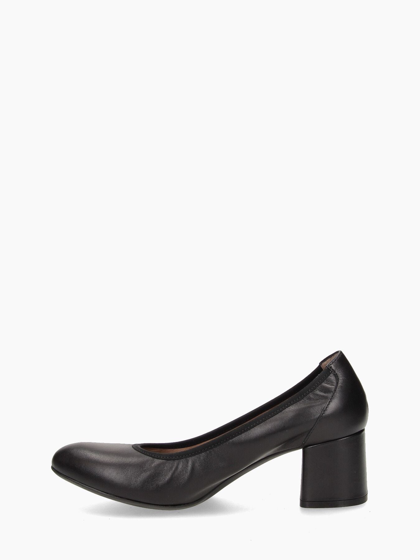 Black leather pumps with elasticated neckline, 50 cm heel and rubber sole.