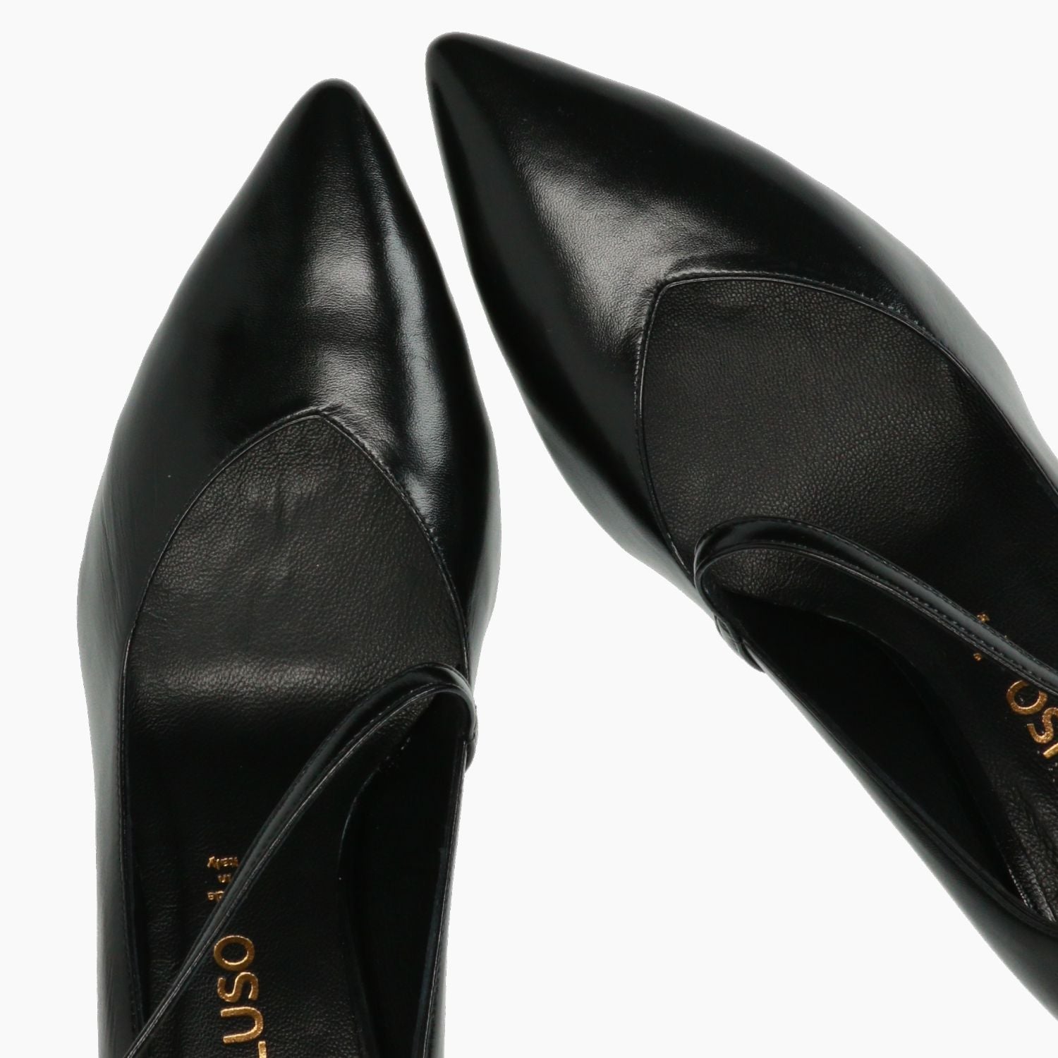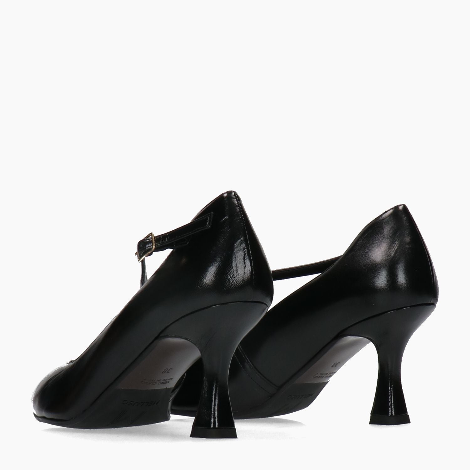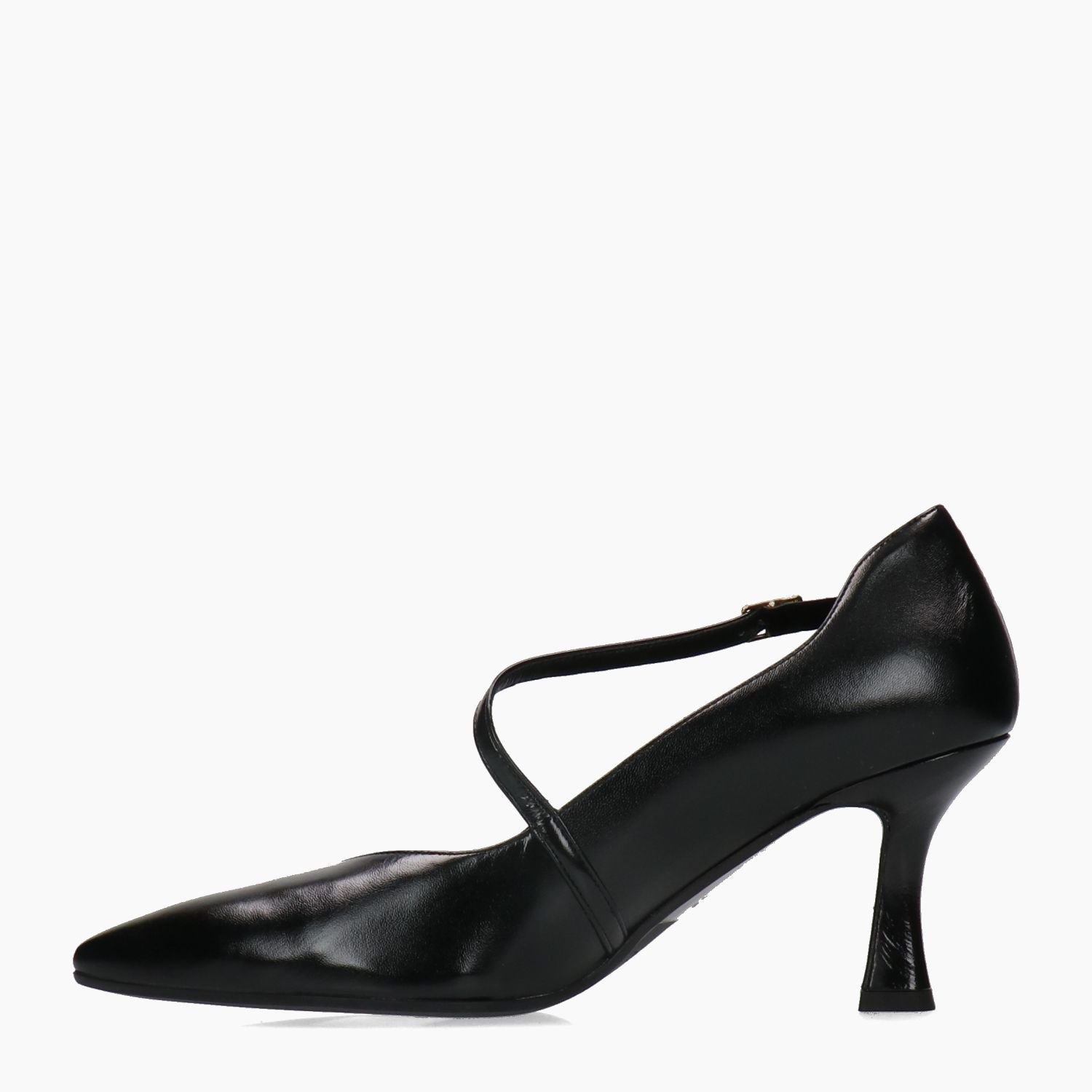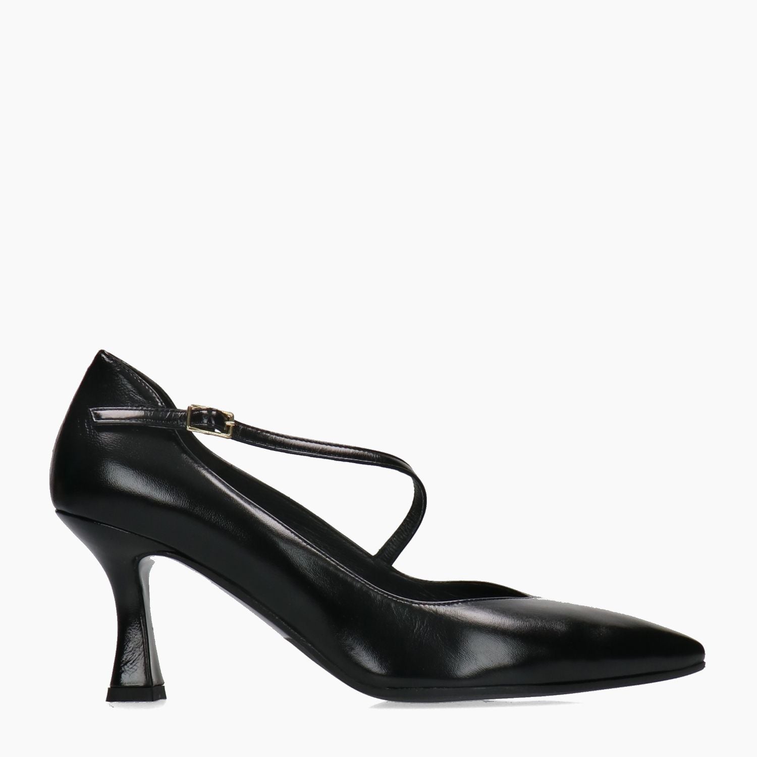 Black leather pointed-toe pump with adjustable cross strap and gold buckle. Leather interior. Leather and rubber sole with 6 cm heel. Zone 24-7 women's collection.