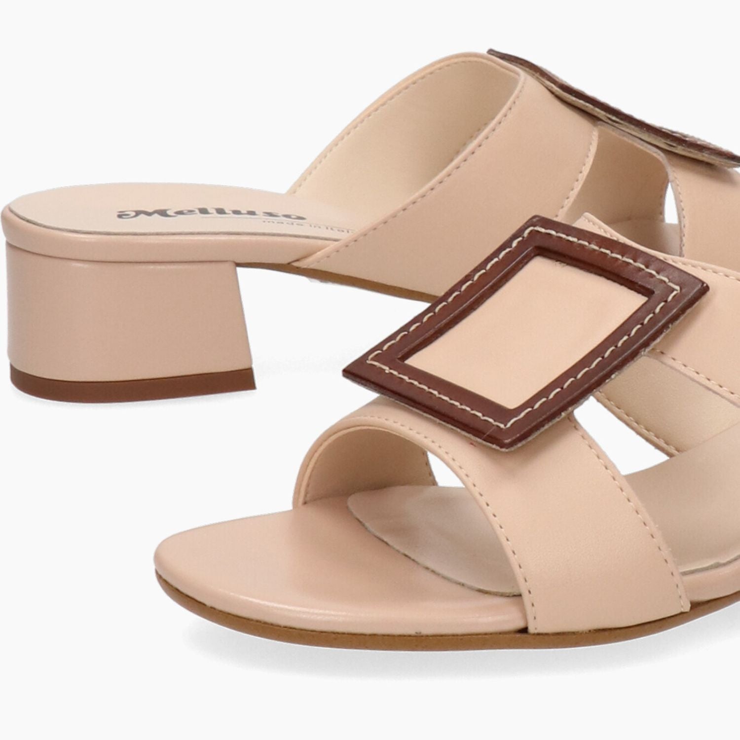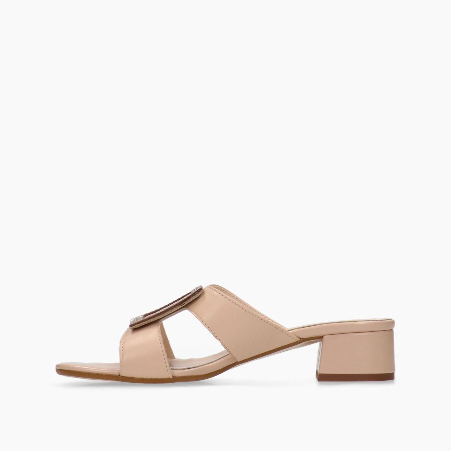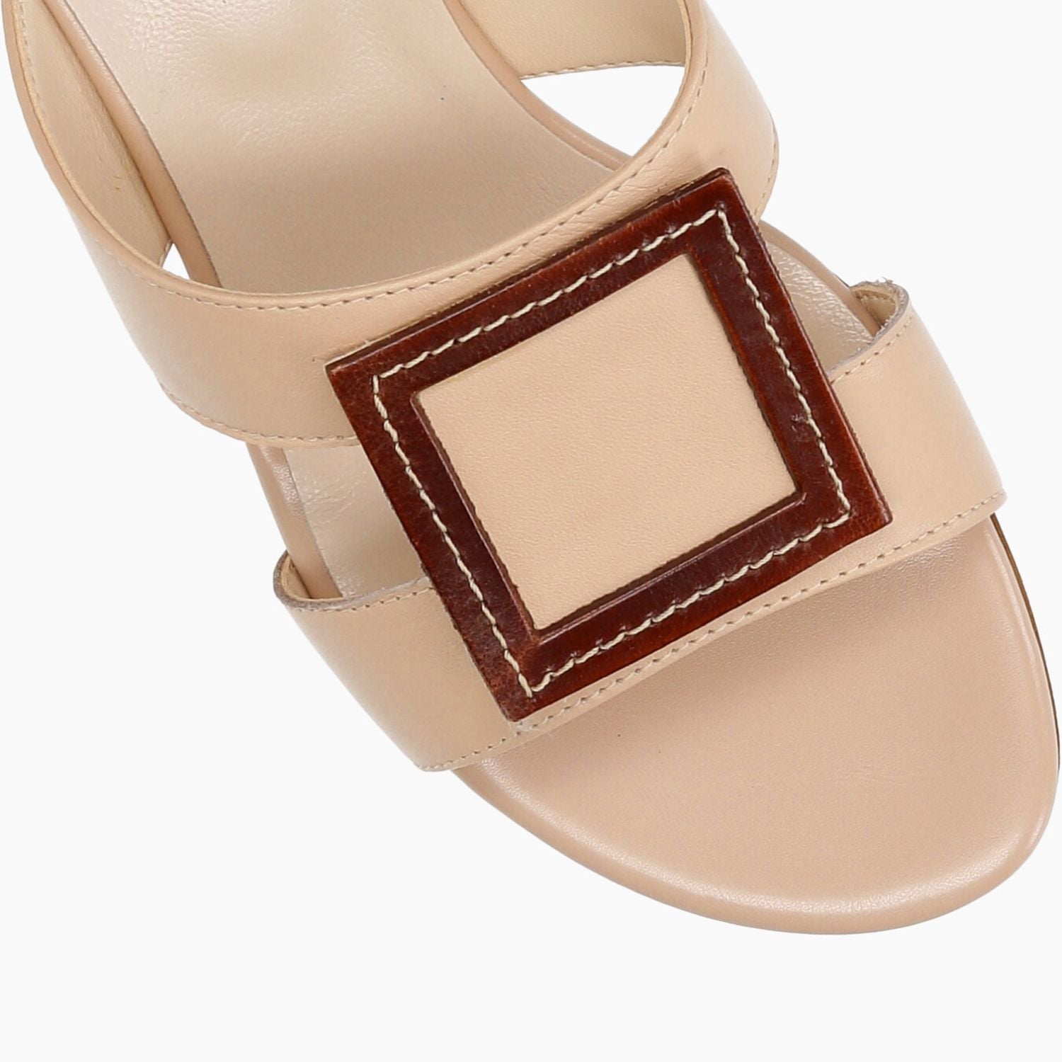 Nude leather slippers with dark brown faux square buckle, 40 cm heel, rubber sole.