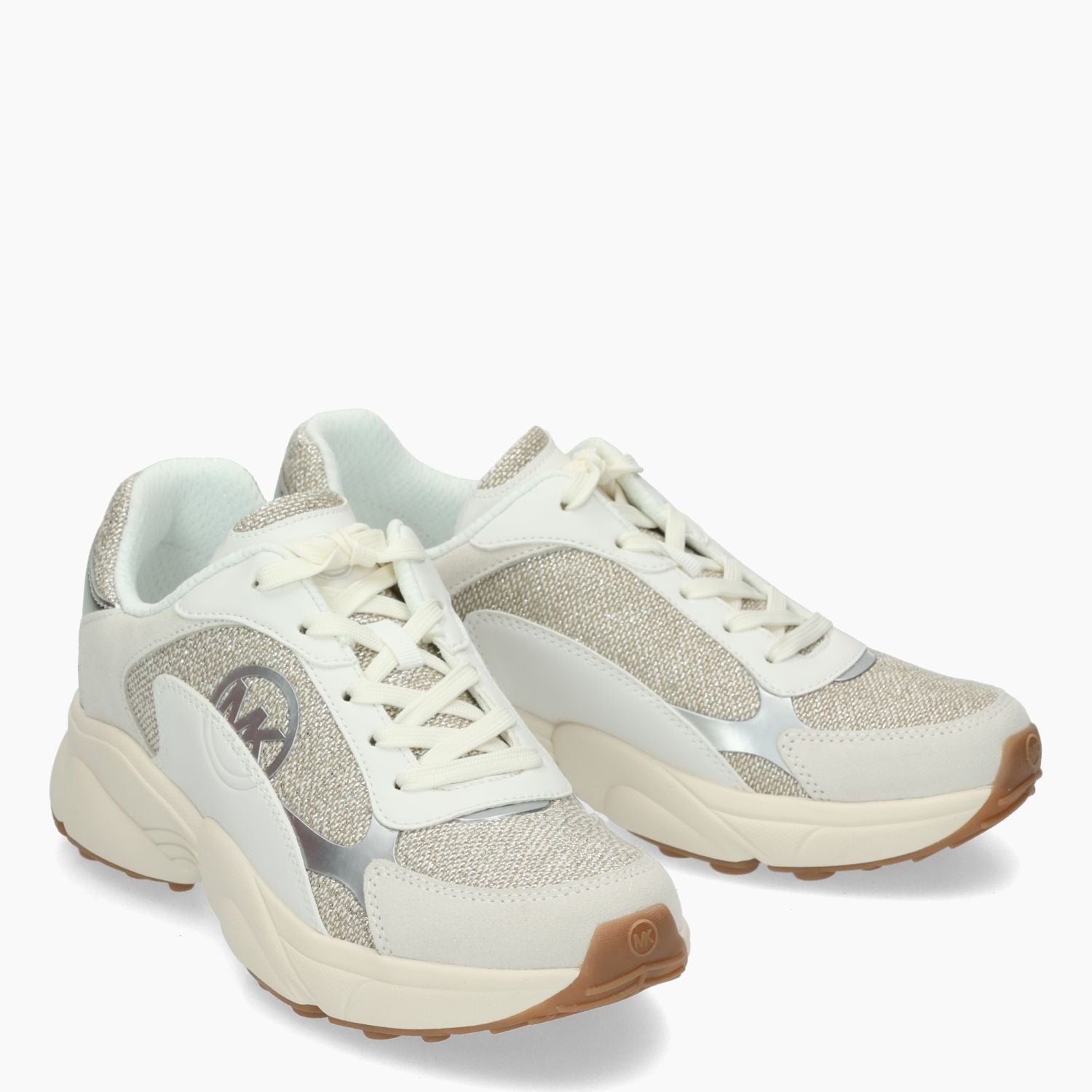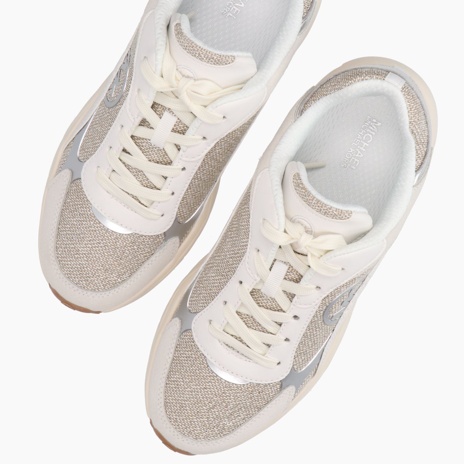 Ivory sneakers with beige/gold laminated fabric upper and matching leather and suede trim. Silver side logo. Fabric lining with non-removable insole. 3 cm rubber sole. Michael Kors Spring/Summer collection.