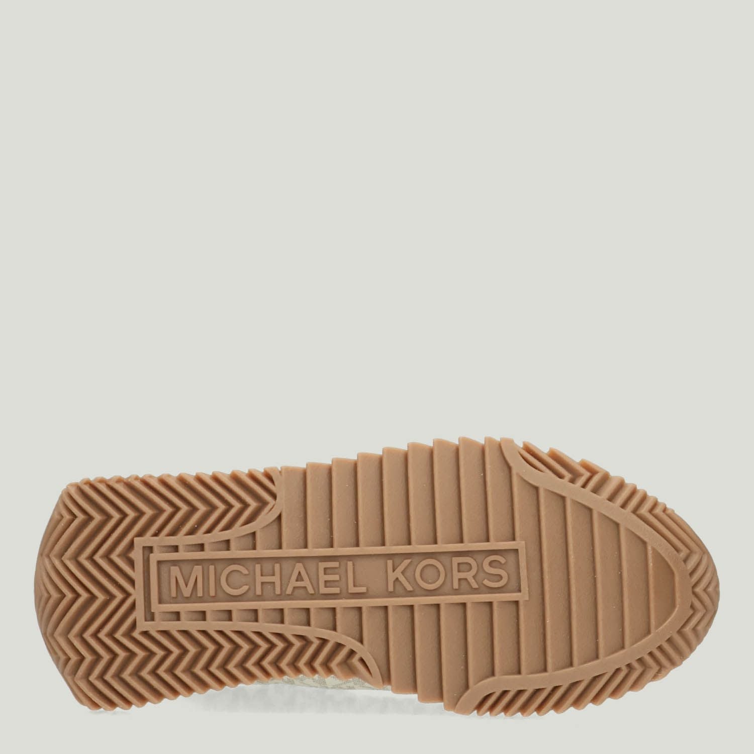 Sneakers with ivory leather toecap and ivory logoed faux leather. Fabric lining with non-removable insole. Gold laminated leather heel tab. Rubber sole with 3 cm wedge. Michael Kors collection.