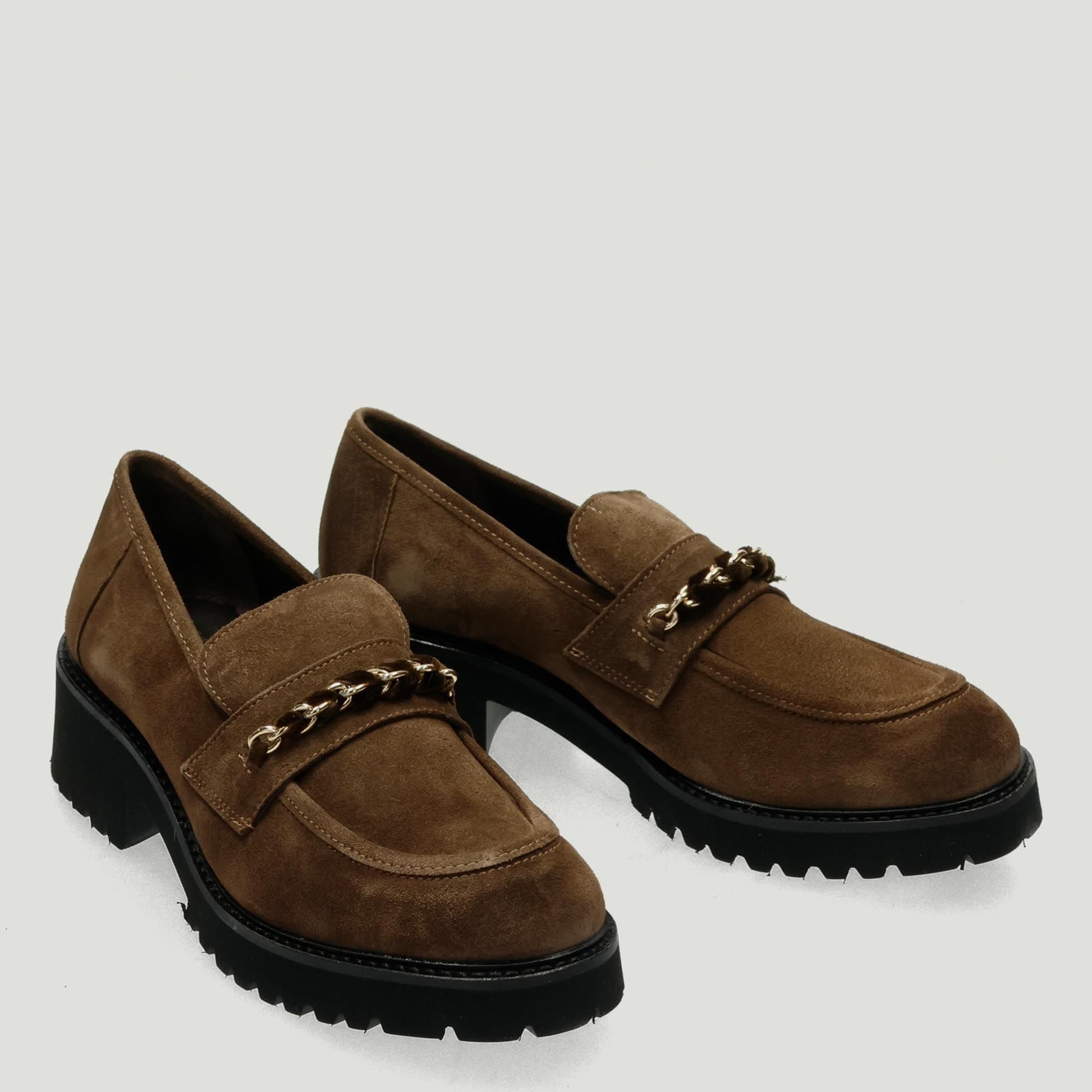 Brown suede loafers. Chain fastening. Leather lining with non-removable insole. Microporous rubber sole with 5 cm heel. Marco Venexia women's Fall/Winter collection.