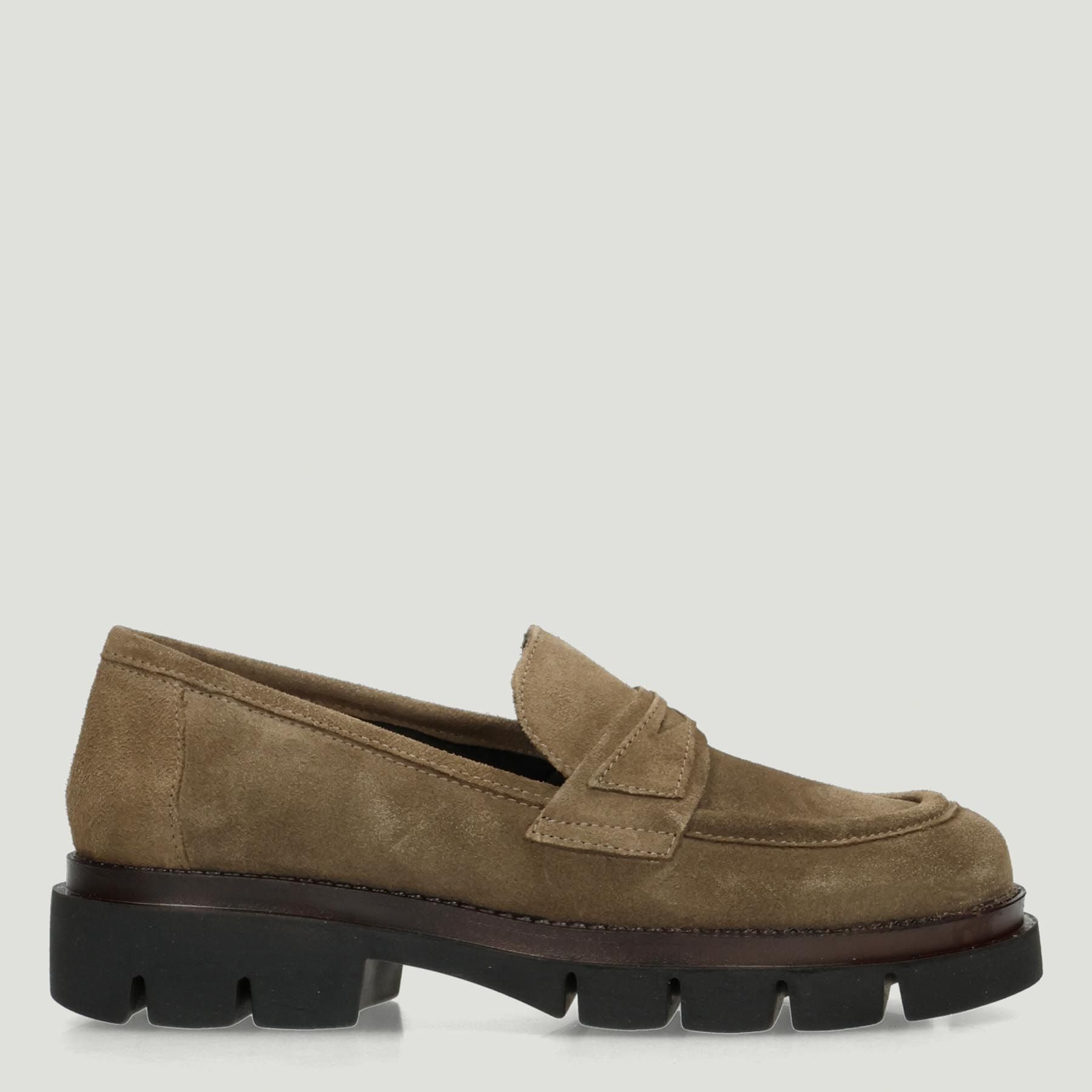 Grunland moccasins with taupe suede upper. Fabric lining with Re-Soft leather insole. Rubber sole with 4 cm heel. Grunland women's Fall/Winter collection.
