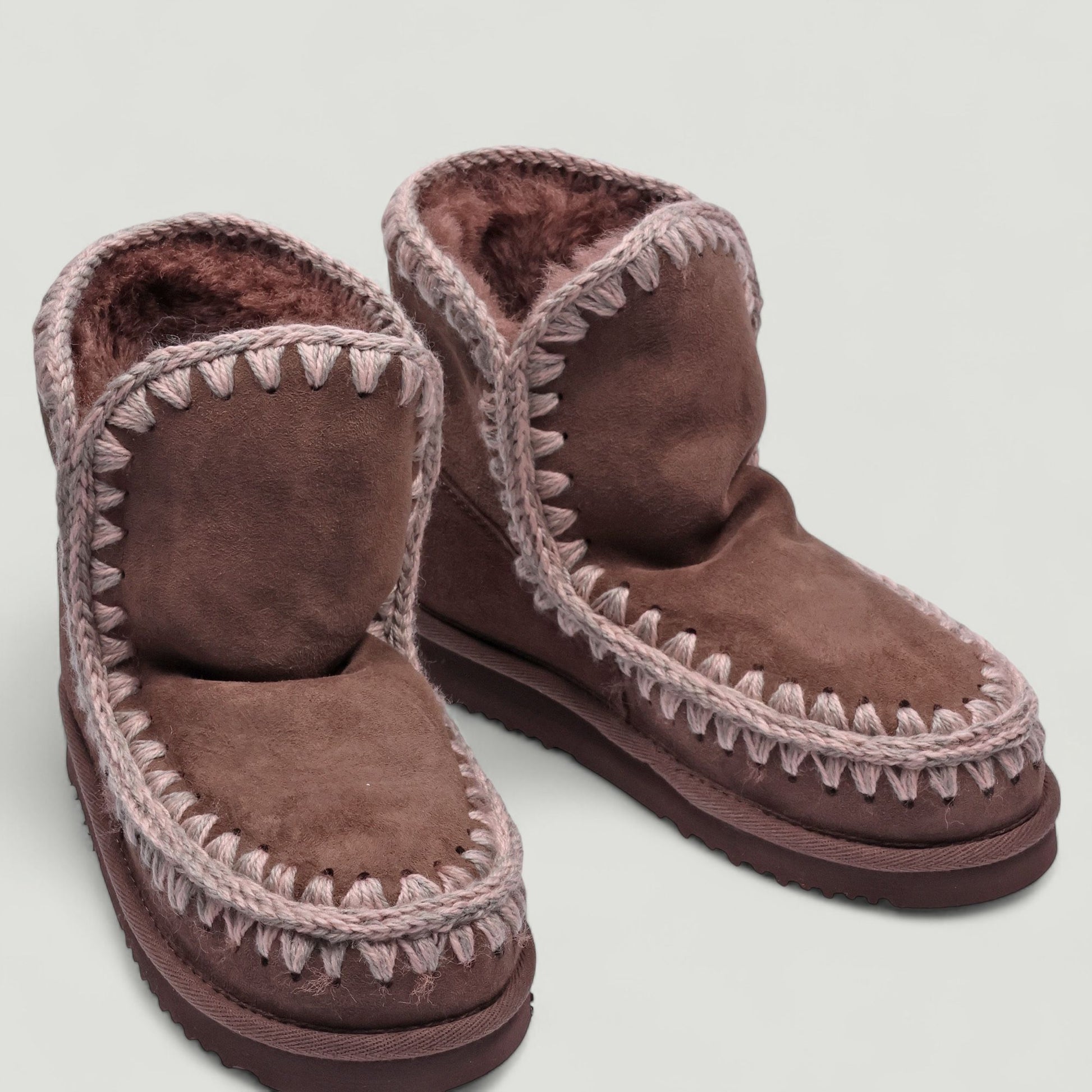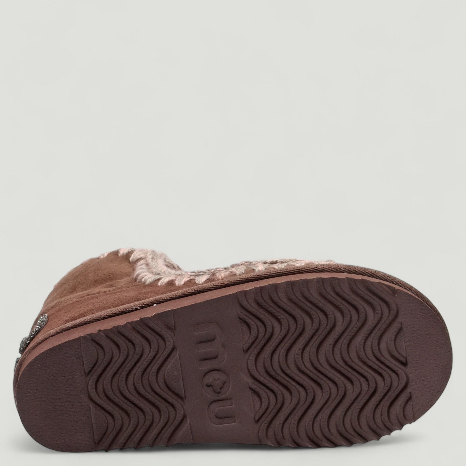 Mou Eskimo18 with brown suede upper. Contrasting melange wool stitching. Glittery metal logo. Genuine sheepskin lining. 3 cm rubber sole. Mou women's Fall/Winter collection.