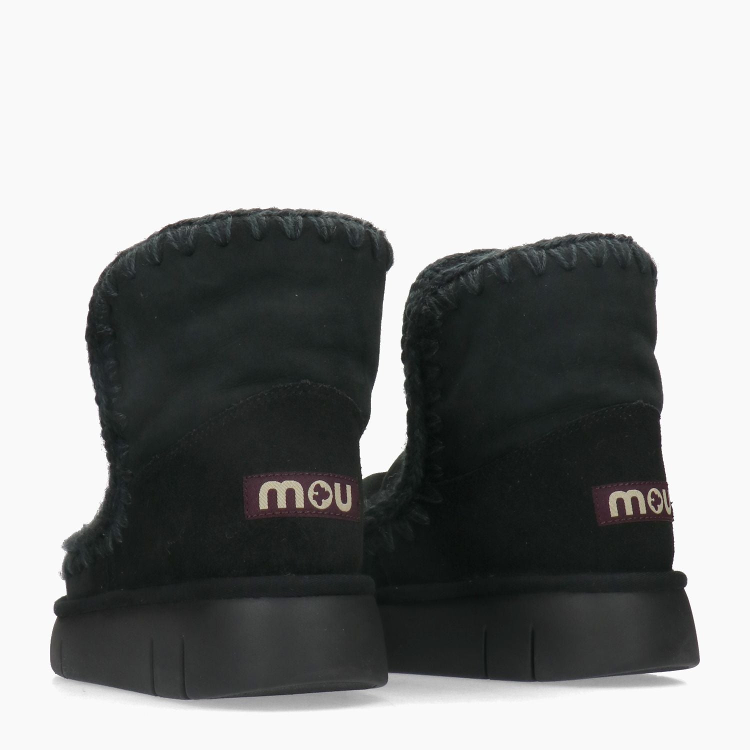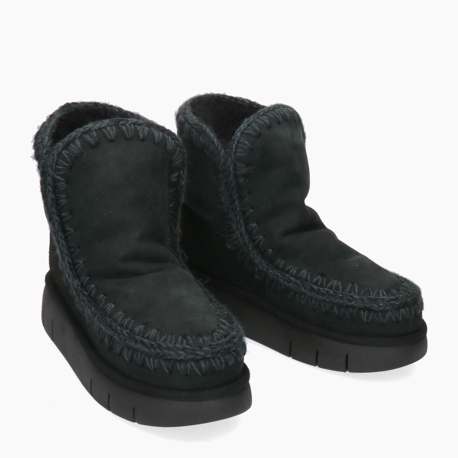 Mou Eskimo 18 Bounce model with black suede upper. Matching melange wool stitching. Round toe. Fabric logo on the heel. Real fur lining. Rubber sole. Mou women's Fall/Winter collection.