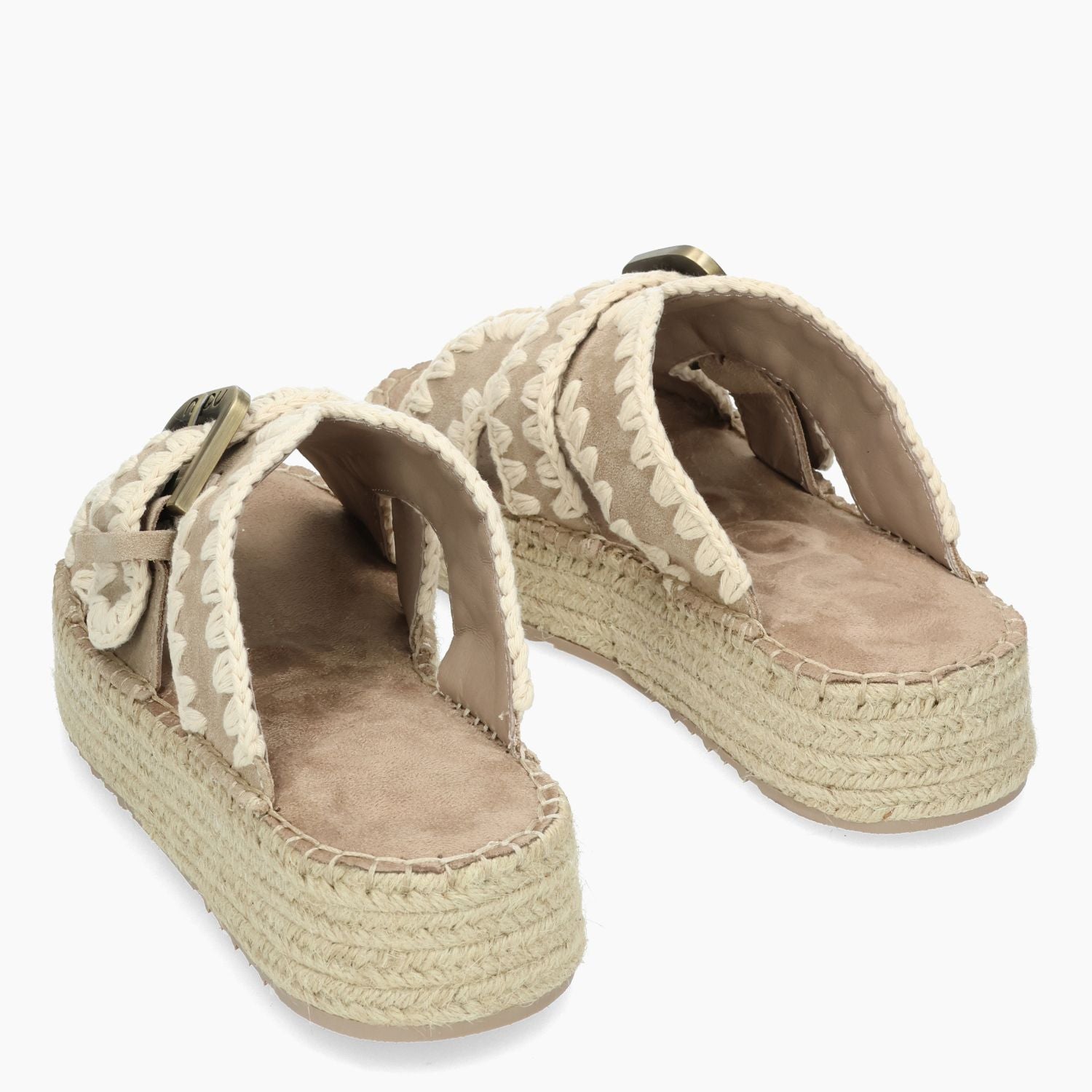 Dove gray suede slipper with ivory crochet embroidery. Brass-plated metal logo buckle. Leather lining with microfiber insole. 4 cm thick braided rubber sole. Mou women's spring/summer collection.
