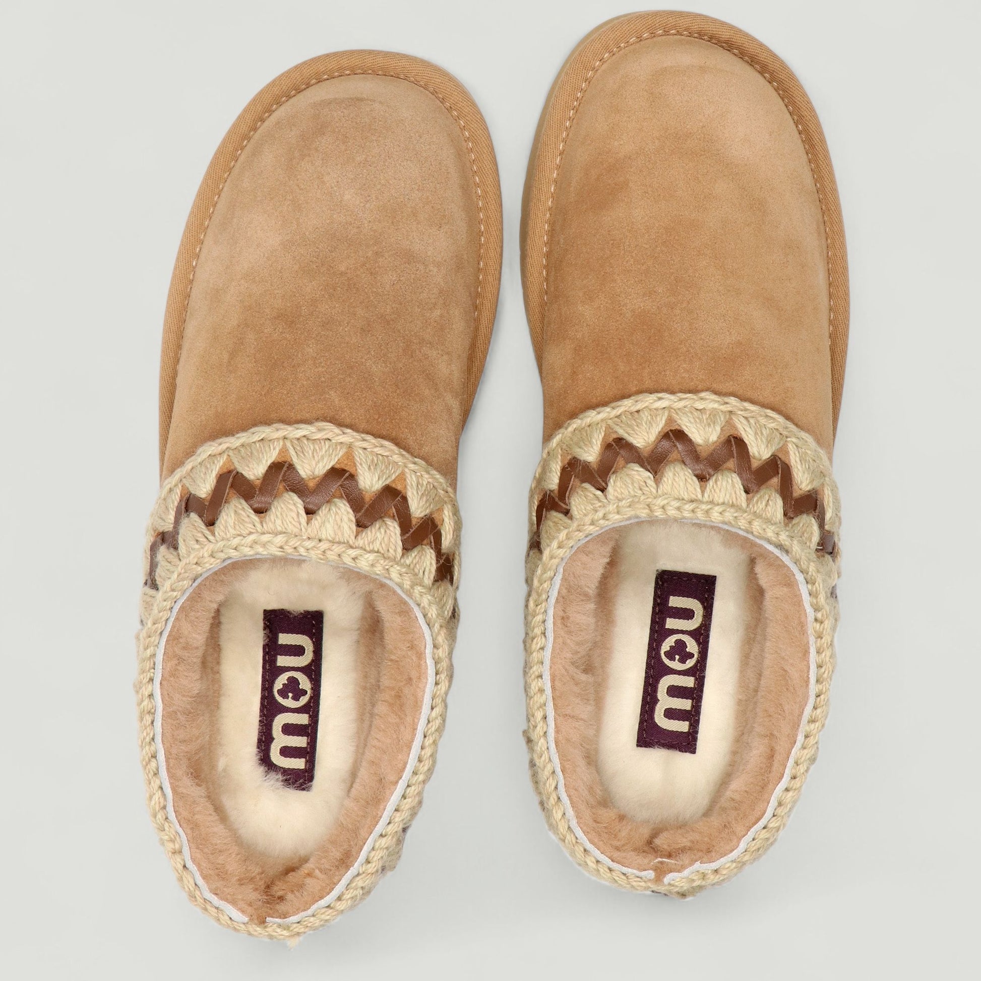 Clogs with honey-colored suede upper. Traditional melange wool stitching and brown leather trim. Sheepskin lining. Rubber sole with 5 cm platform. Mou women's Fall/Winter collection.