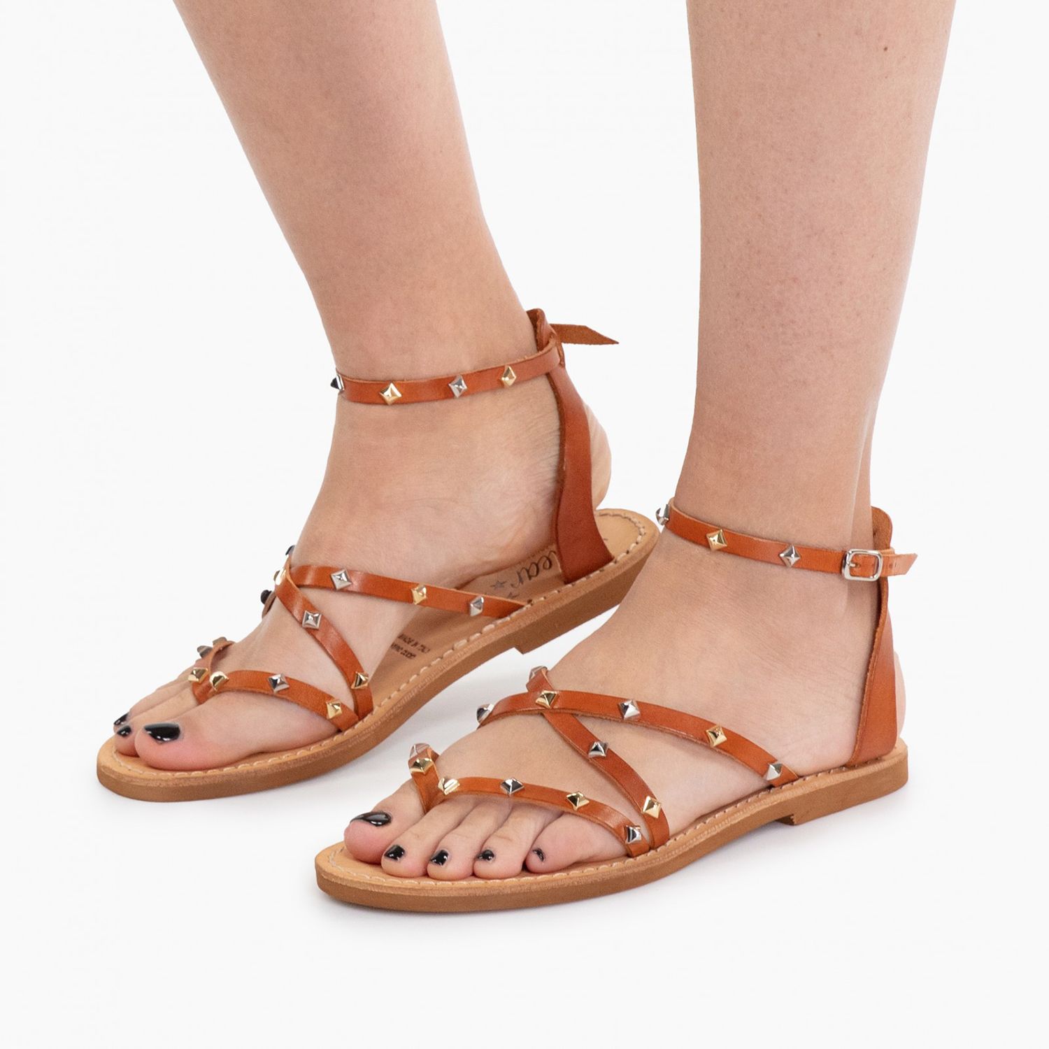 Leather flip-flop sandals with studs, 10 cm heel, rubber sole.