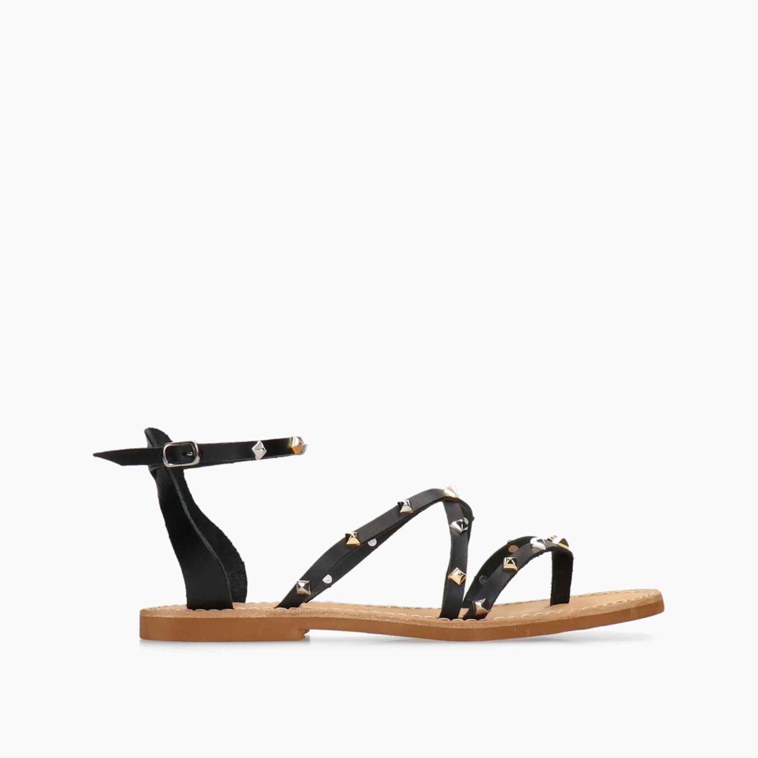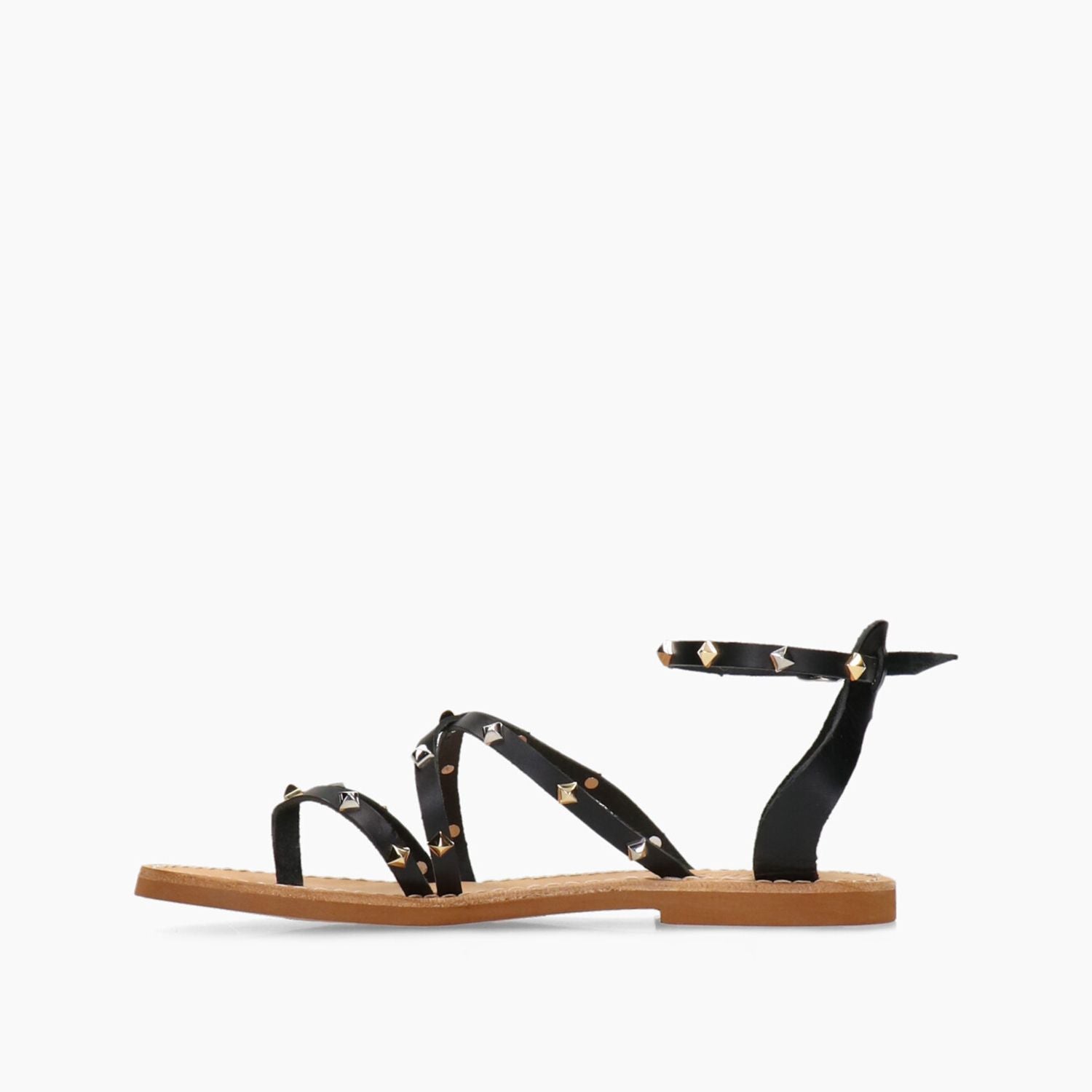 Black leather flip-flop sandals with studs, 10 cm heel, rubber sole.