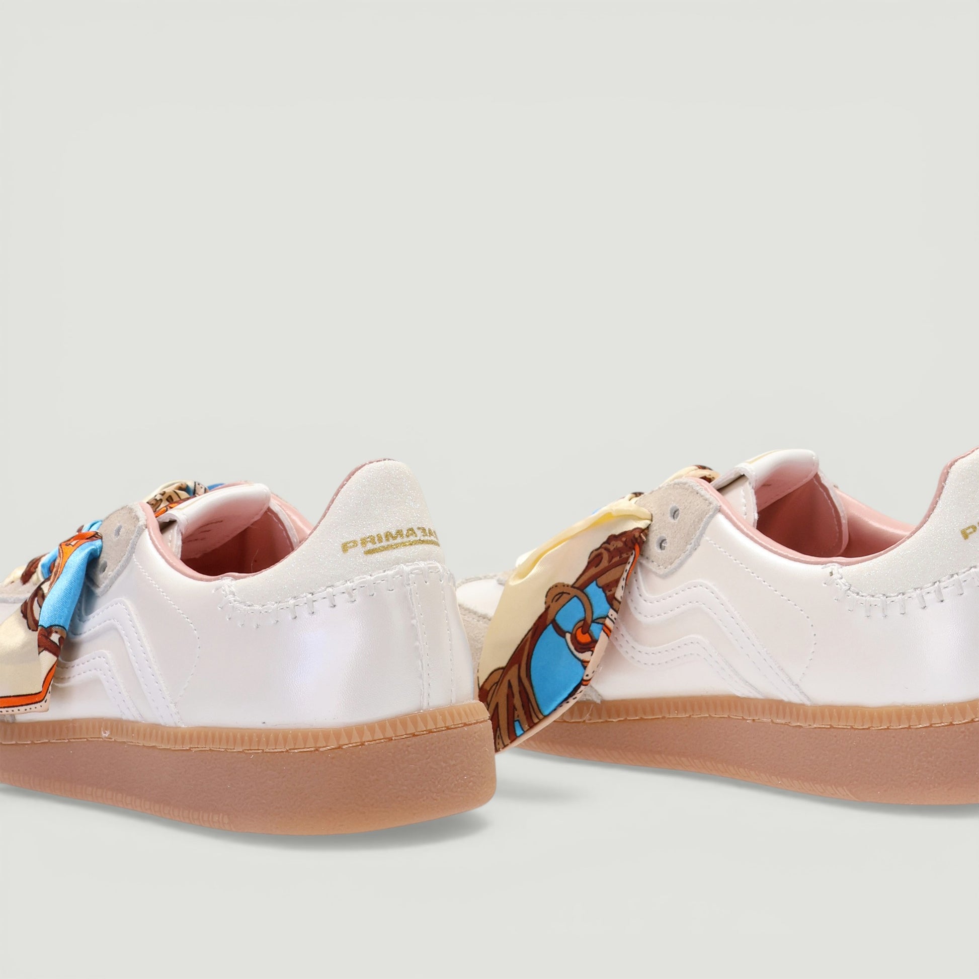 Sneakers in ecopelle color avorio perlato con riporti in camoscio beige. Stripe laterale in pelle bianca. Chiusura tramite foulard fantasia. E' disponibile nella confezione un laccio sostitutivo in cotone ed un foulard fantasia. Interno in tessuto con sottopiede estraibile. Suola in gomma in color mastice. Collezione donna Prima Base.