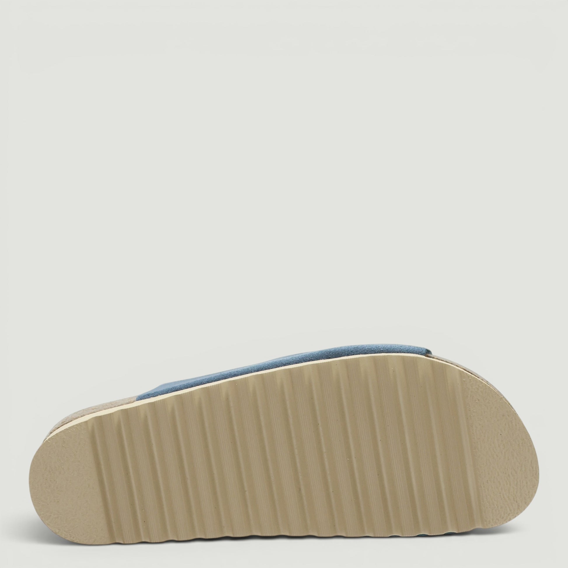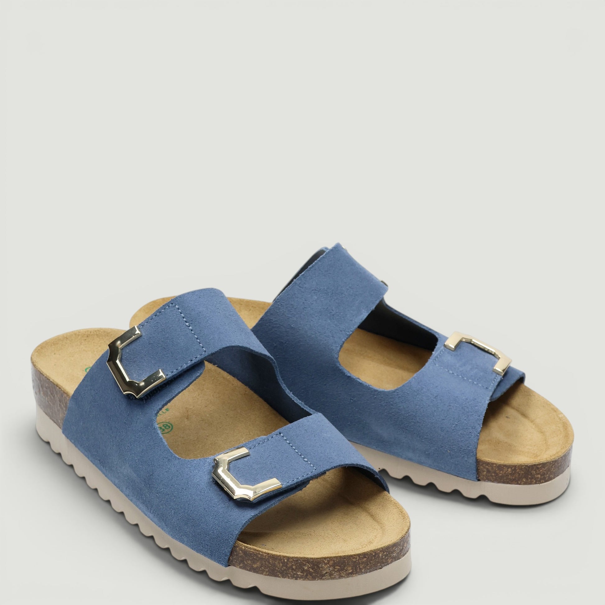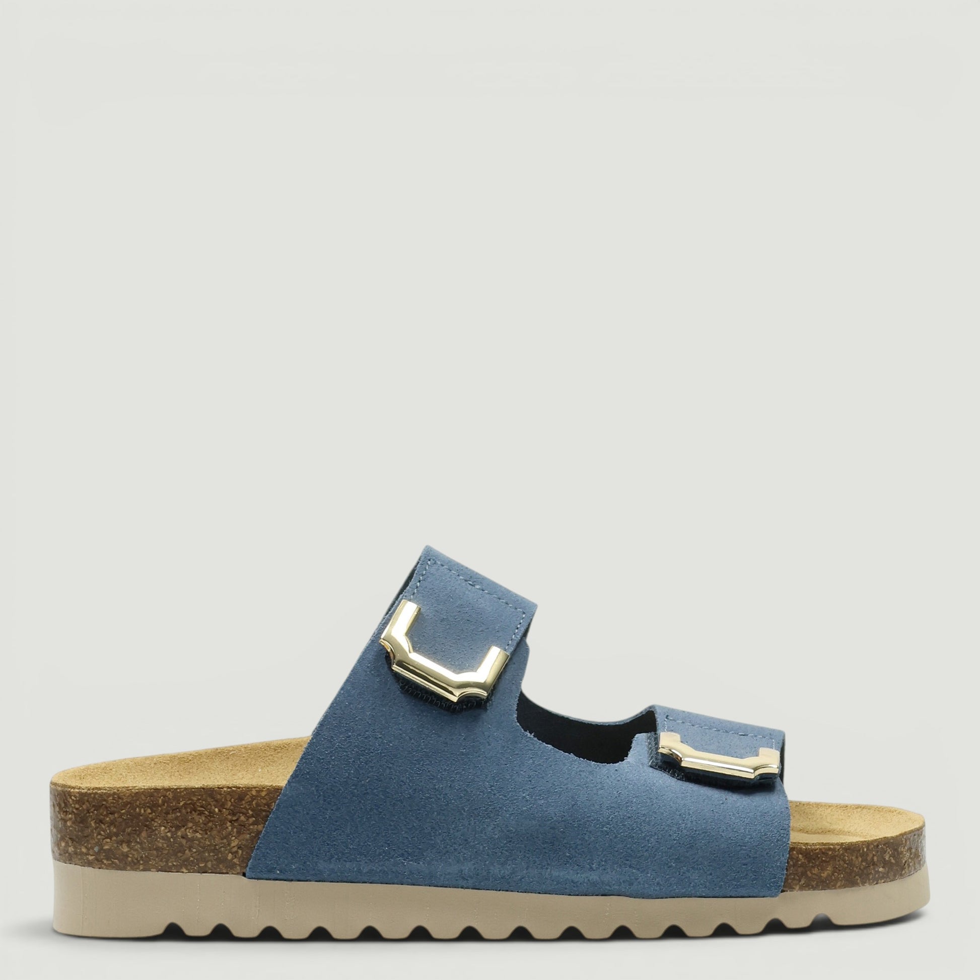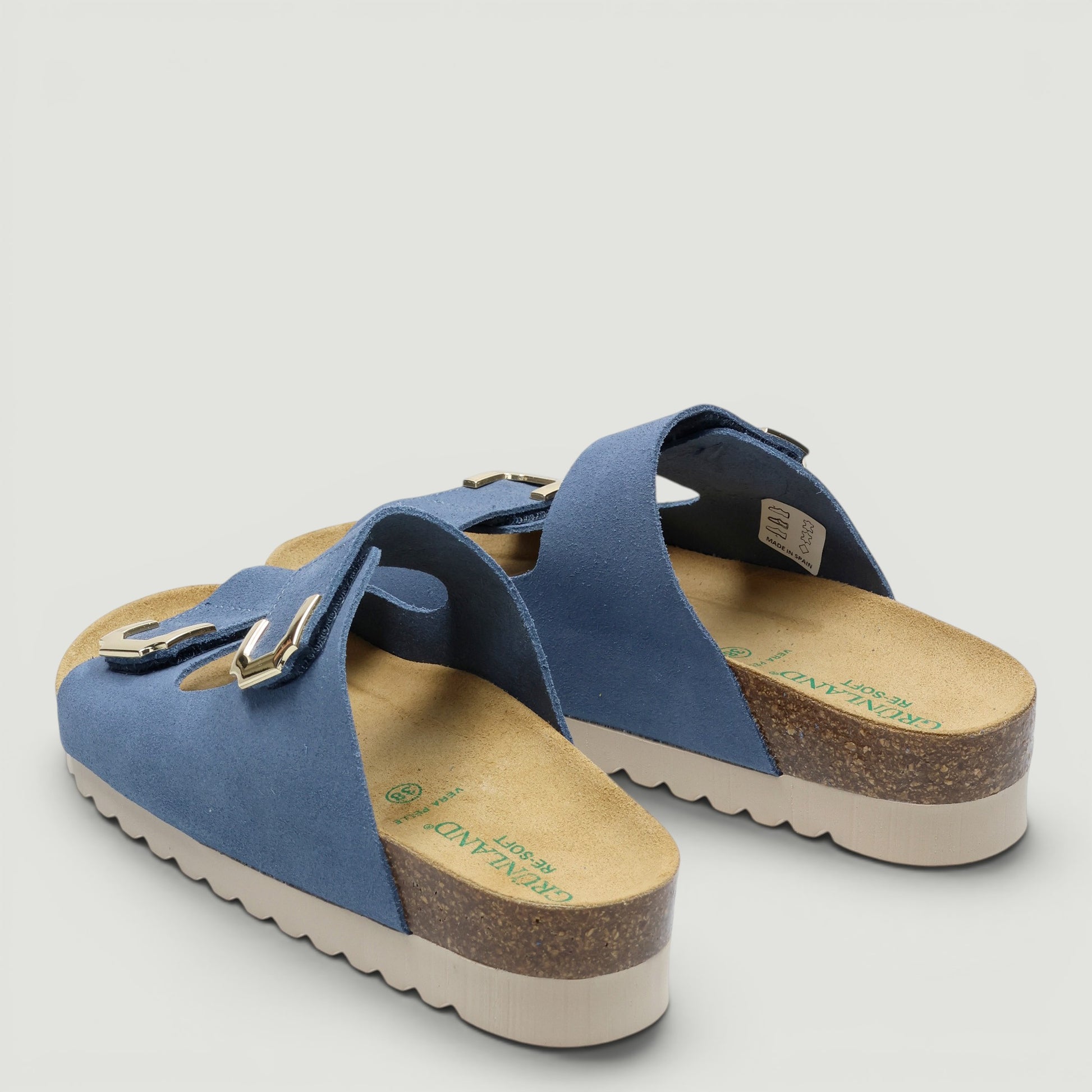 Ciabatta Grunland con tomaia in pelle scamosciata blu jeans. Chiusura con doppio velcro in metallo dorato. Interno in pelle con sottopiede in pelle Re-Soft imbottito. Suola in gomma con zeppa di 3 cm. Collezione Grunland donna Primavera/Estate.