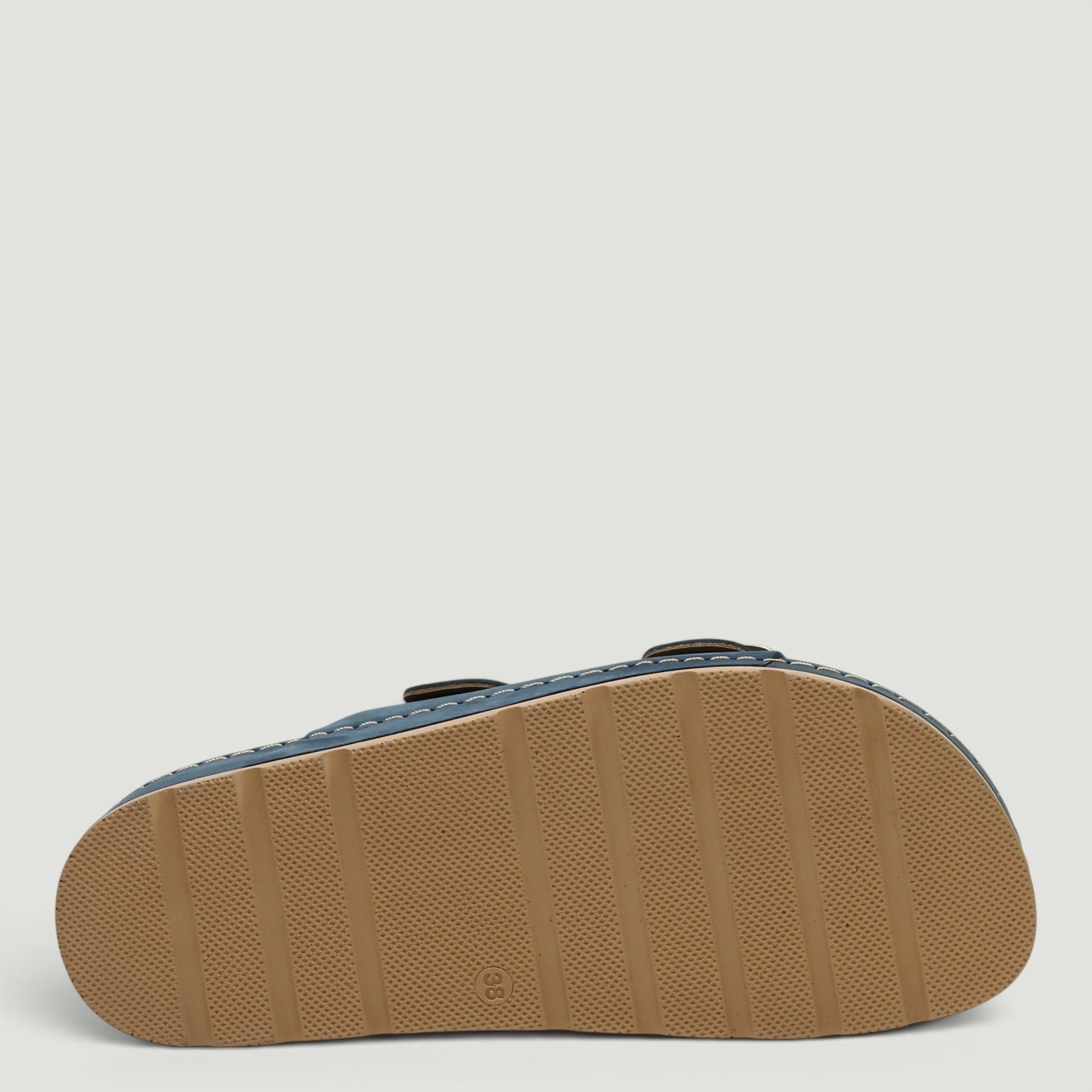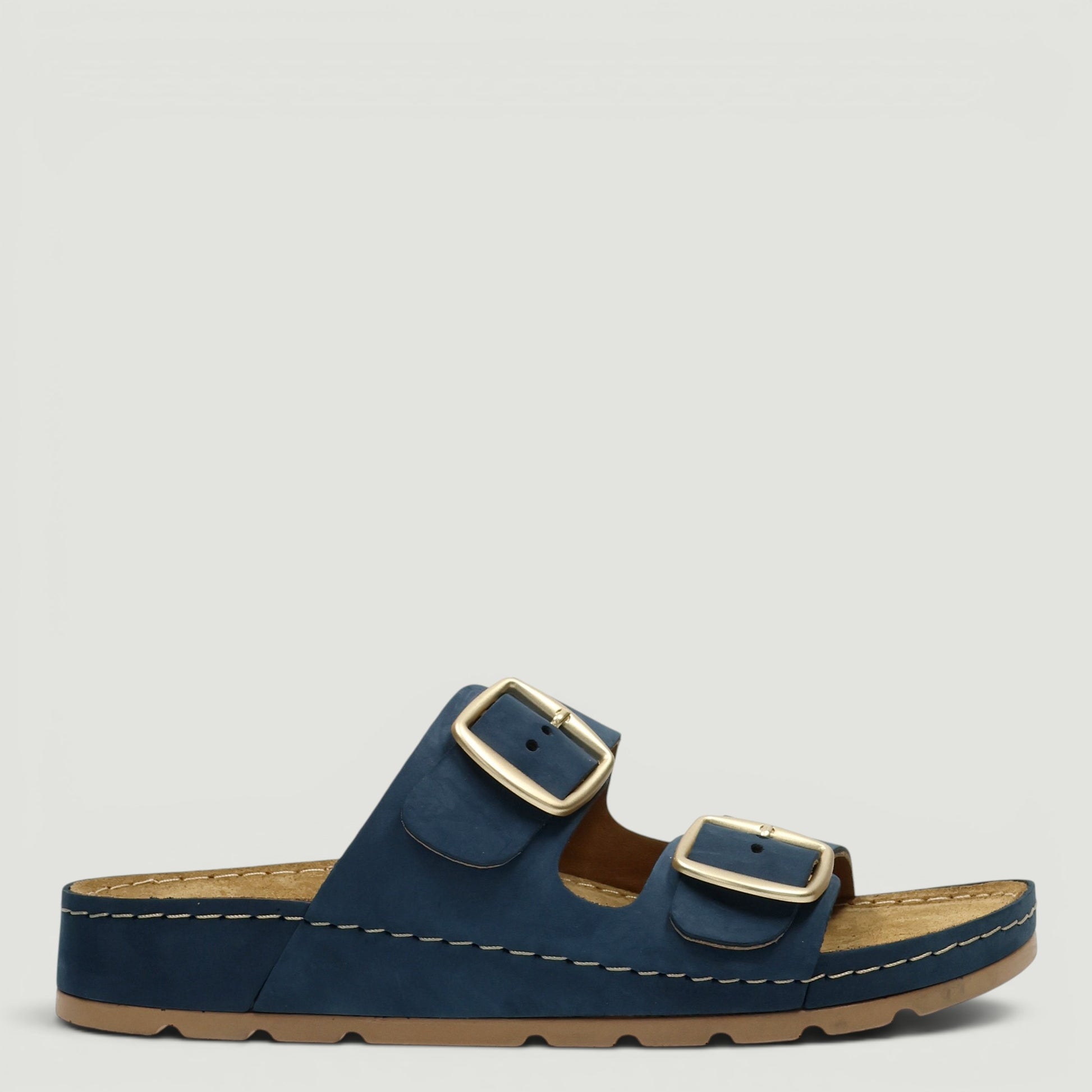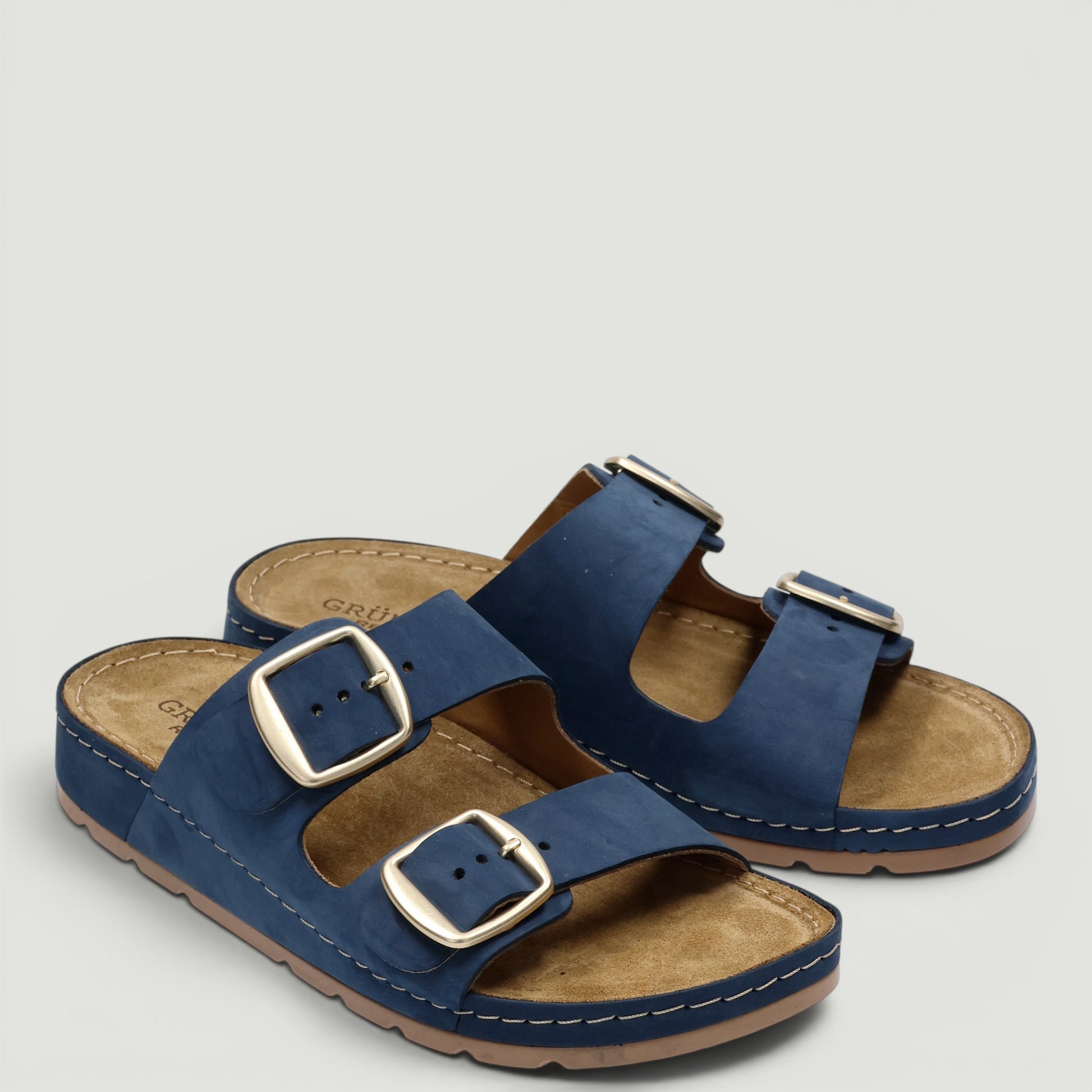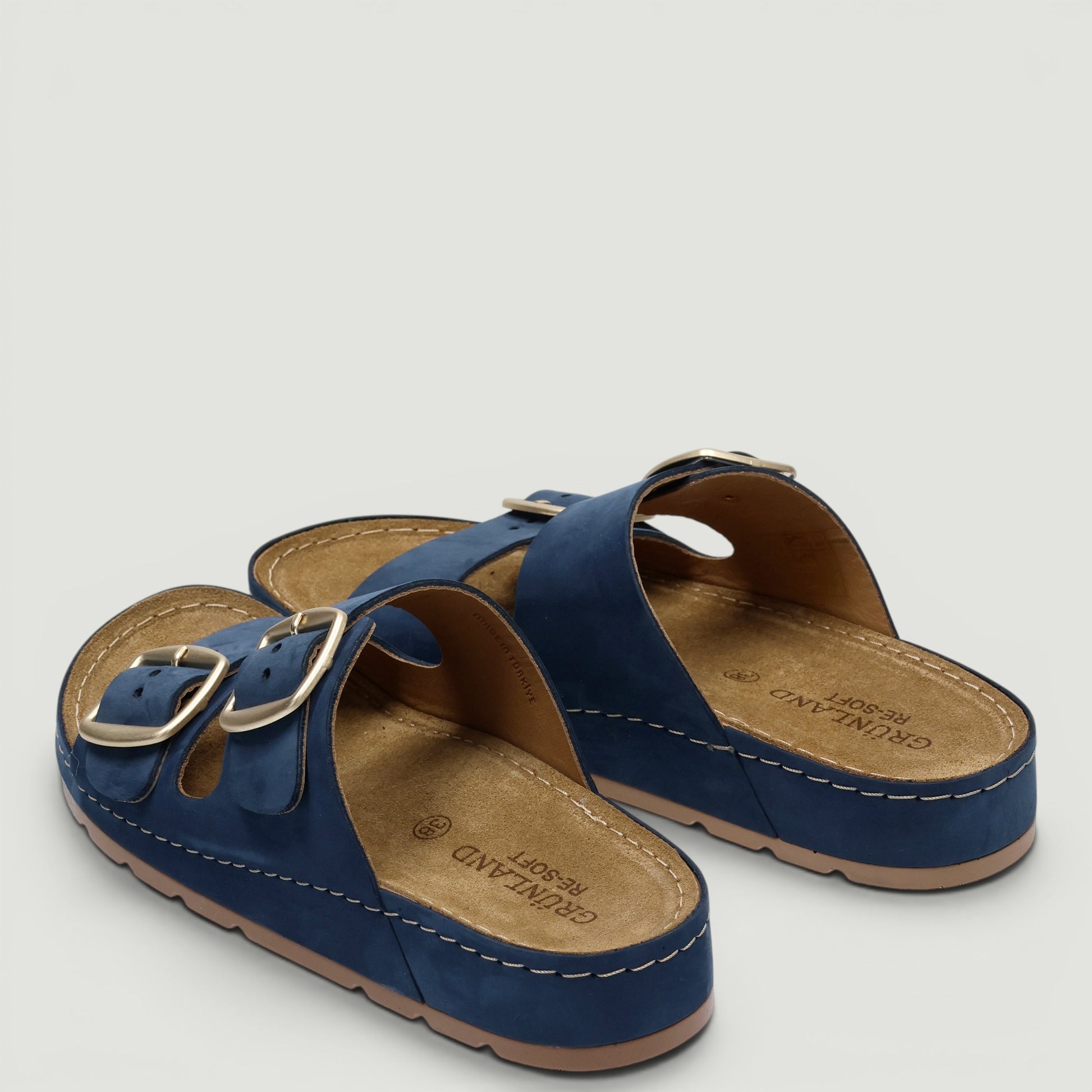 Ciabatta in pelle in colore blu con doppia fibbia satinata dorata. Interno in pelle con sottopiede in pelle Re-Soft imbottito. Suola in gomma con zeppa di 3 cm. Collezione Grunland donna Primavera/Estate.