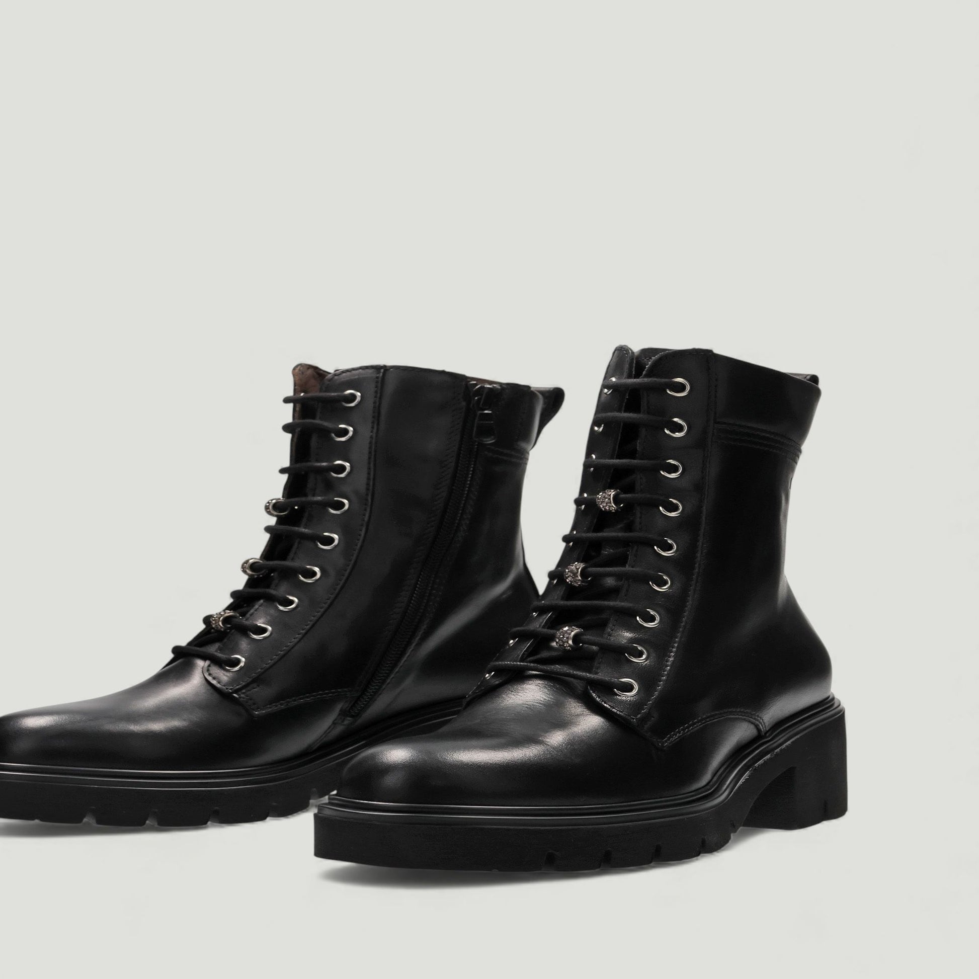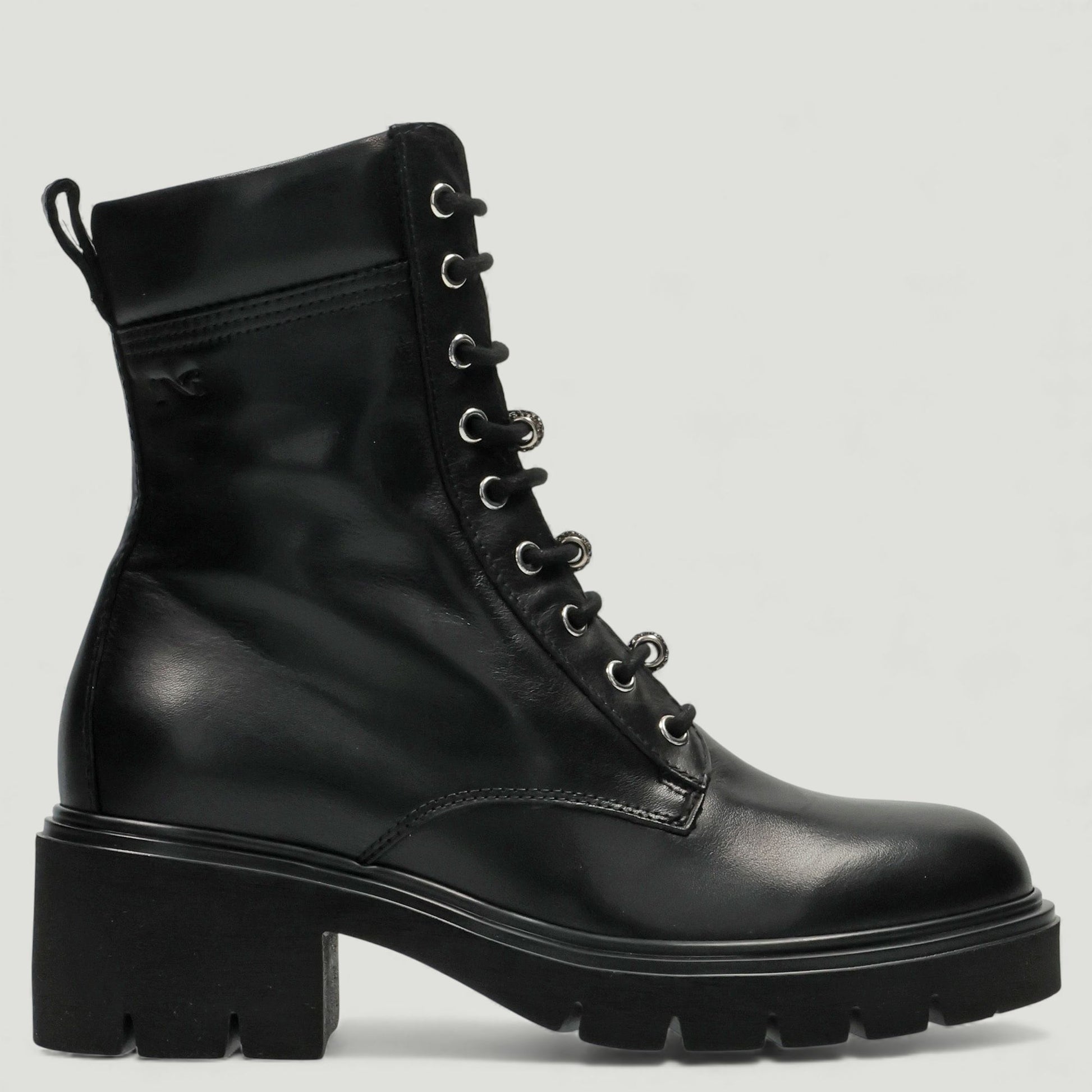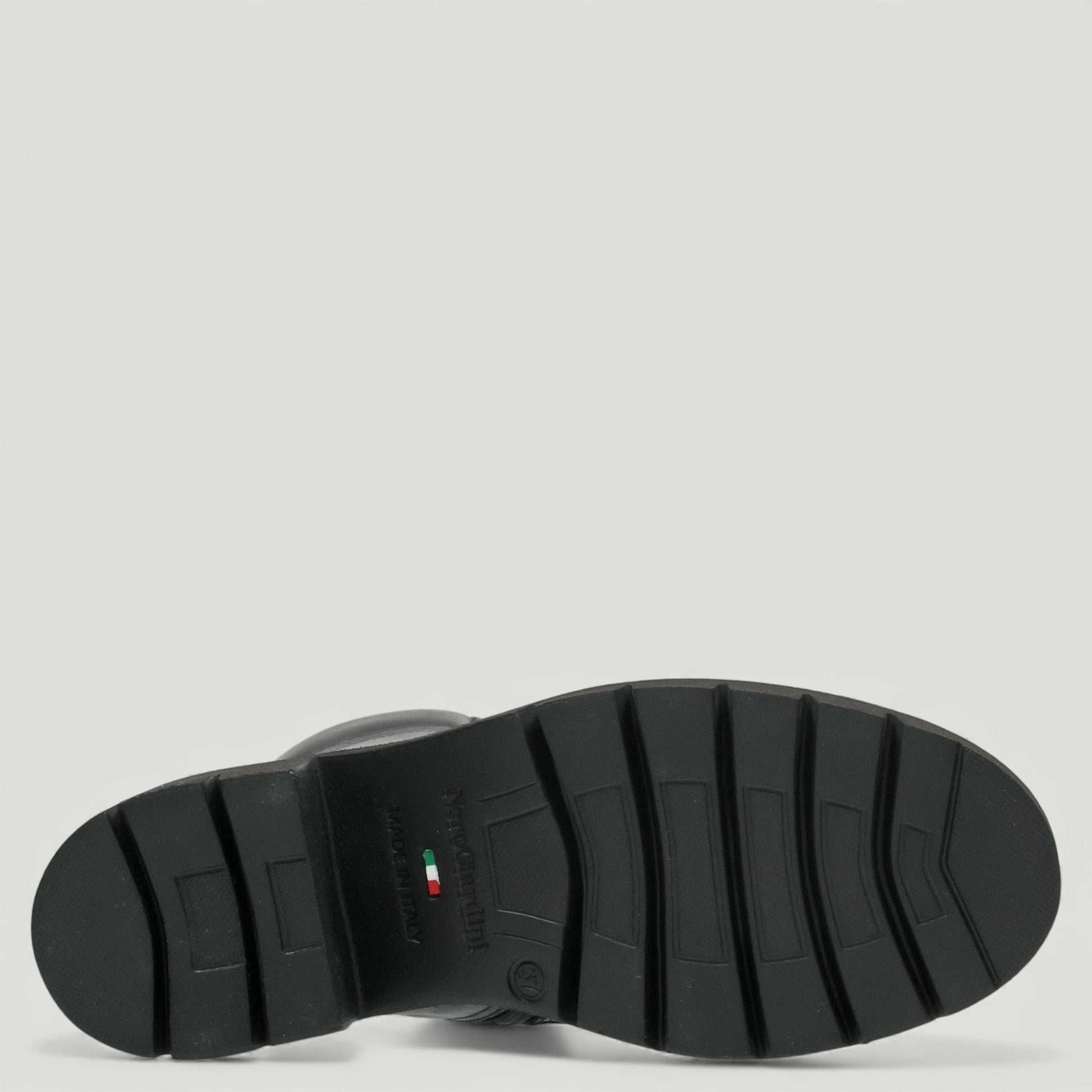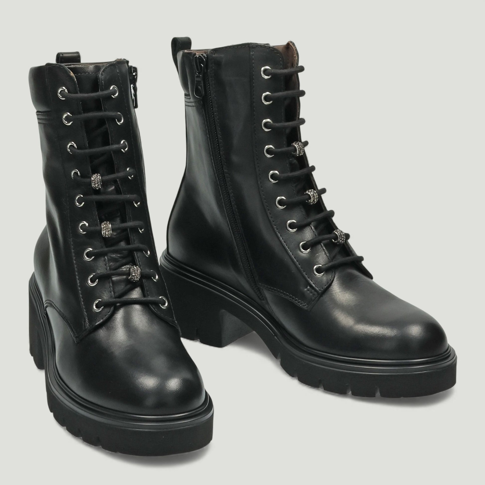 Black leather combat boots. Lace-up and side zip closure. Rhinestone loops on the laces. Leather lining with removable memory foam insole. Rubber sole with 5 cm heel. Nero Giardini women's fall/winter collection.