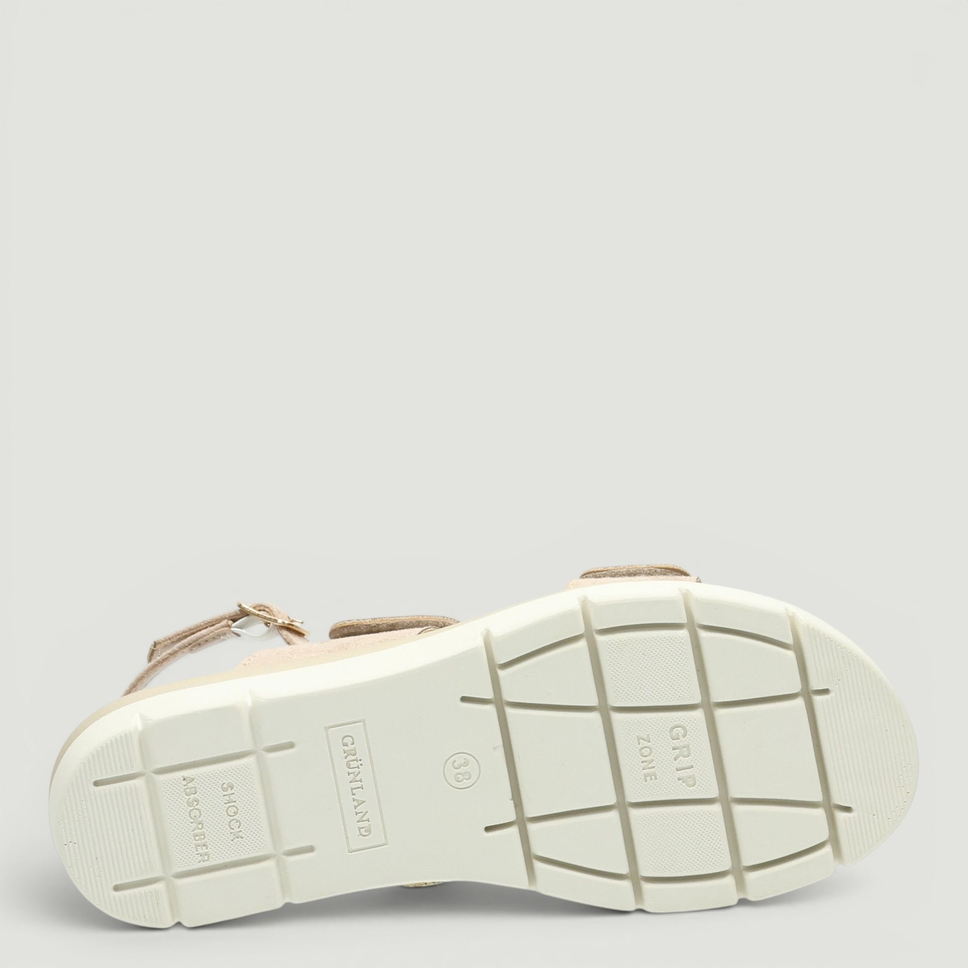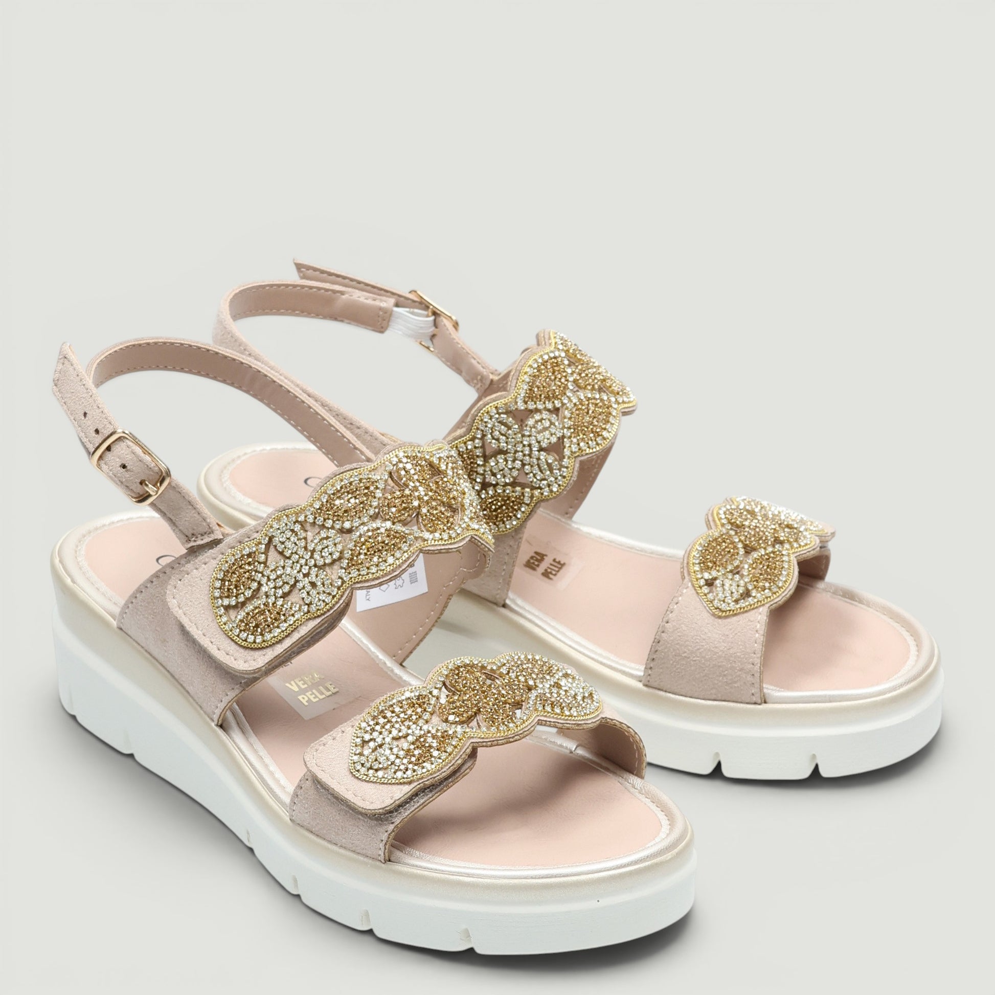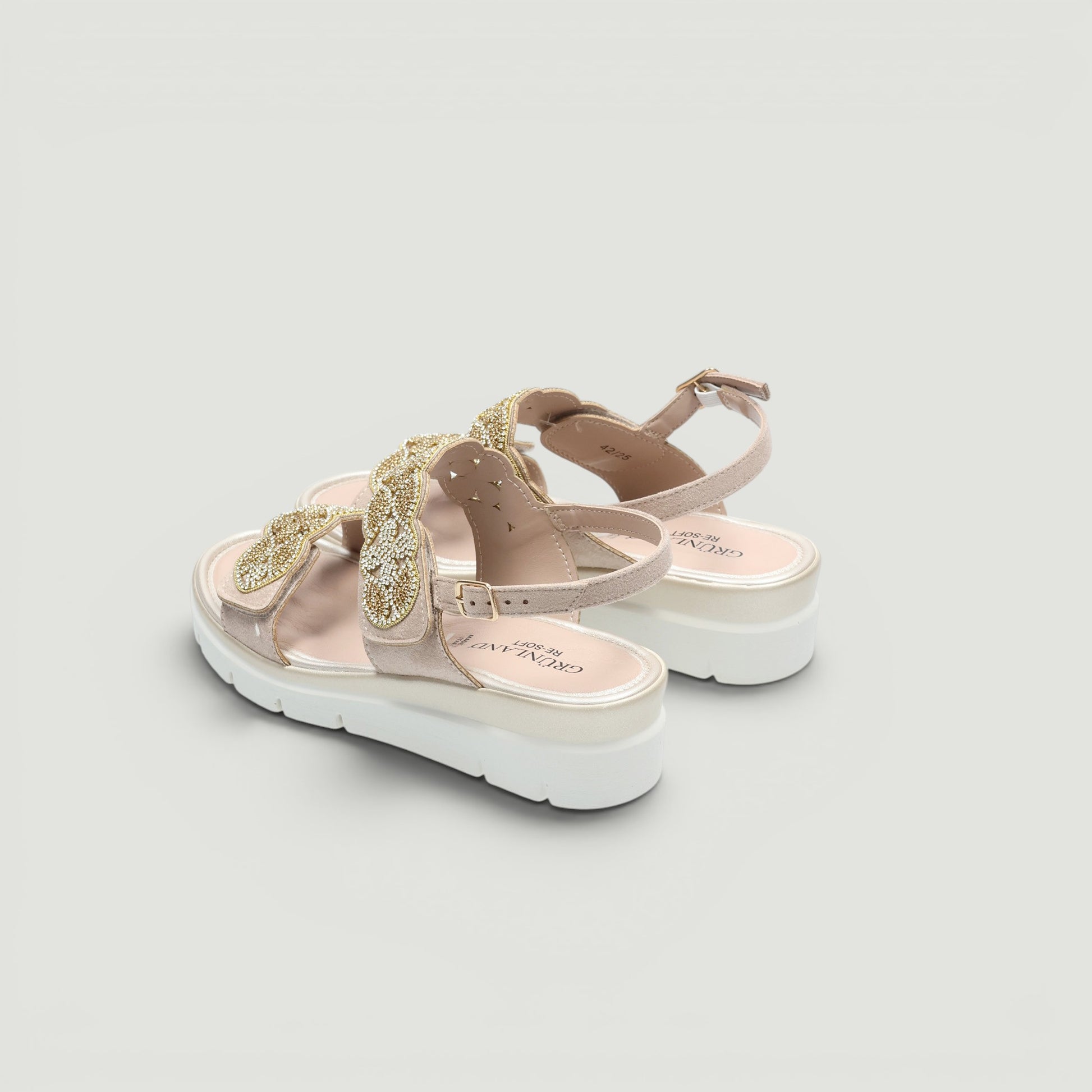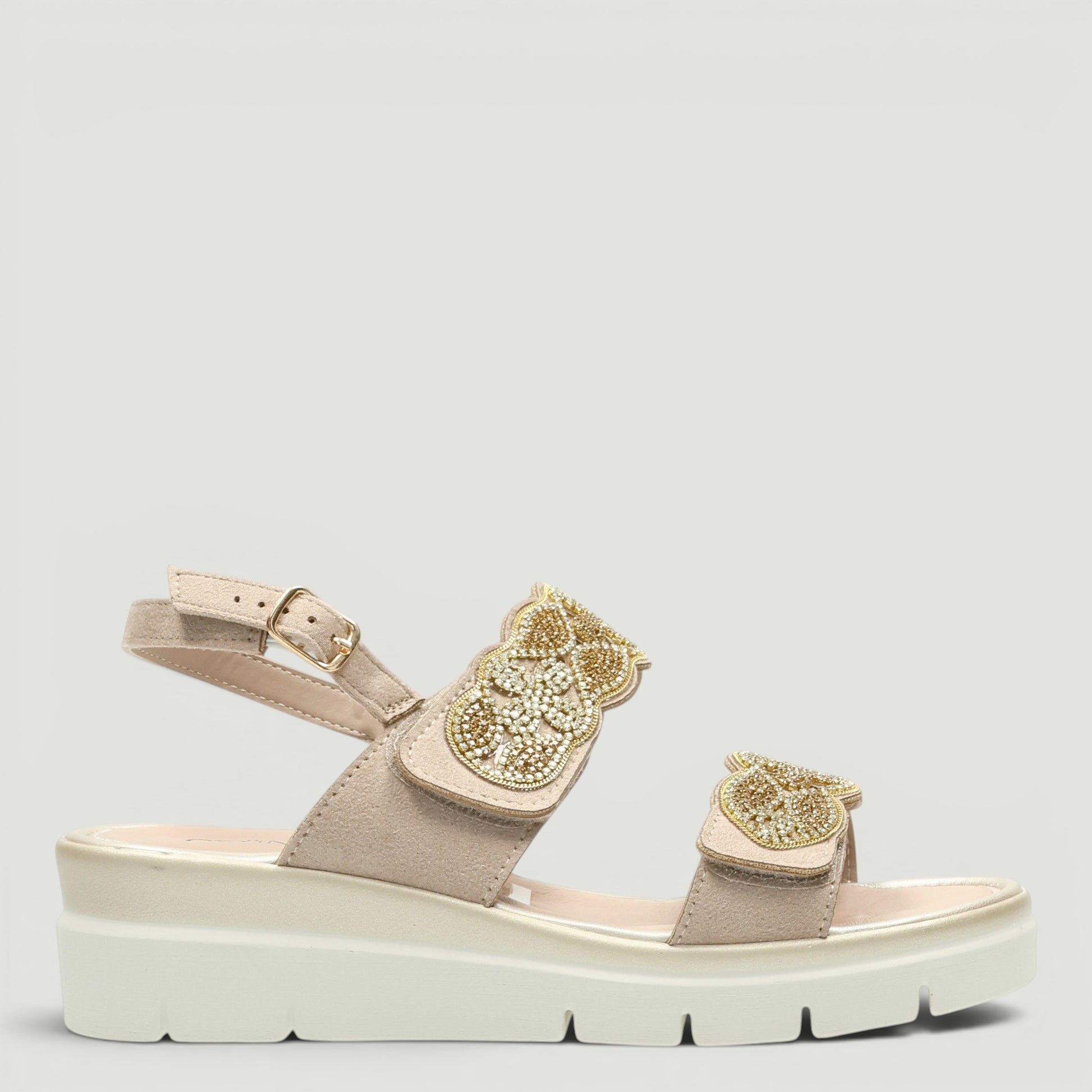 Ciabatte in alcantara beige con doppio velcro di strass. Cinturino posteriore regolabile. Sottopiede Re-Soft in pelle imbottito. Zeppa in gomma di 4,5 cm. Collezione Grunland donna Primavera/Estate.