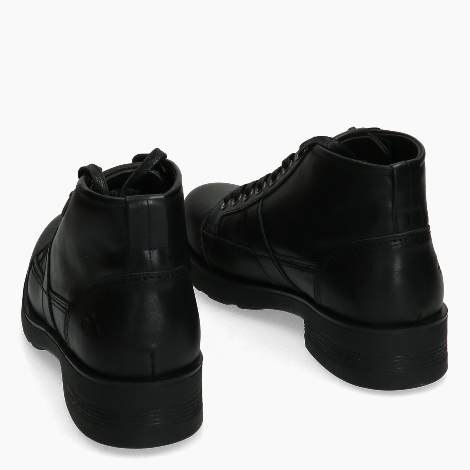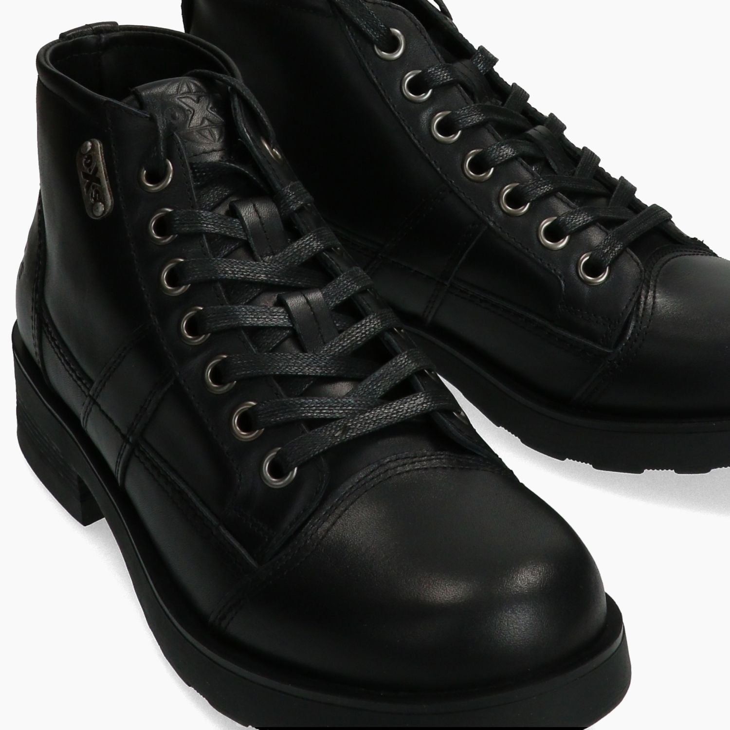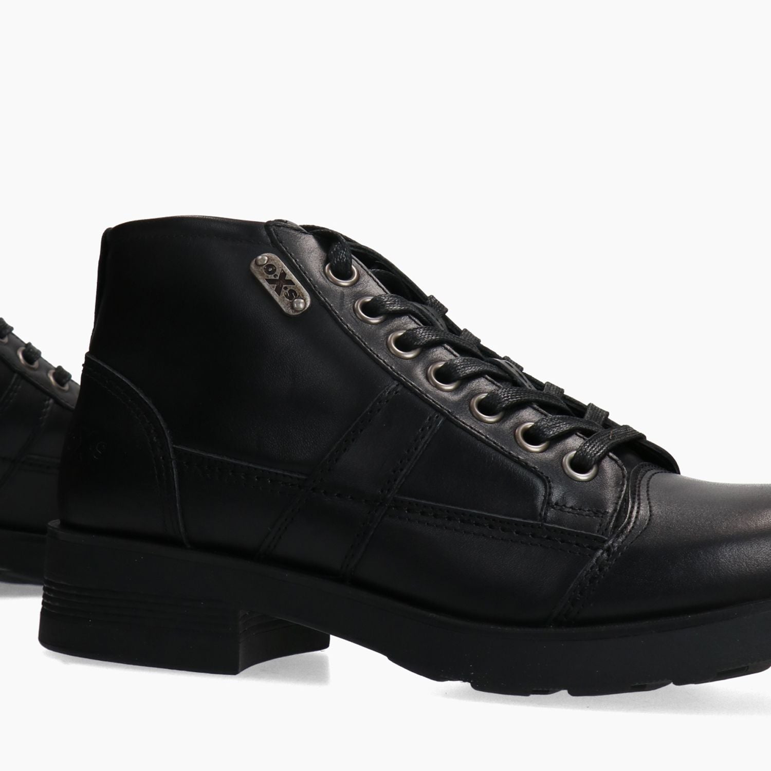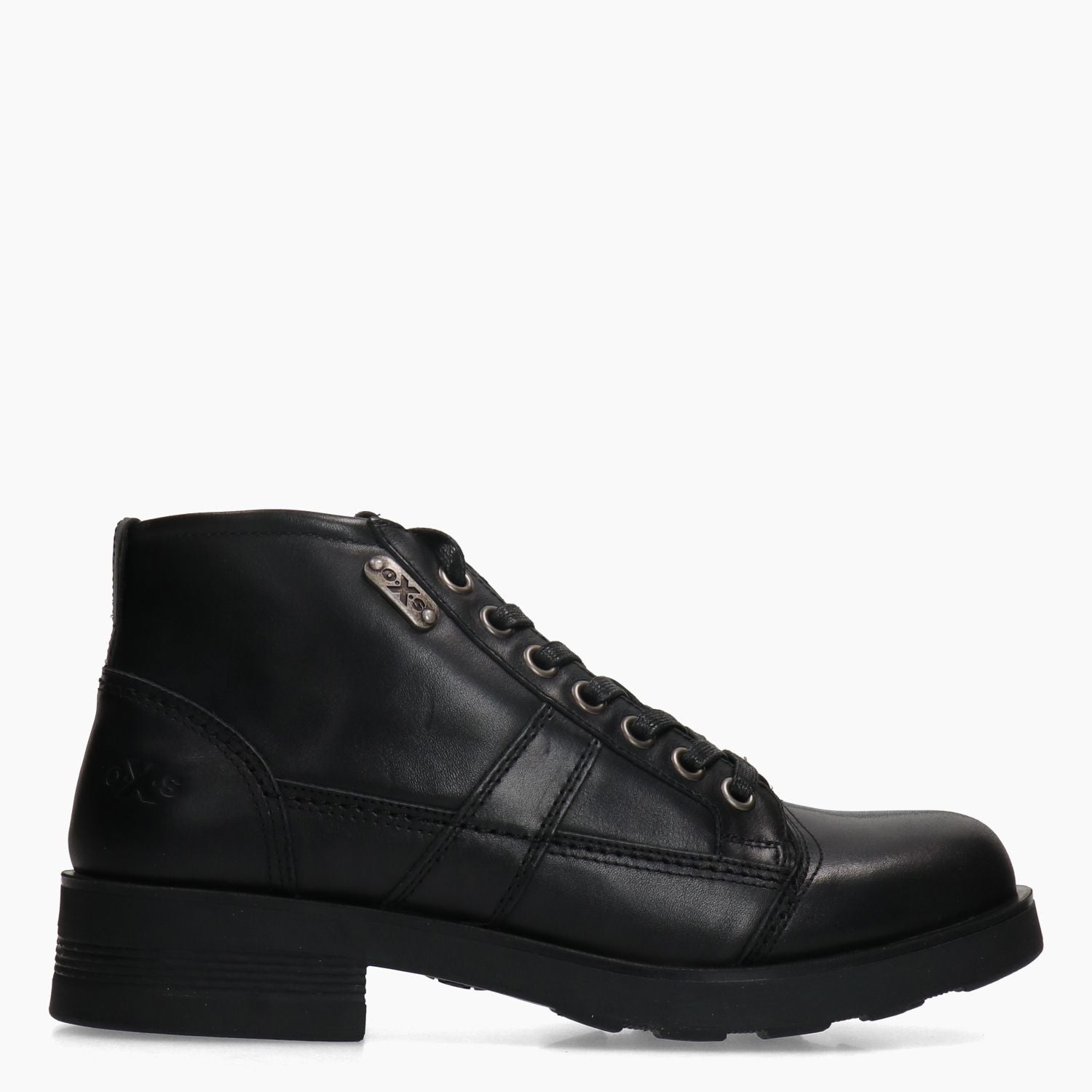 Black leather combat boot. Distinctive metal logo on the side. Black lace-up closure with metal eyelets. Leather and fabric lining with removable insole. Rubber sole with 4 cm heel. Oxs men's Fall/Winter collection.
