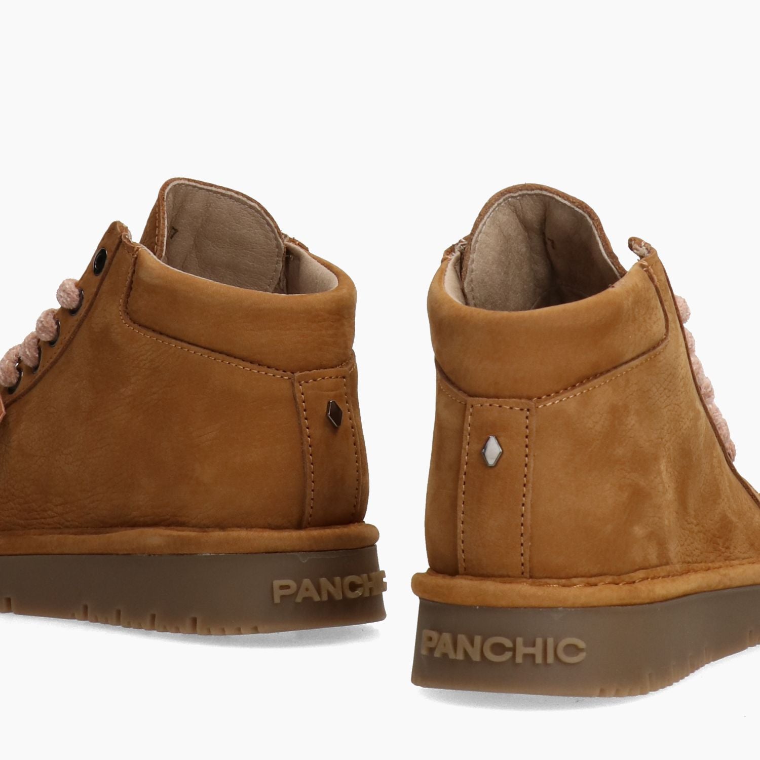 Honey nubuck ankle boot. Tone-tone melange chenille laces. Replacement light brown waxed cotton laces. Faux leather lining. Removable insole. 3 cm grey rubber sole. Panchic women's Fall/Winter collection.