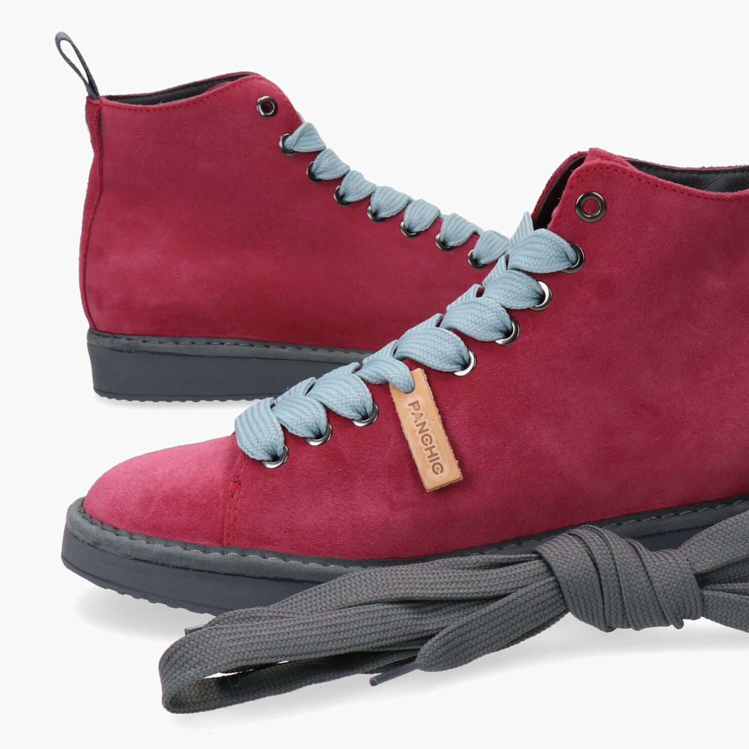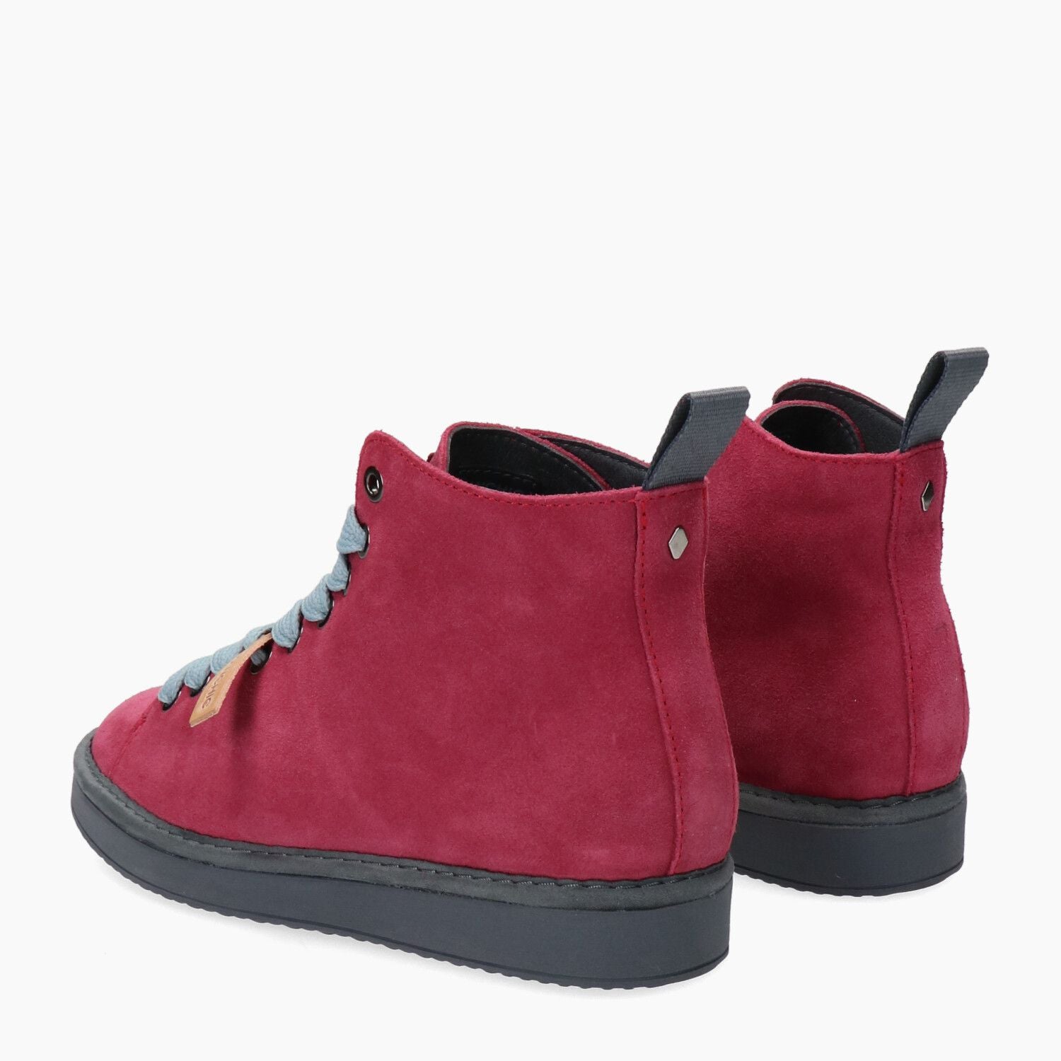 Cherry suede ankle boots with blue laces, laces included, rubber sole.