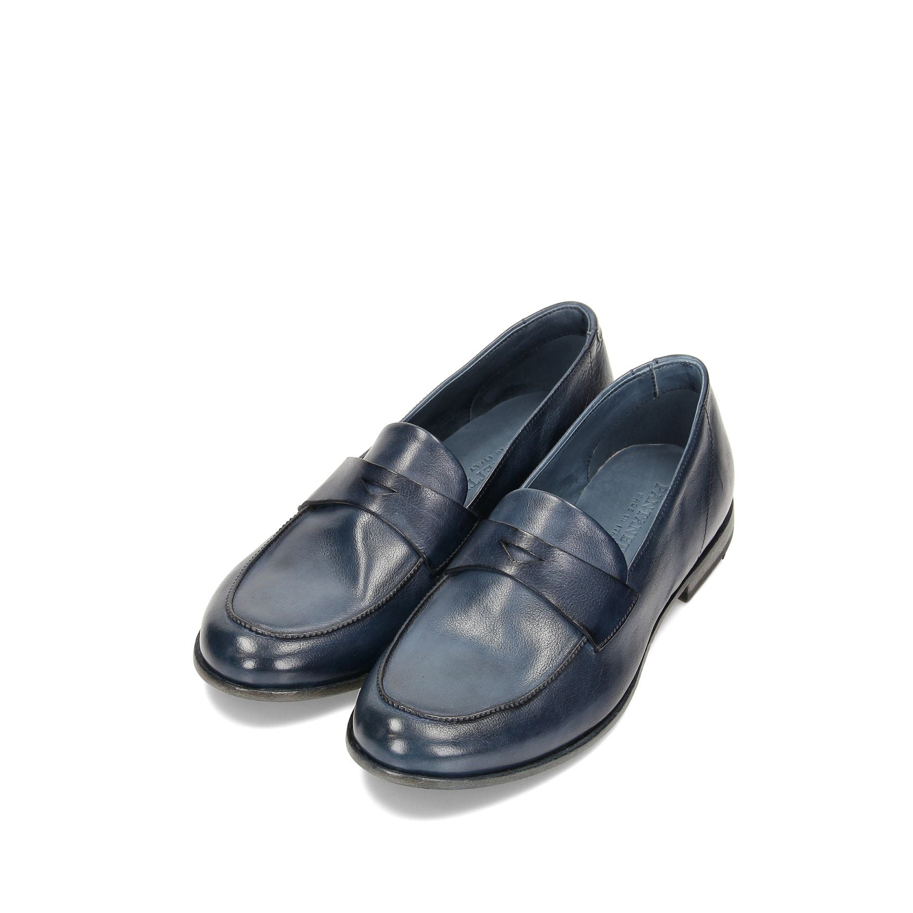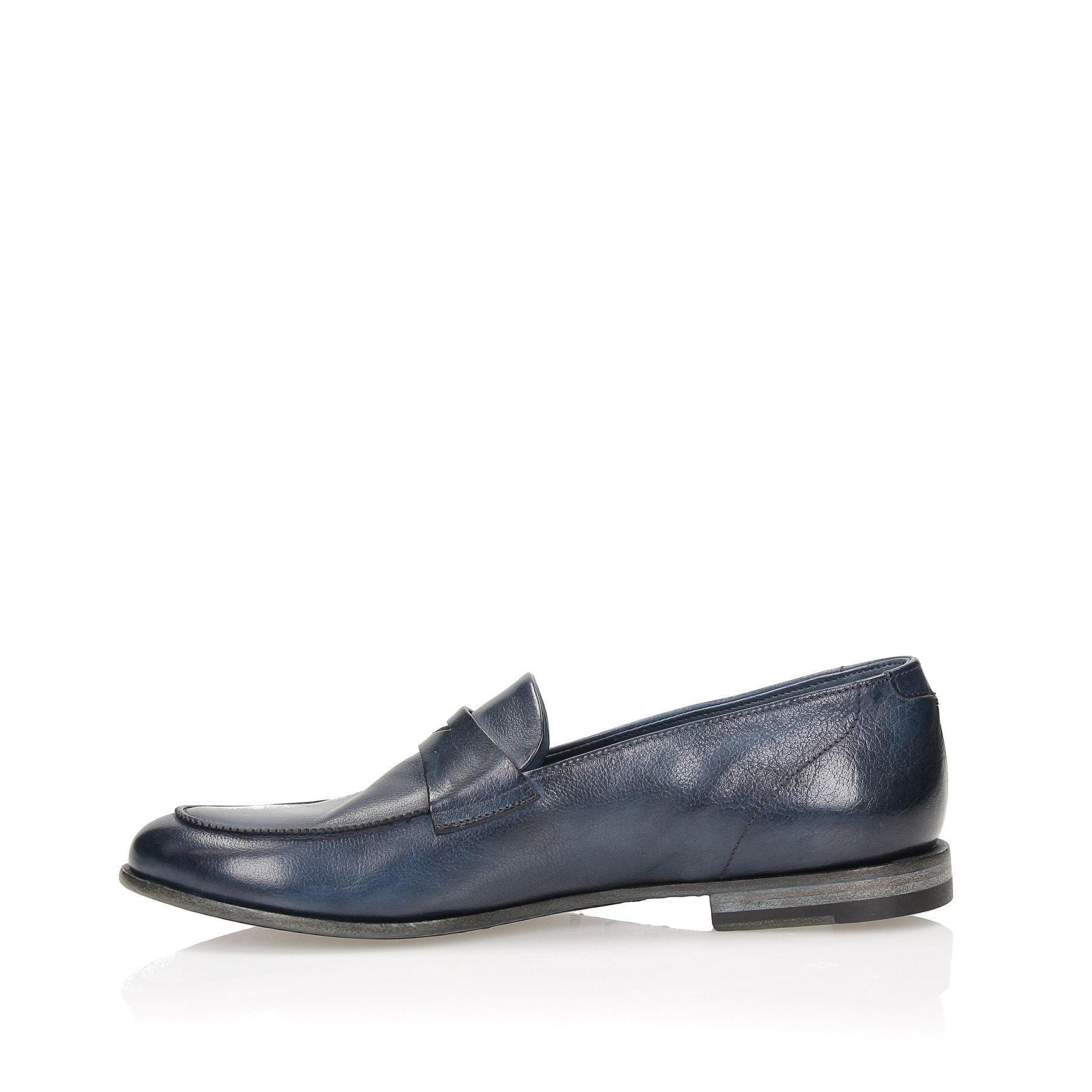 Blue aged leather loafers, 20 cm heel, stitched leather sole.