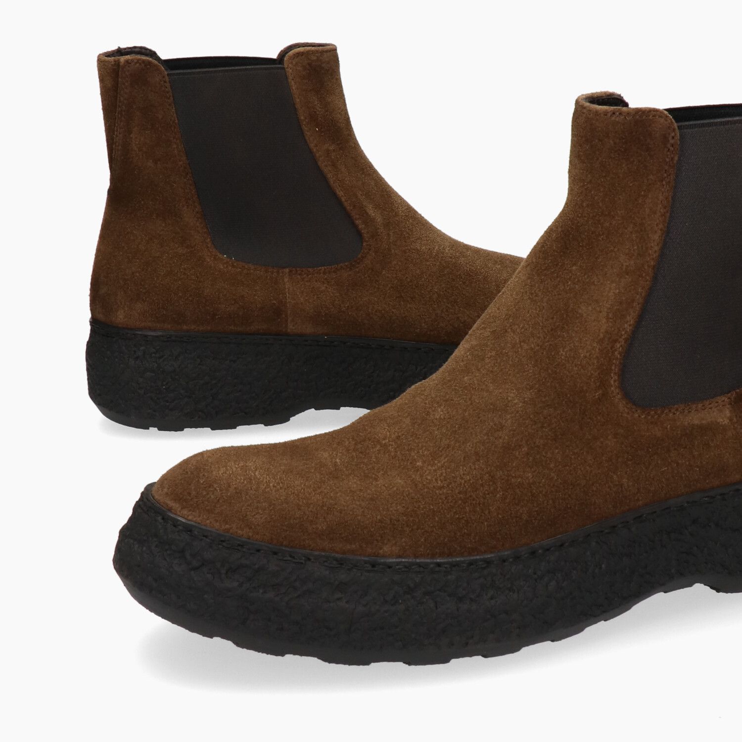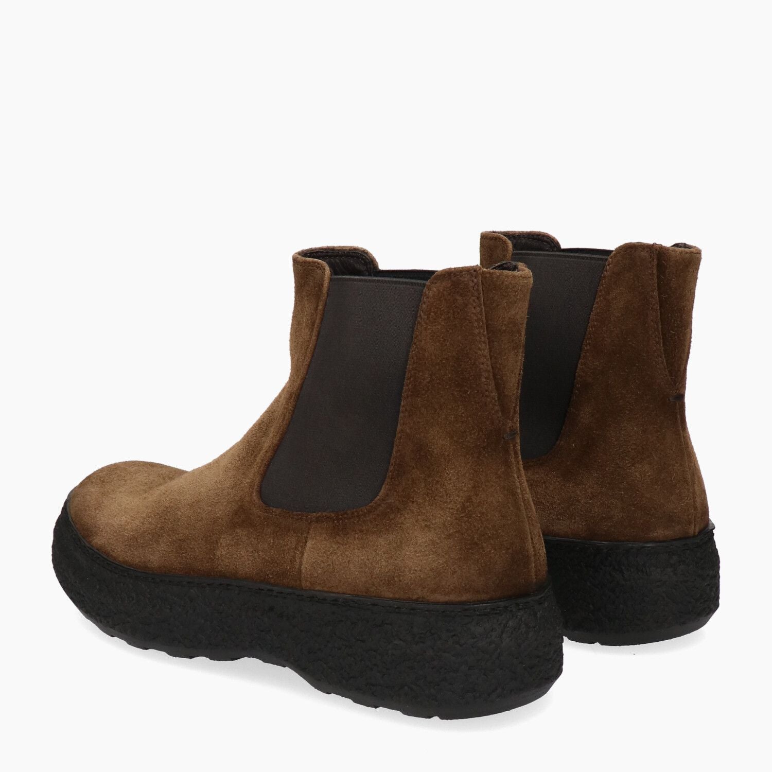 Aged brown suede ankle boots with elastic sides and rubber sole.