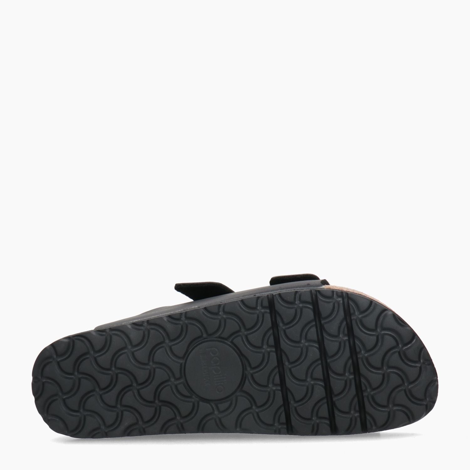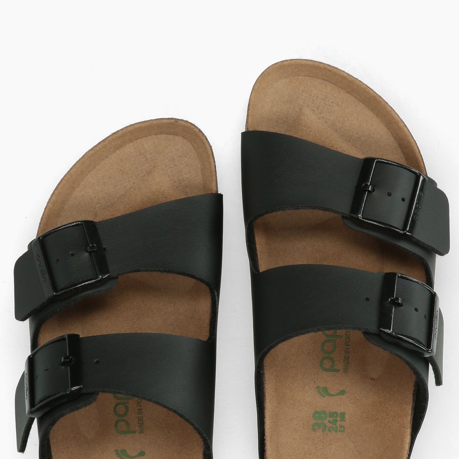 Arizona slipper. Black Birko-Flor double-strap upper. Metal buckle closure. Microfiber insole. Narrow fit. Cork outsole with 3 cm platform. Papillio Vegan Collection by Birkenstock.