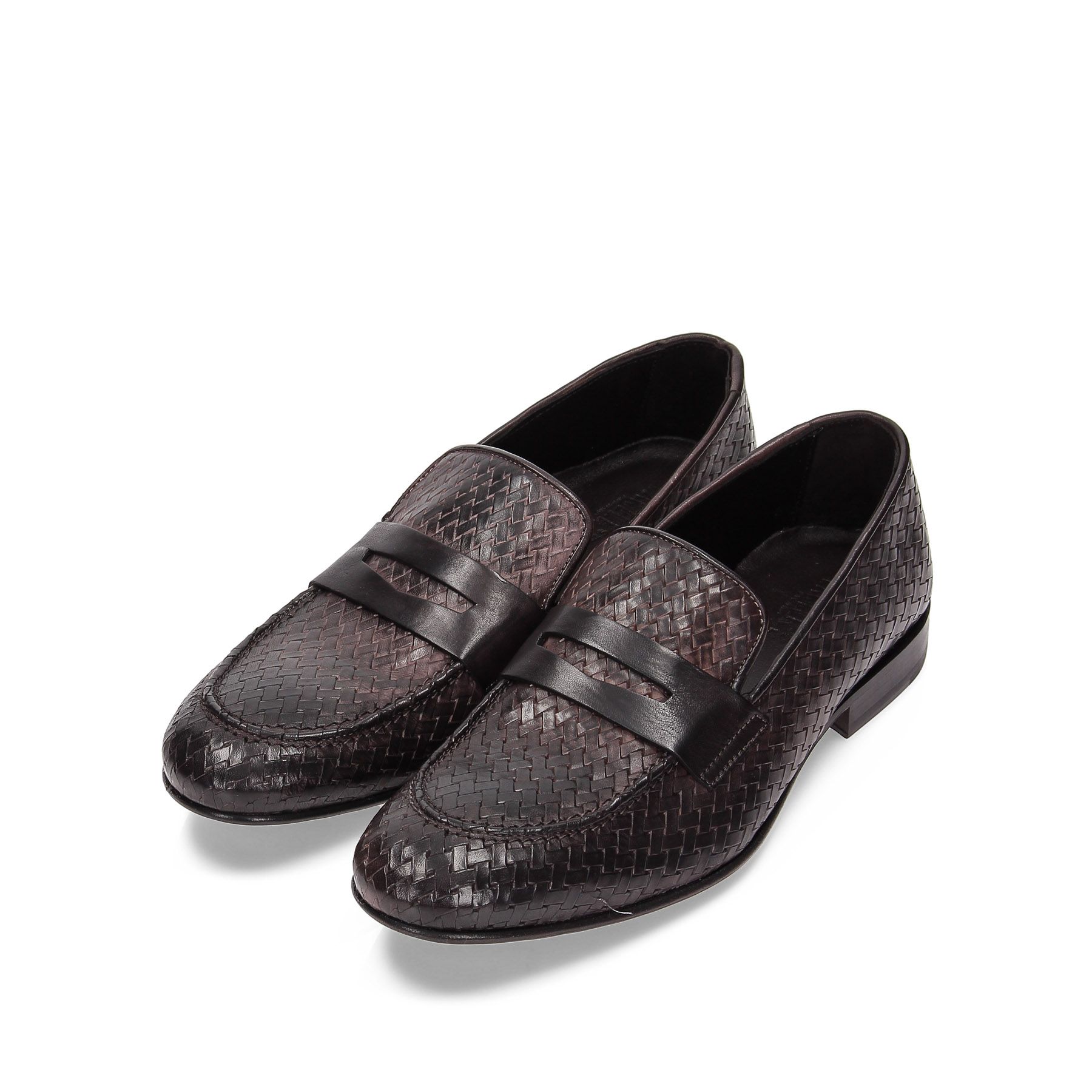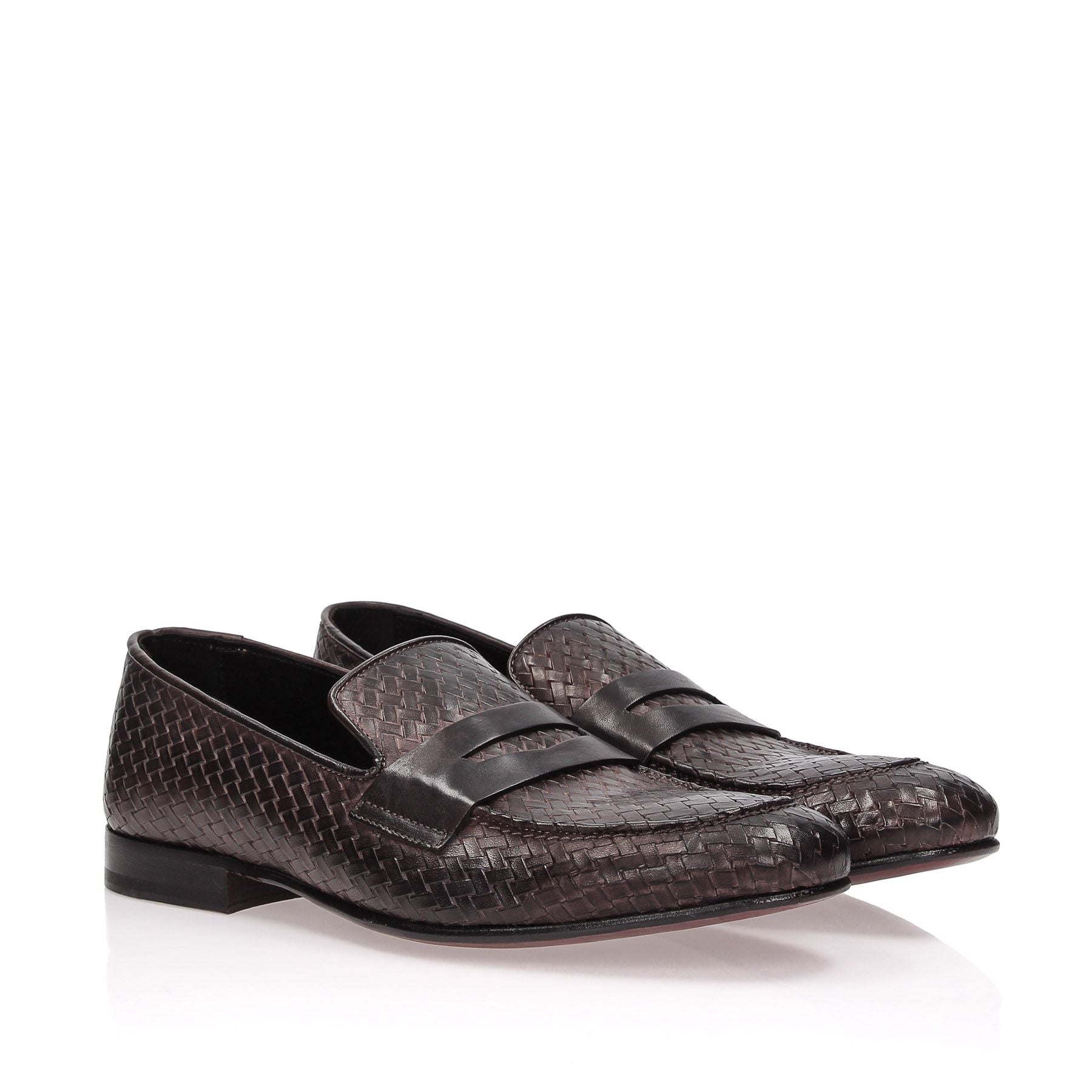 Moccasins in aged dark brown printed leather, 20 cm heel, leather sole.