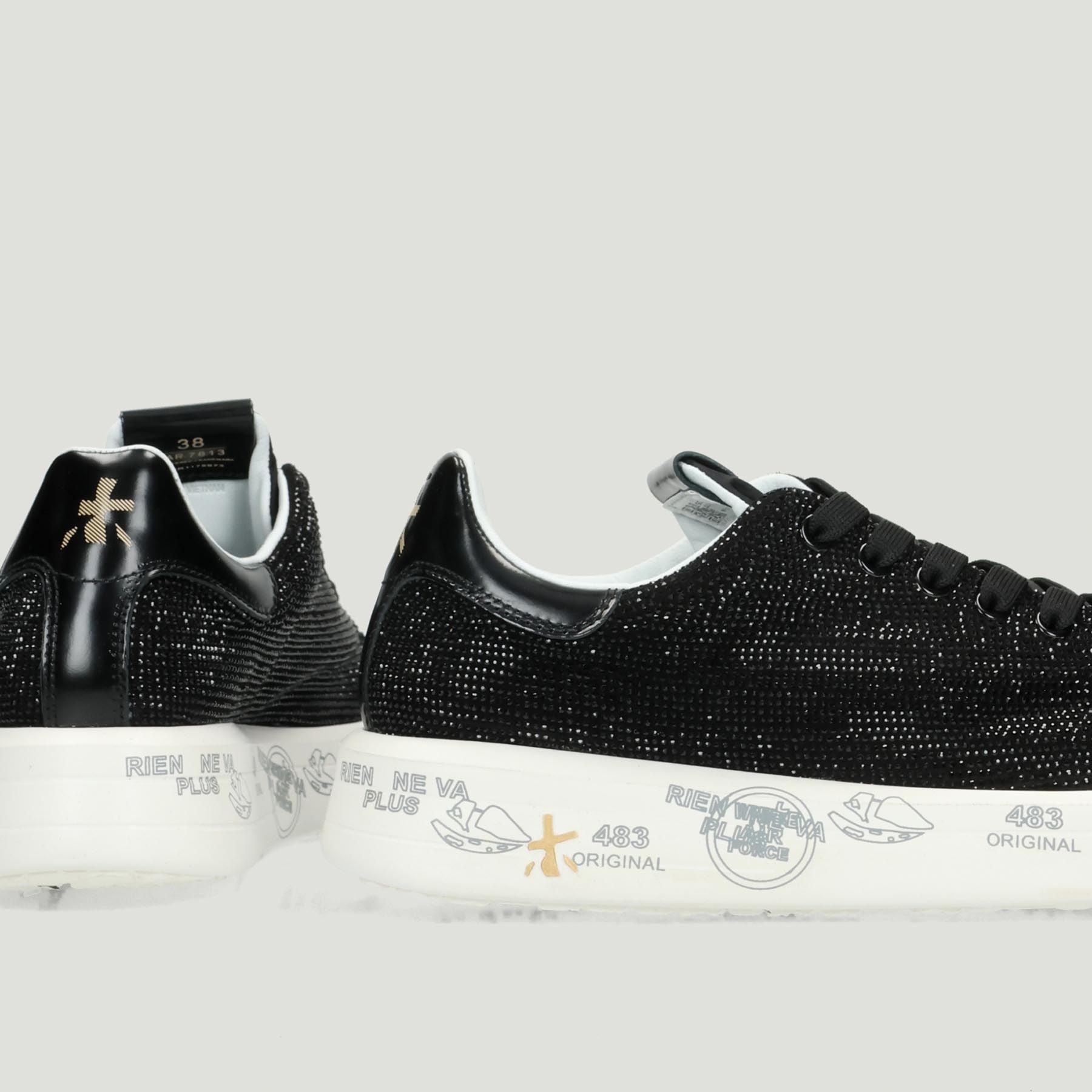 Premiata Belle sneakers with black leather upper and rhinestones. Black lace-up closure. Logo tongue. Logo heel tab. Leather lining with removable insole. 4 cm rubber sole. Premiata women's collection.