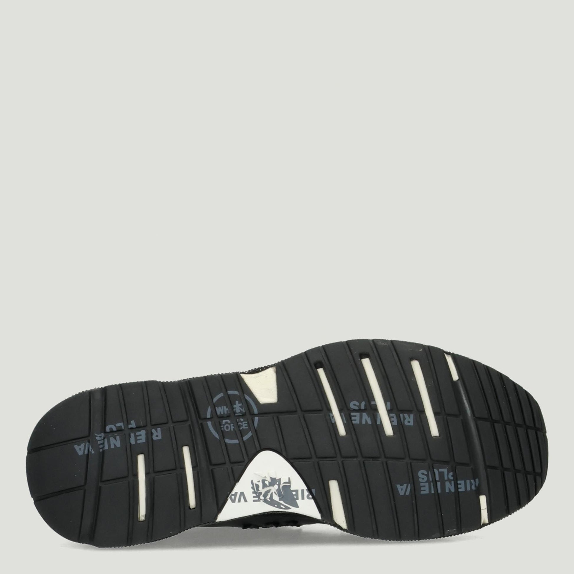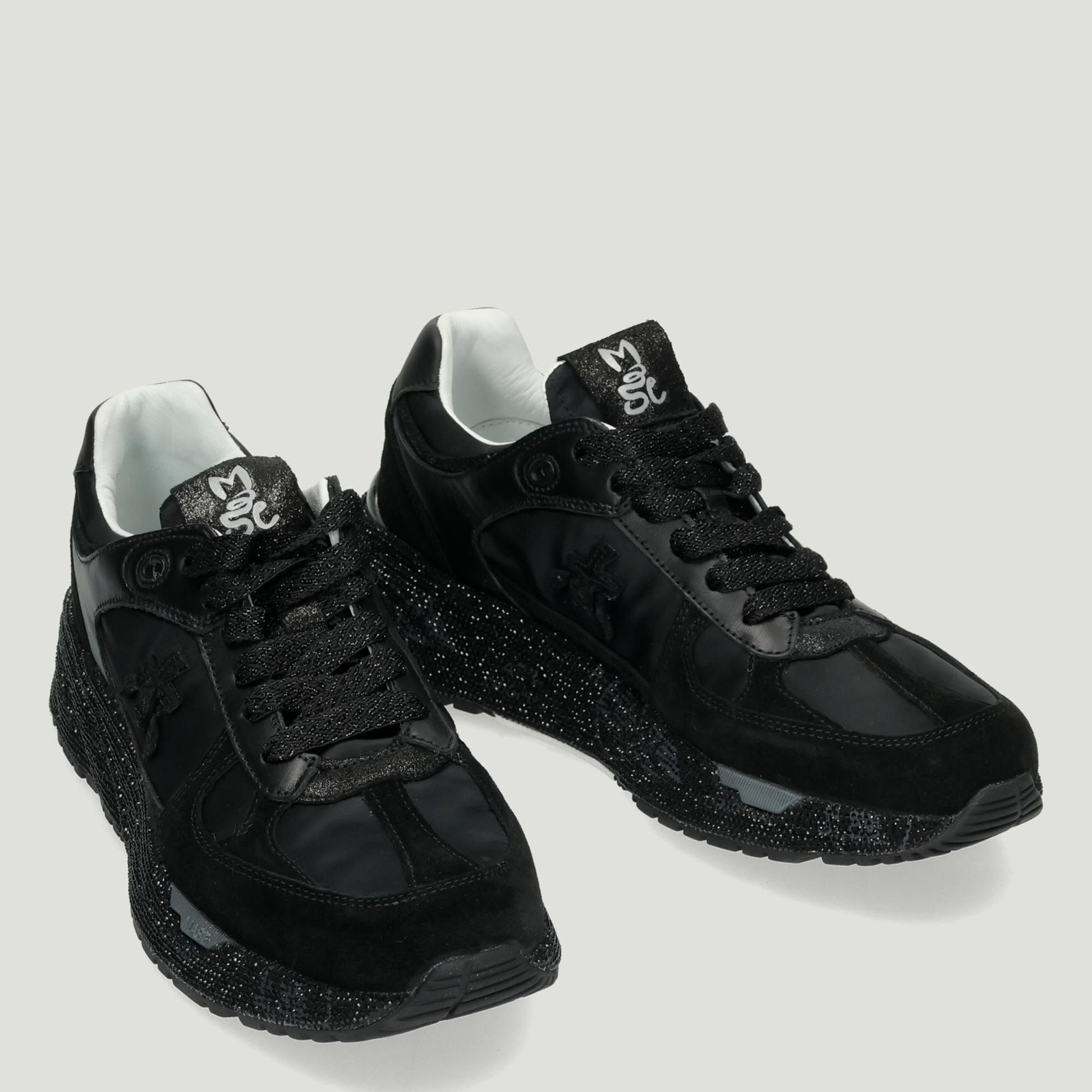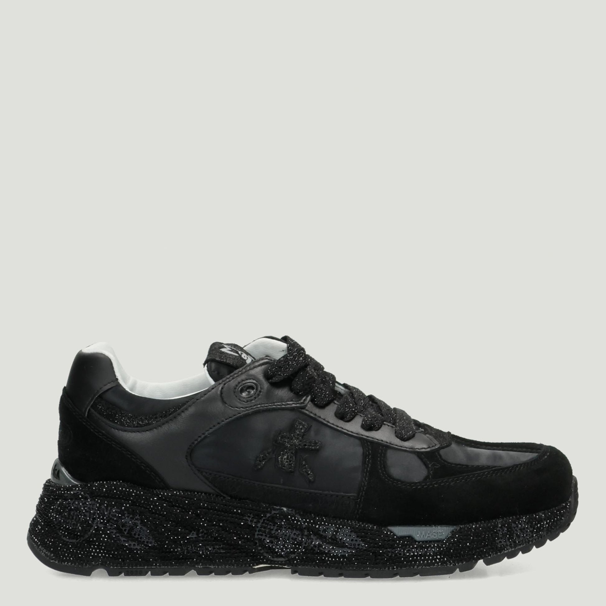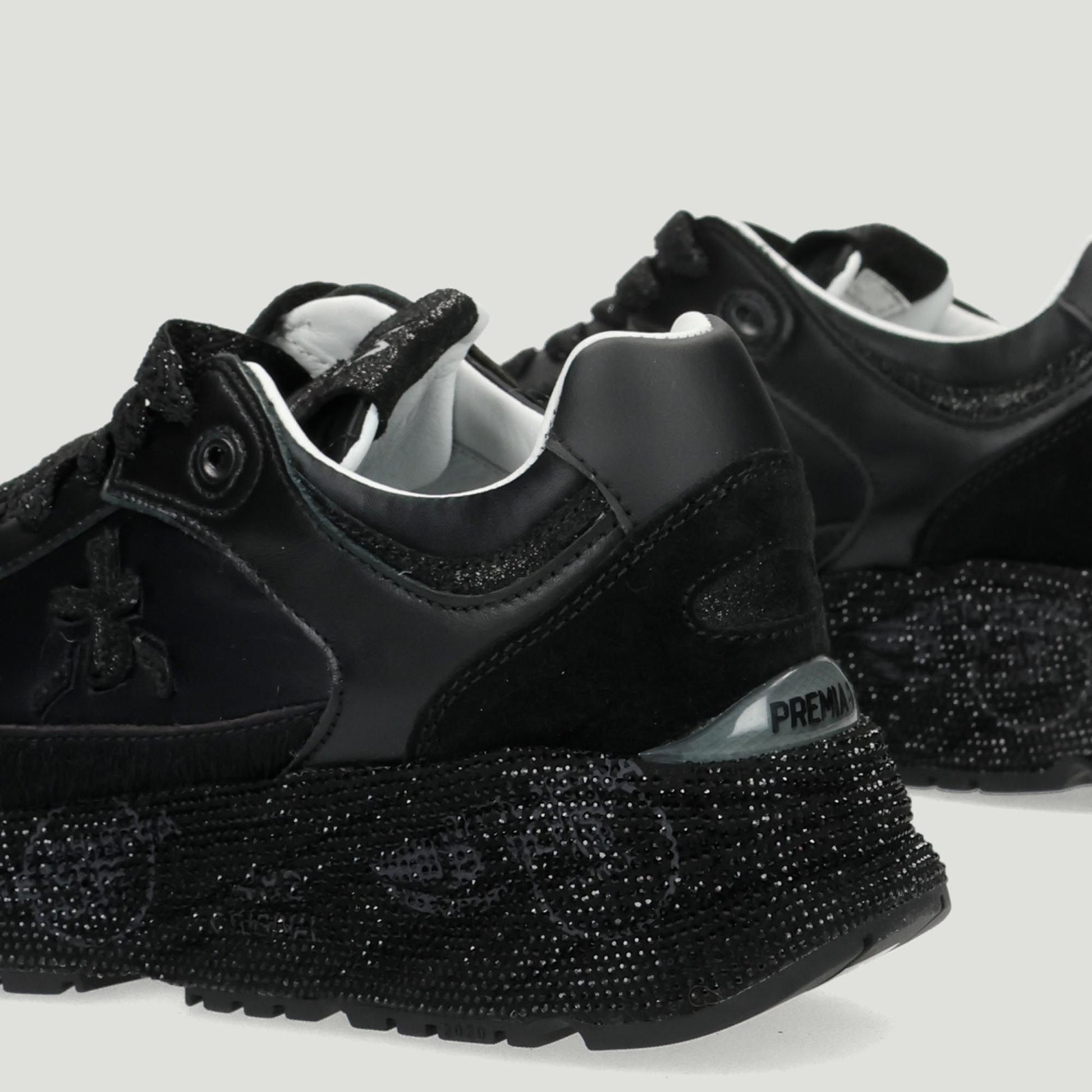 Premiata sneakers with black nylon and suede upper. Black laminated leather logo. Glittery cotton laces. Logo tongue. Removable leather insole. Rubber sole with black rhinestones. Premiata women's Fall/Winter collection.