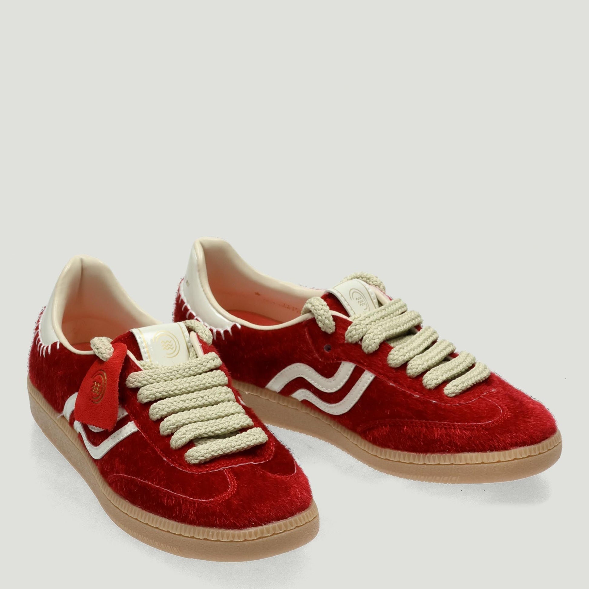 Sneakers in red pony-skin fabric. White leather side stripe. Lace/cord closure with replacement full-size cotton laces. Fabric lining with removable insole. Putty-colored rubber sole. Prima Base women's collection.