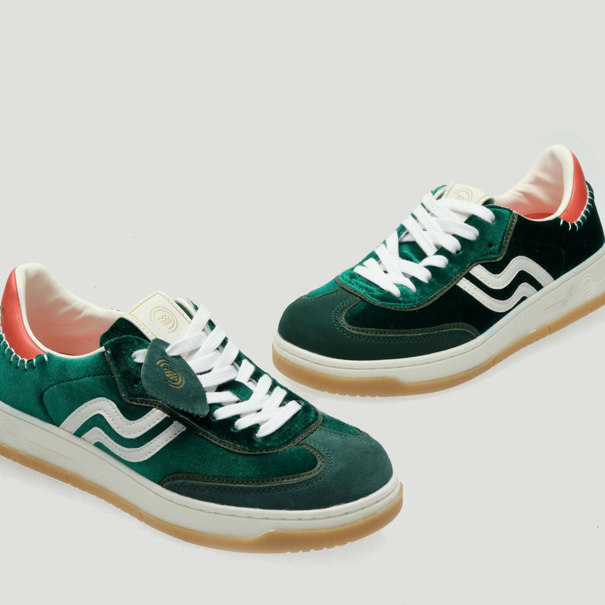 Green velvet sneakers with green suede trim. White leather side stripe. Cotton lace-up closure. Fabric lining with removable insole. Rubber sole with mastic-colored tread. Prima Base women's collection.