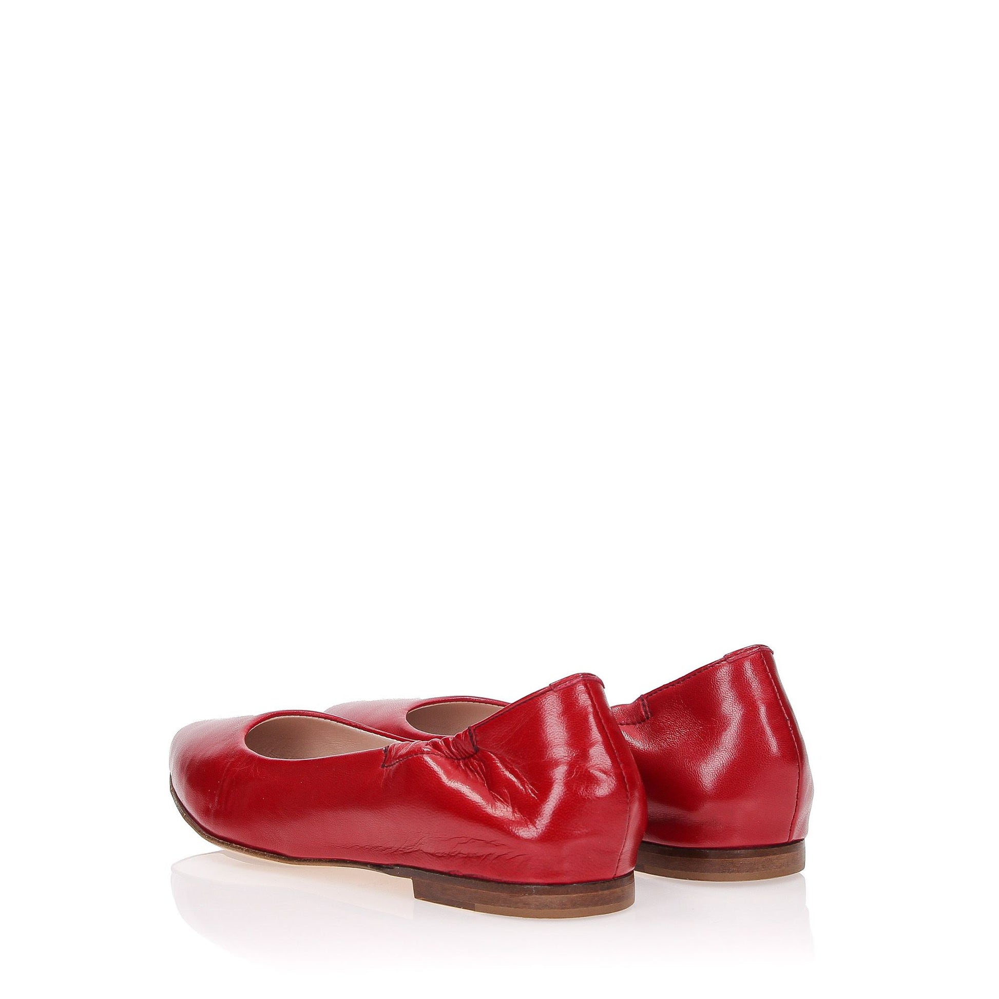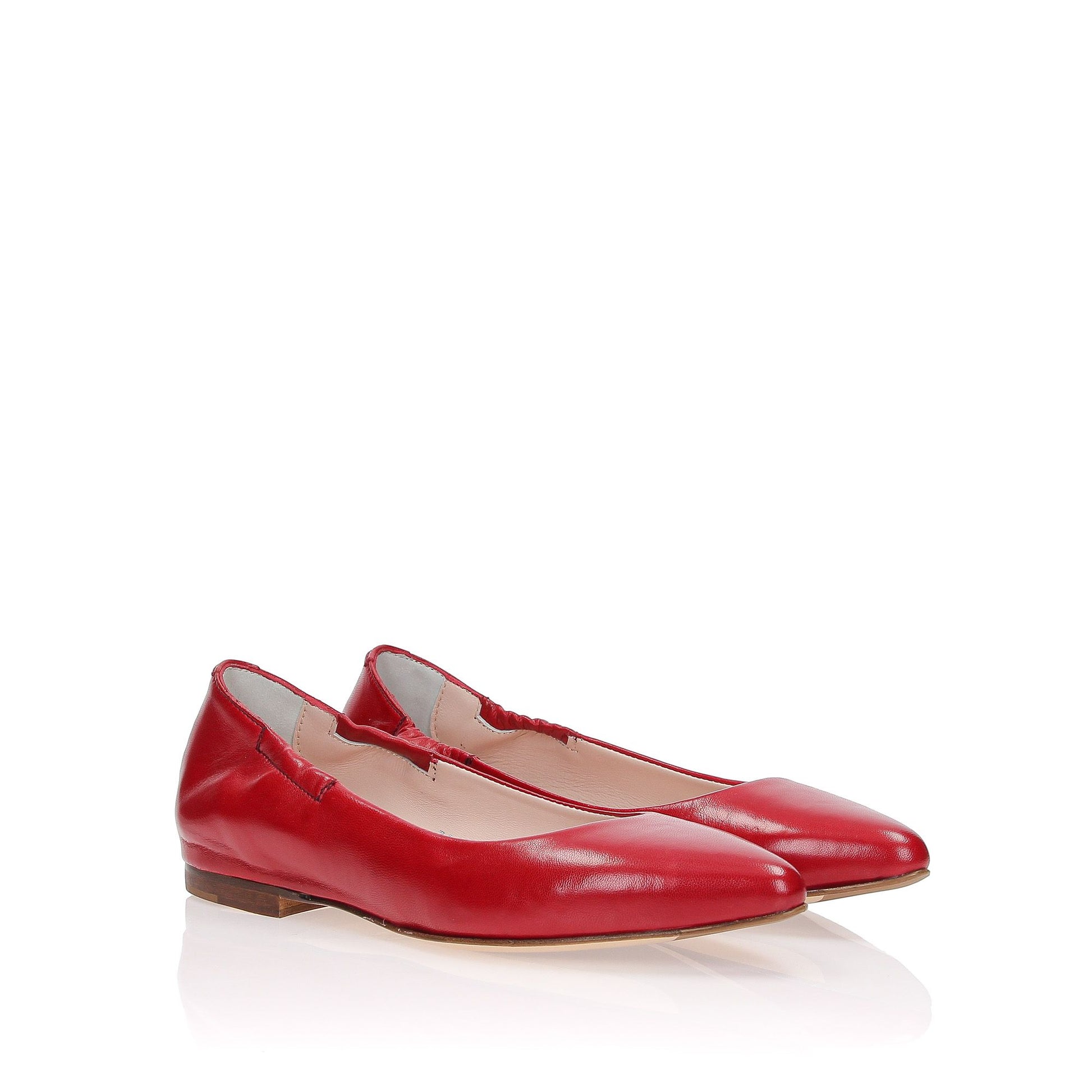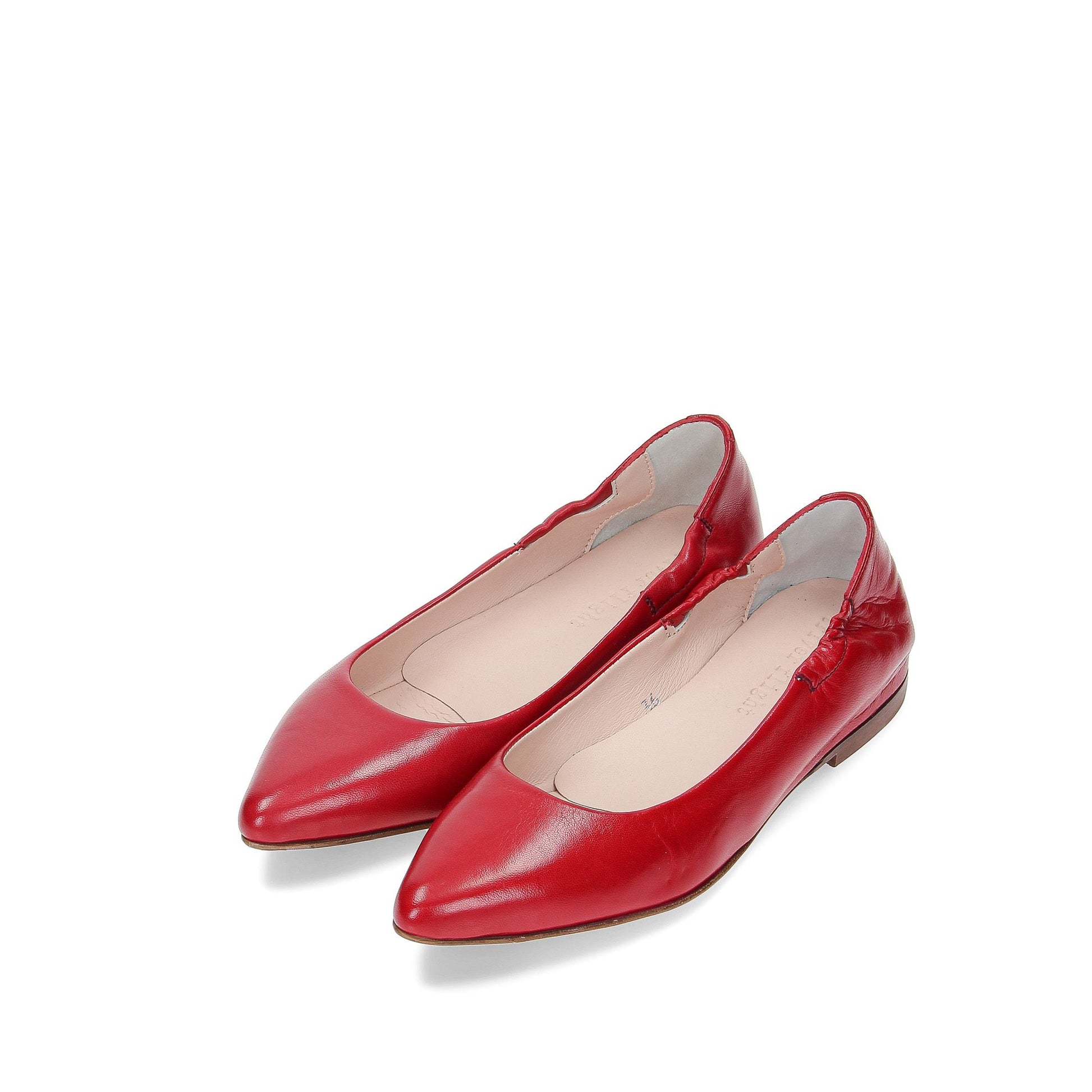 Red leather ballerinas, bag-style construction, 15cm internal wedge, leather sole.