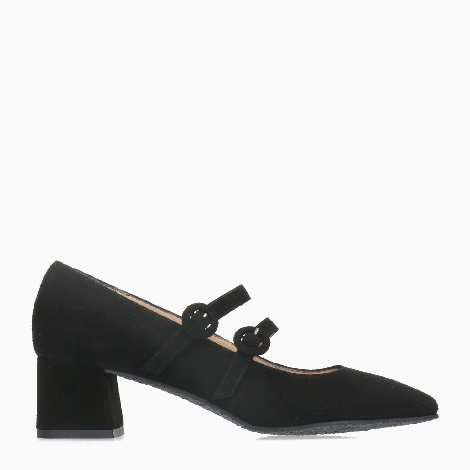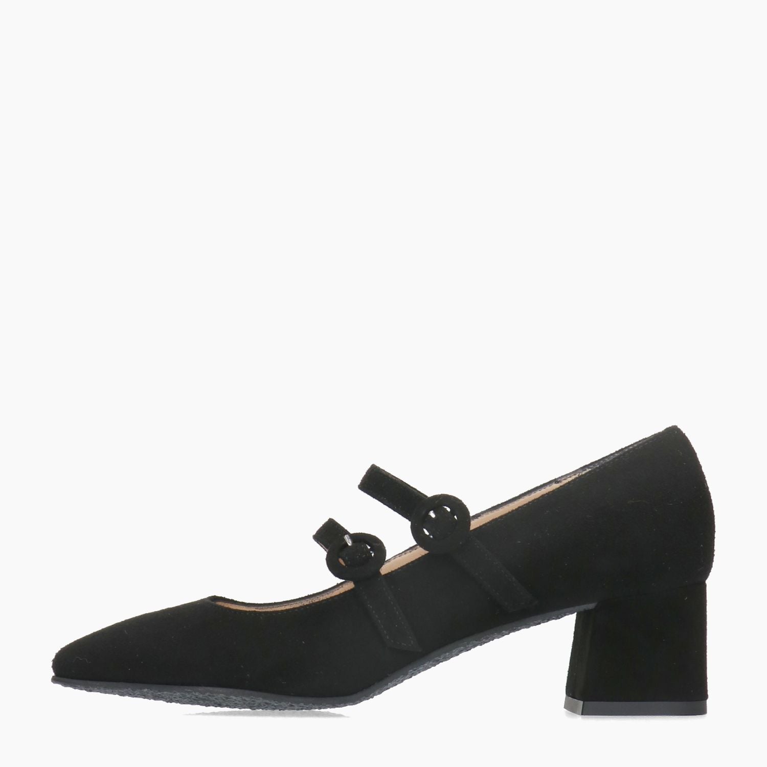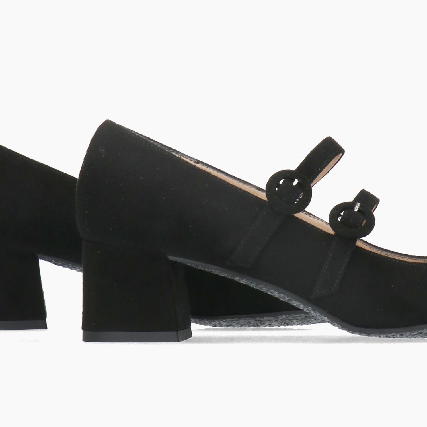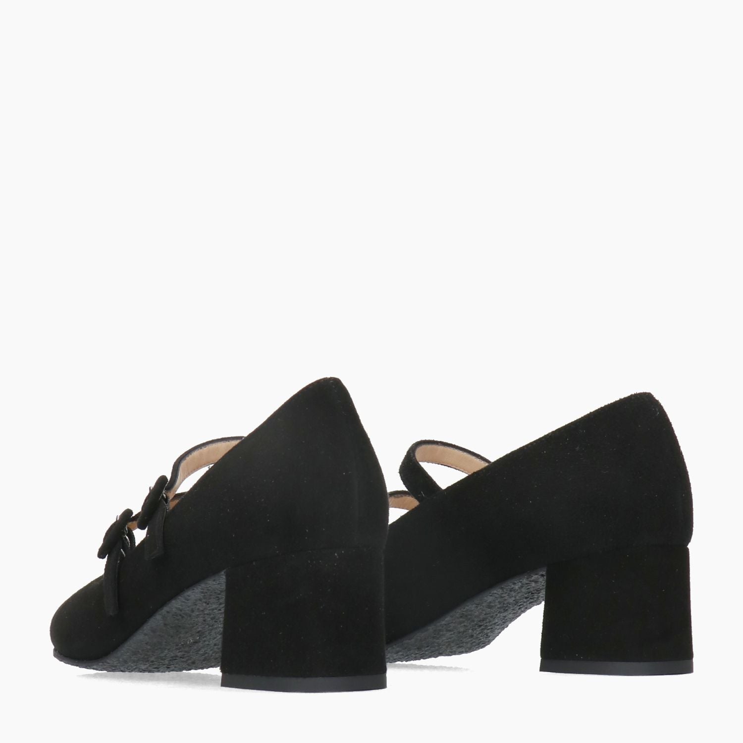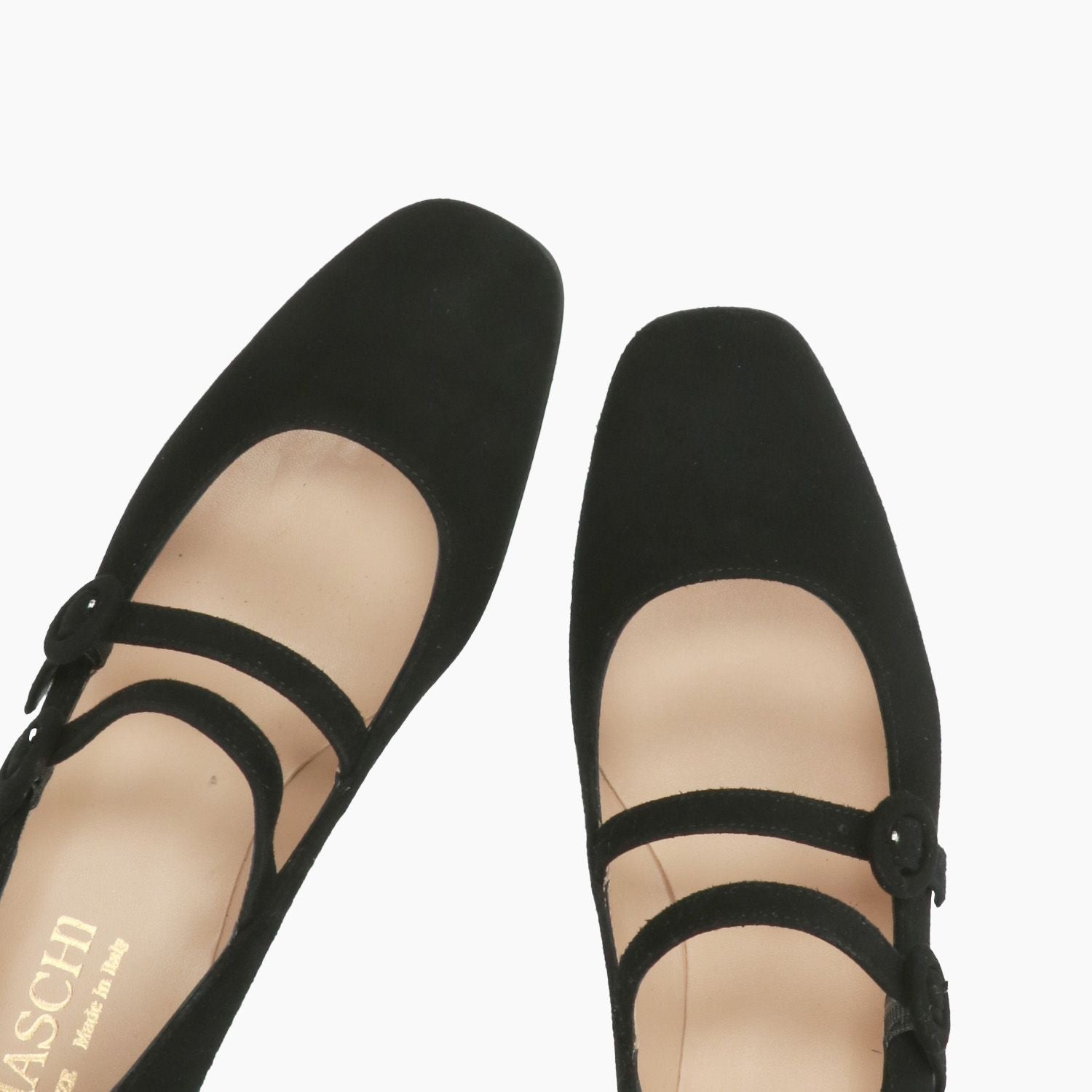 Black suede pumps with double strap closure. Square toe. Leather lining. Rubber sole with 5 cm heel. Ciaschi Firenze women's Fall/Winter collection.