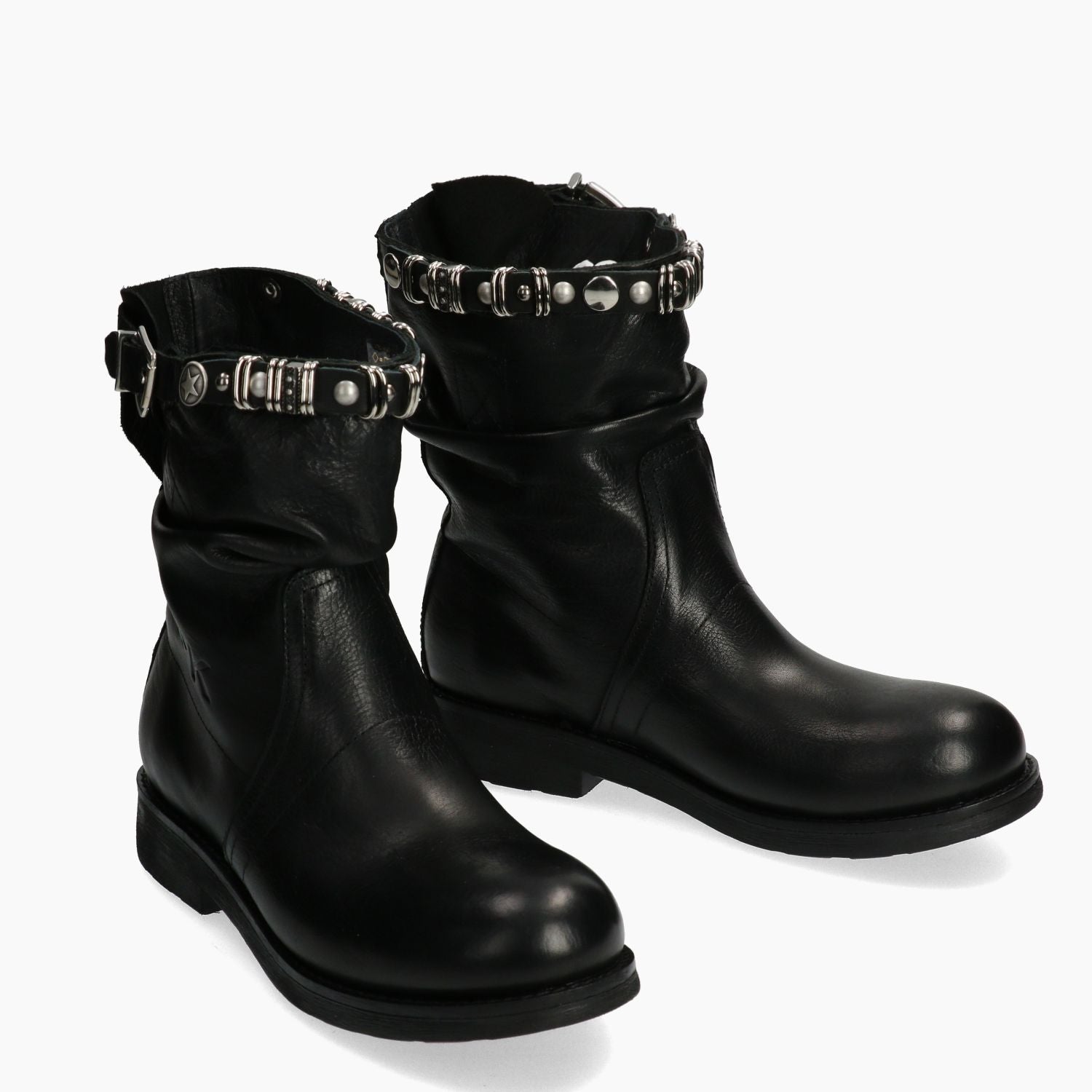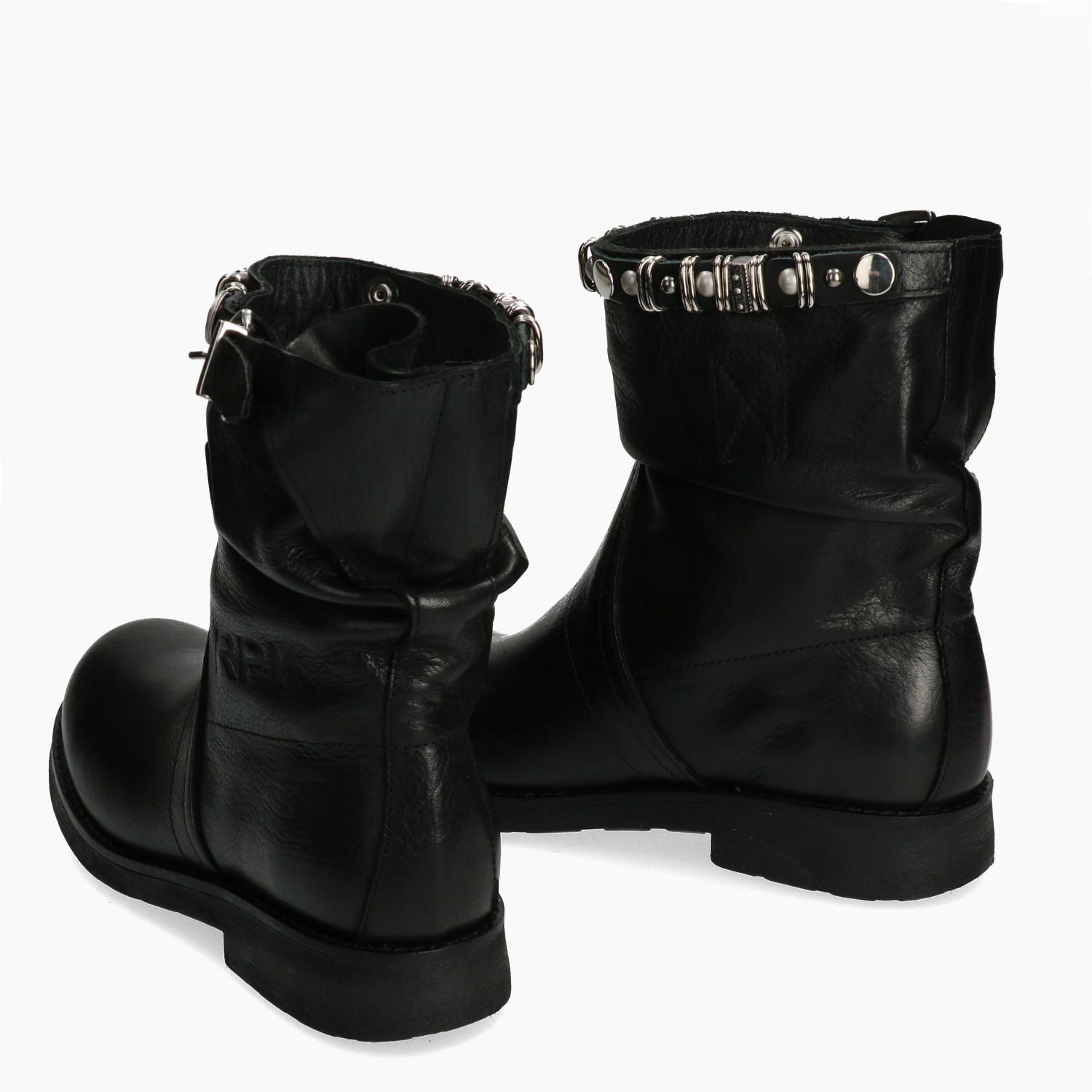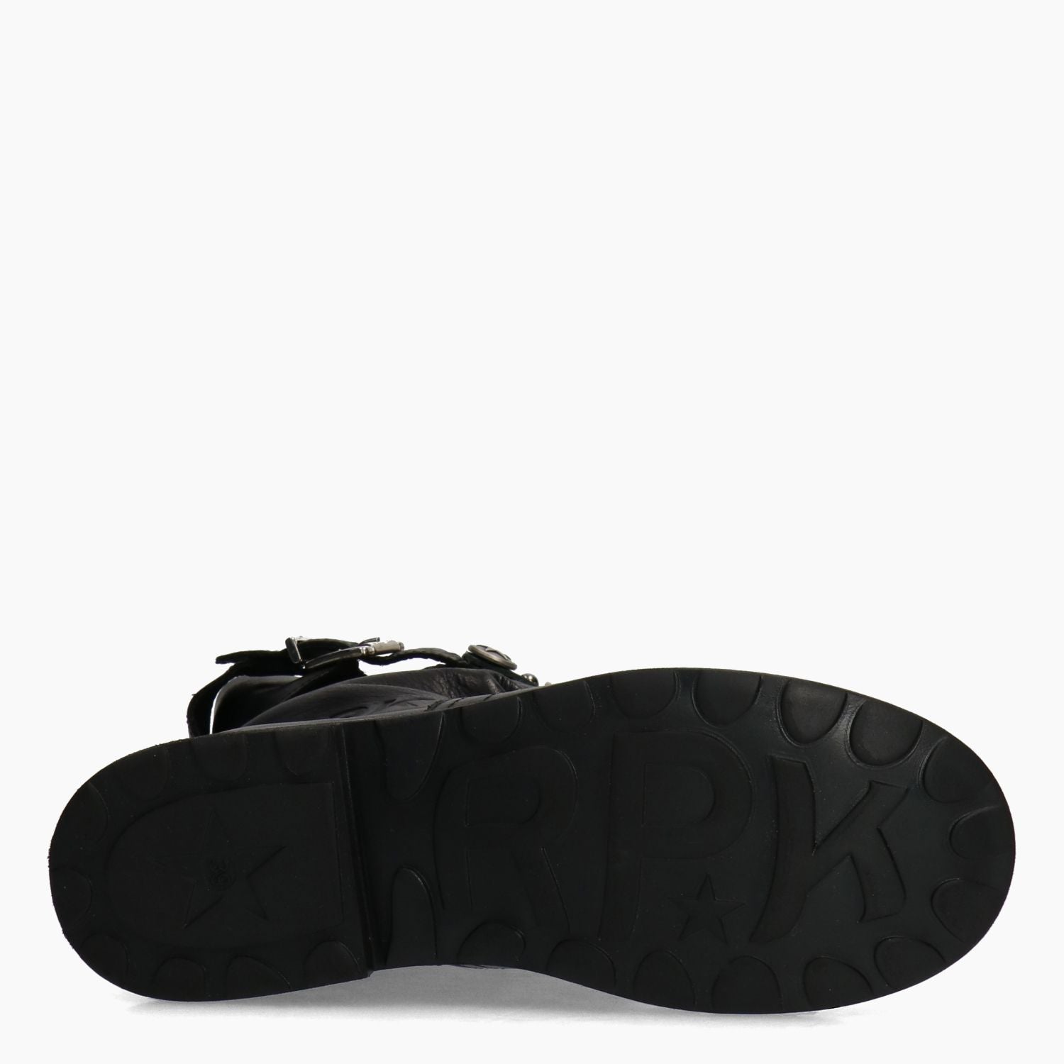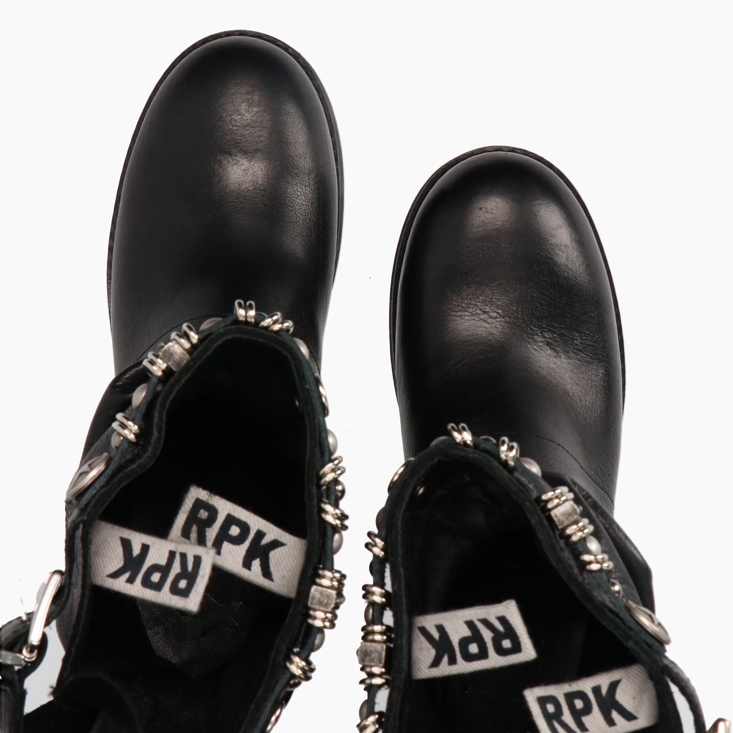 Black leather biker boot with logo. Adjustable buckle strap. Studded strap with silver loops, removable with snap buttons. Two logo loops on the shaft. Leather lining. Rubber sole with 4 cm heel. RPK women's Fall/Winter collection.