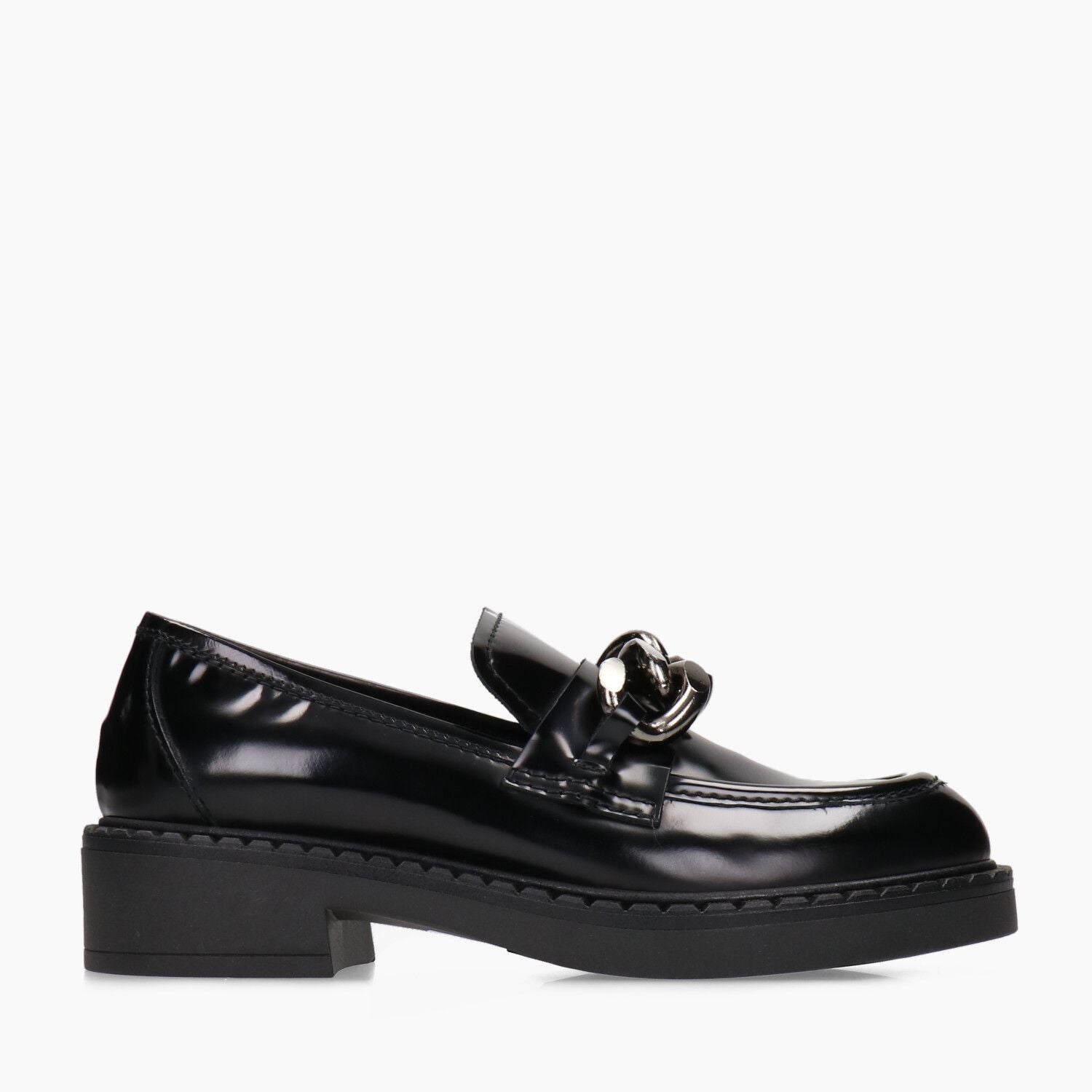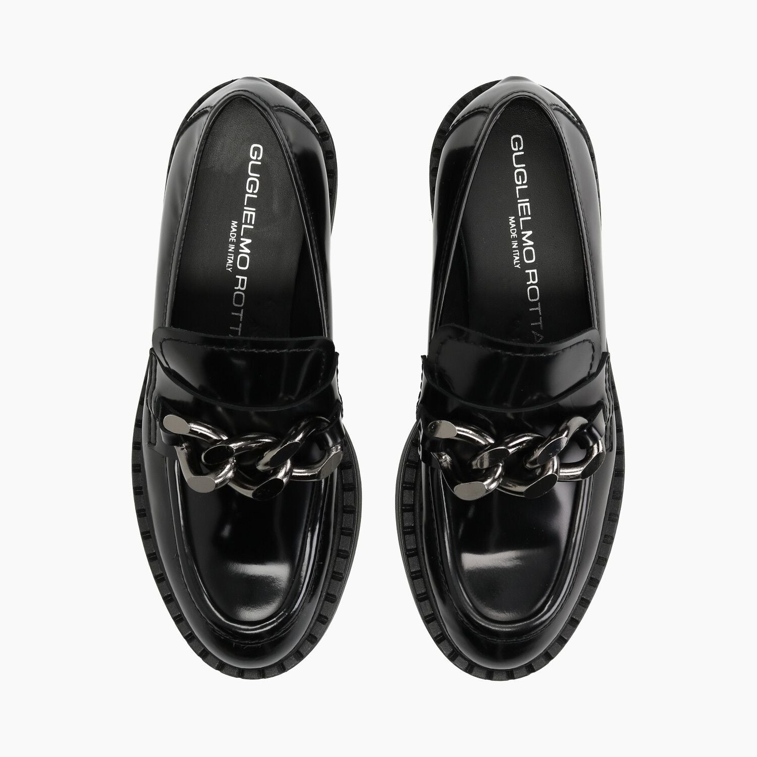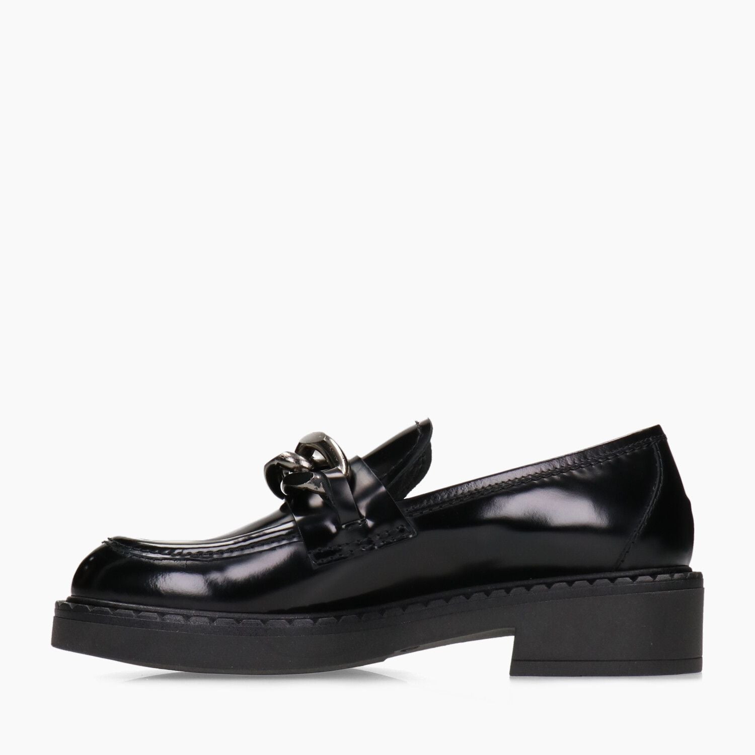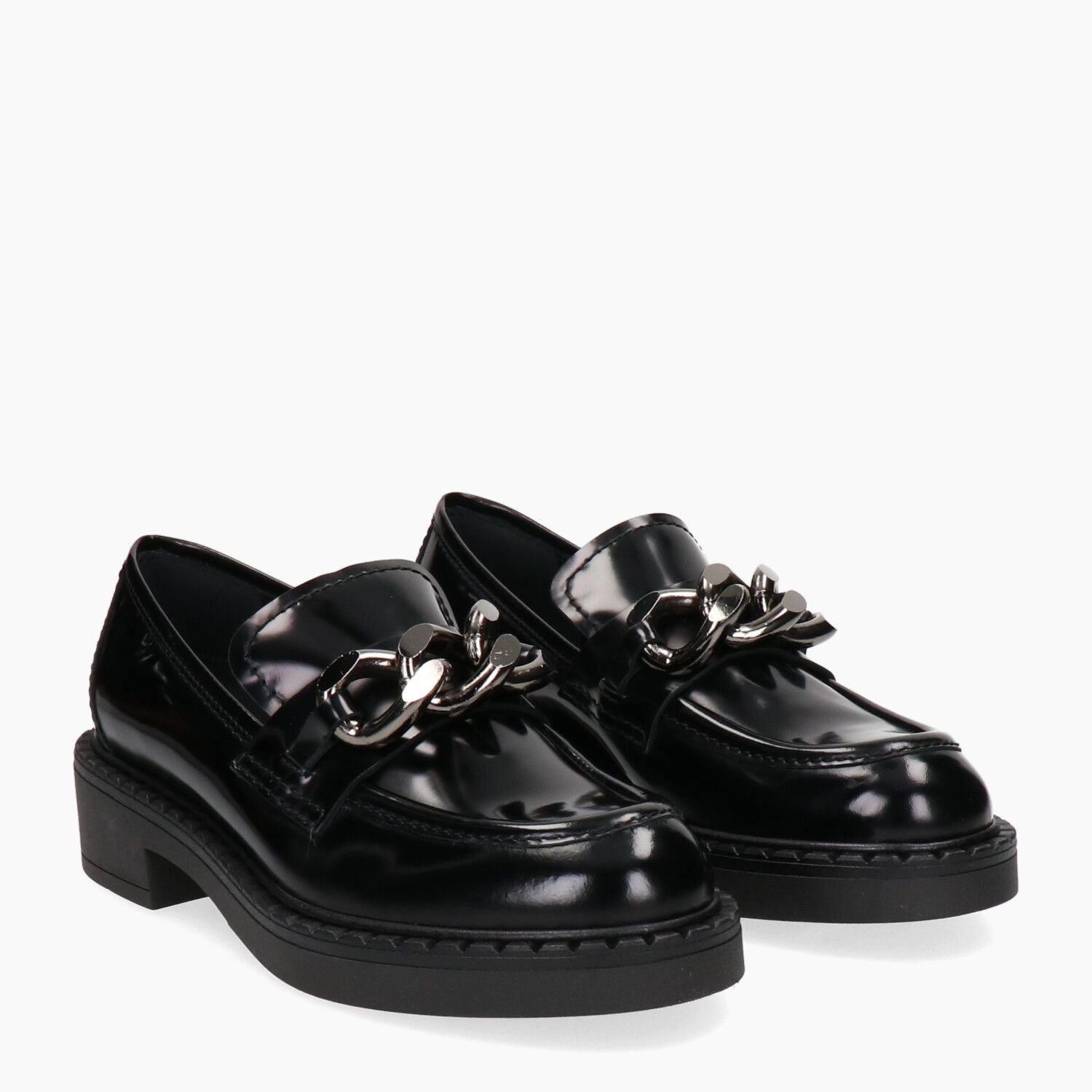 Black patent leather loafers with gunmetal chain, rubber sole.