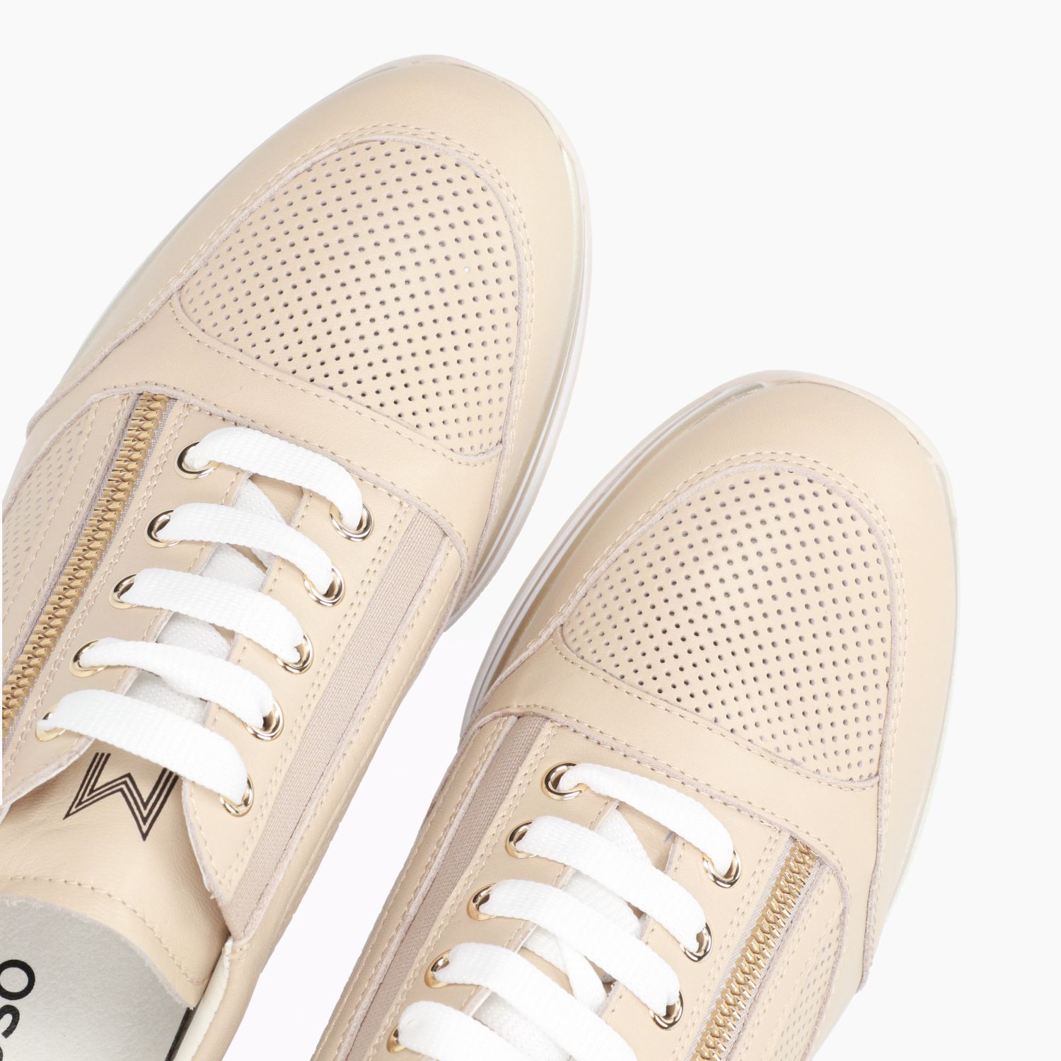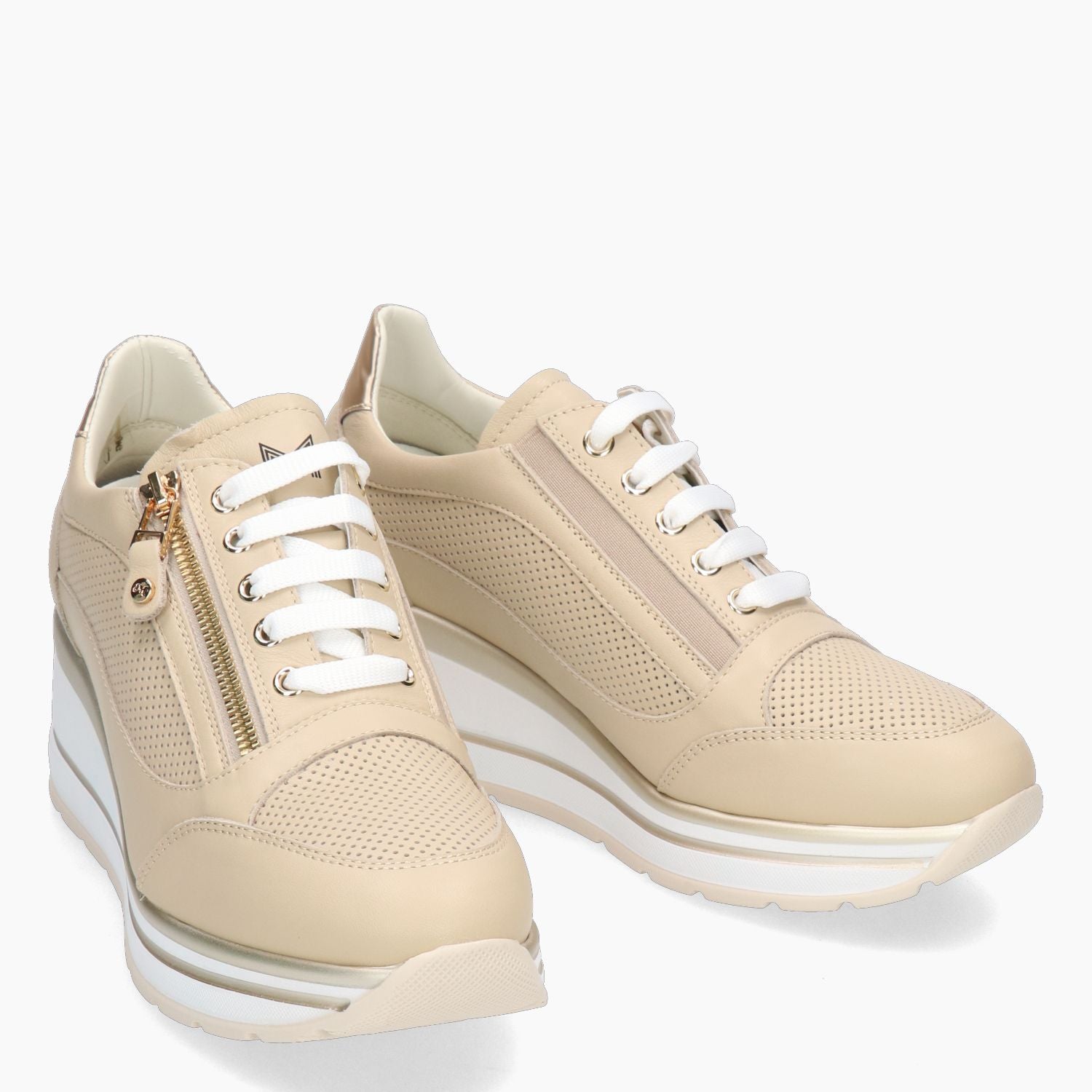 Beige leather sneakers with perforations. Lace-up closure and side zip. Leather lining with removable insole. 6 cm rubber wedge. Melluso women's Spring/Summer collection.