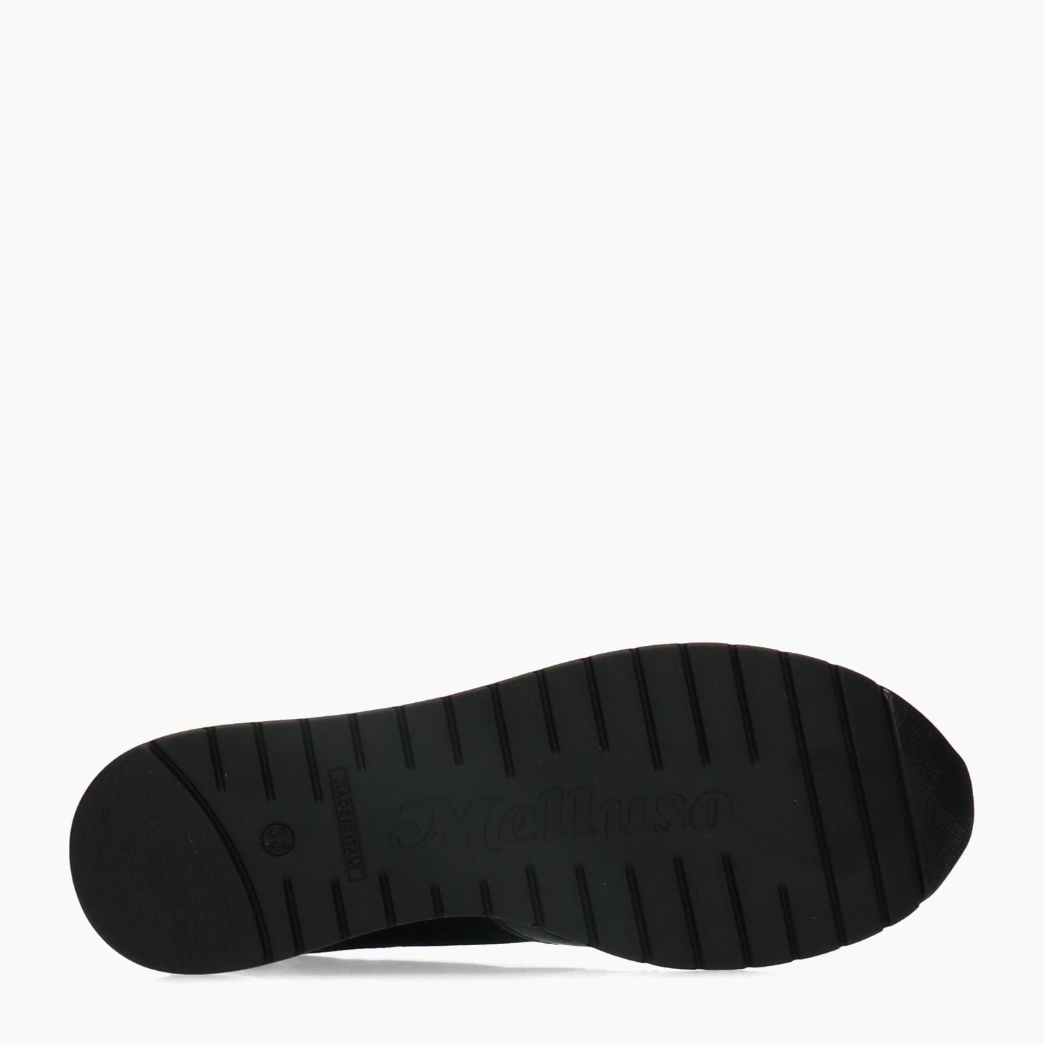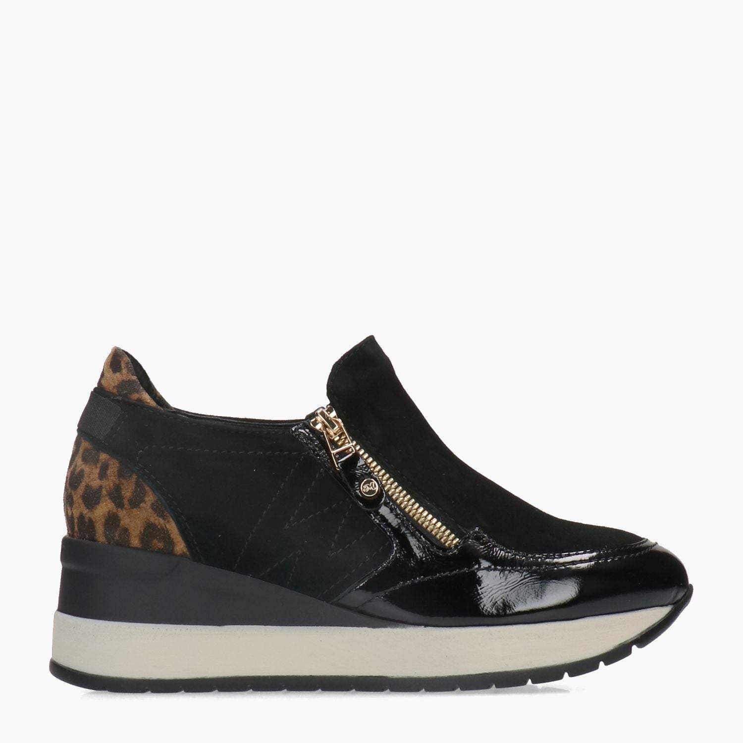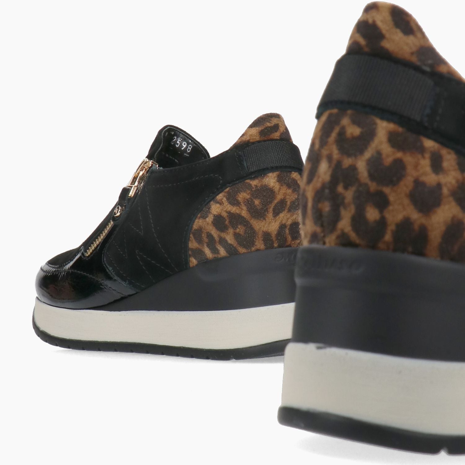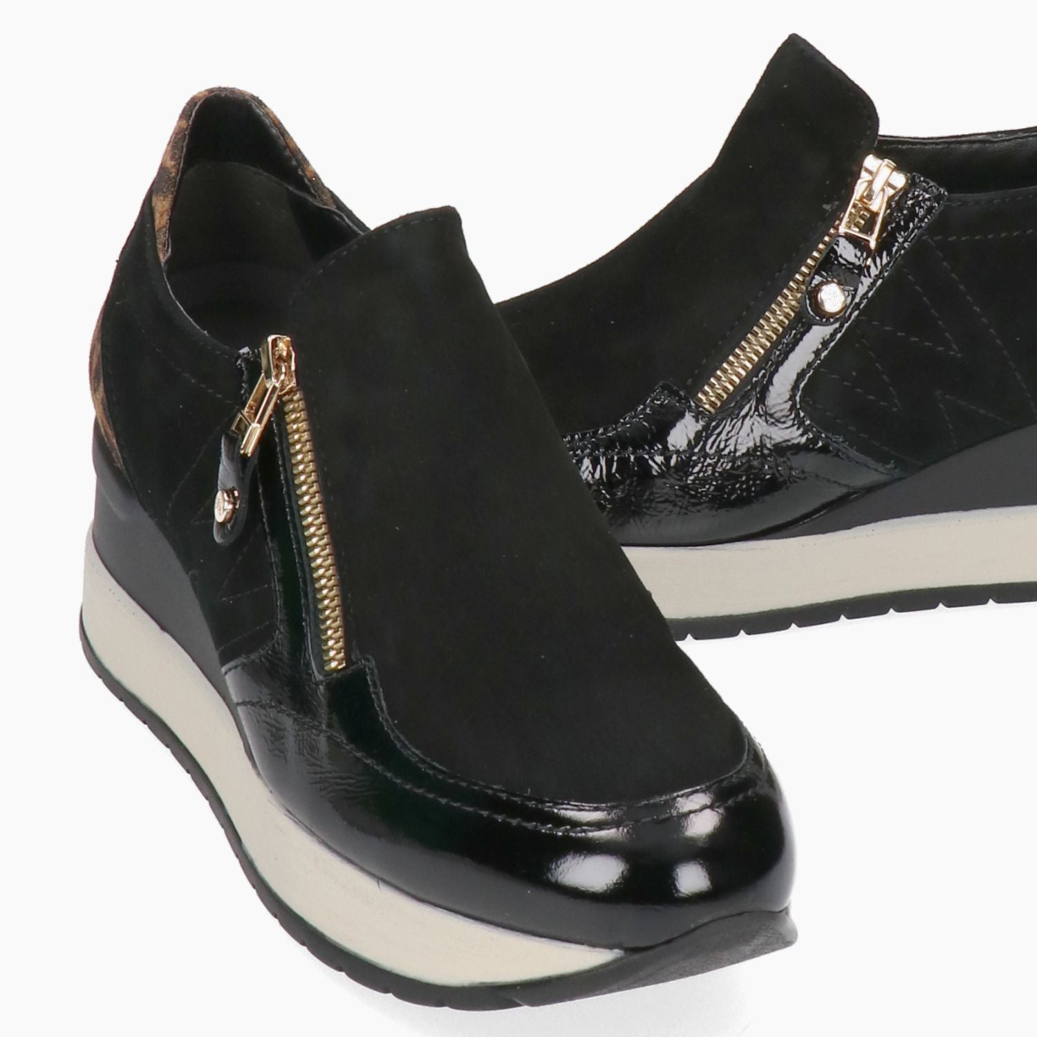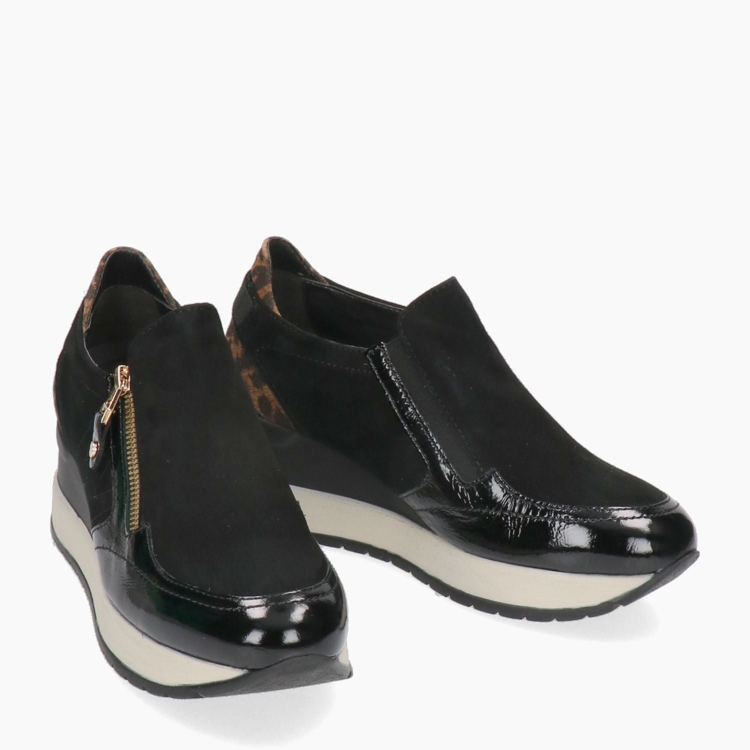 Black suede sneakers with black patent leather inserts. Round toe. Gold zip closure. Elastic insert. Fabric lining. Removable insole. Rubber sole with 5 cm wedge. Melluso women's Fall/Winter collection.