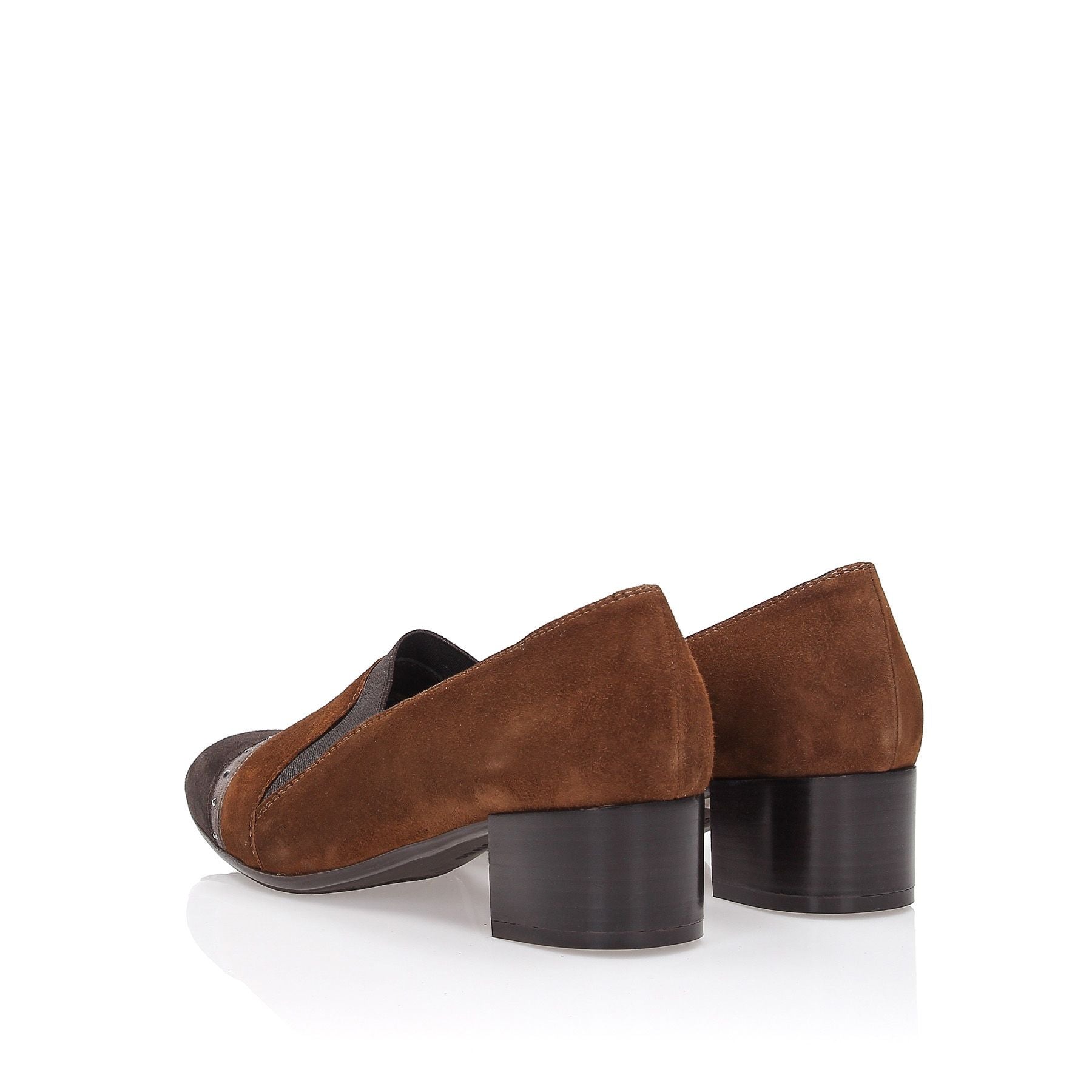 Dove grey suede slippers with dark brown suede toecap and row of studs, 50cm heel, rubber sole.