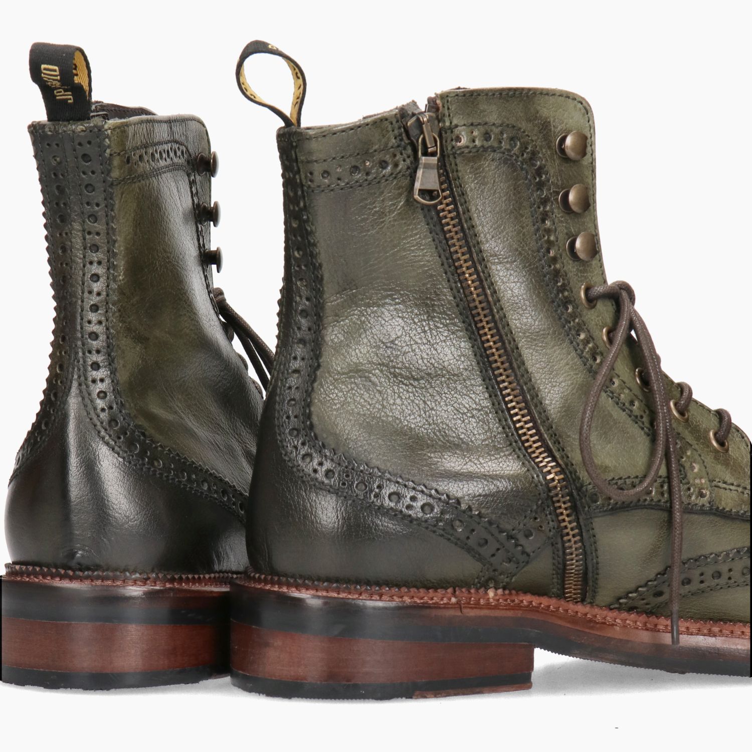 Leather ankle boot in aged military green with a swallowtail motif. Round toe. Lace-up and zip closure. Leather lining. Rubber sole with a 3 cm heel. JP/David men's Fall/Winter collection.