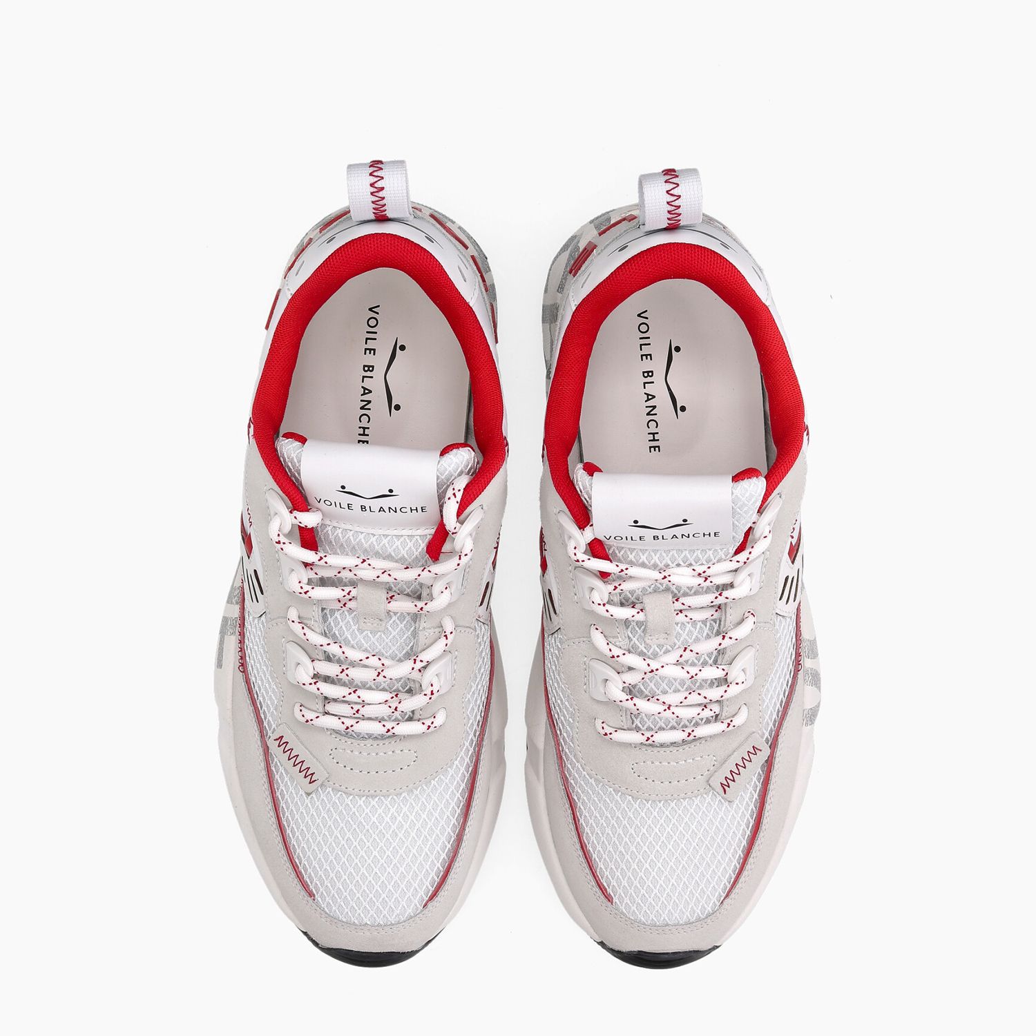 Sporty in white nylon and light grey suede, red profiles, sole with rubber logo.