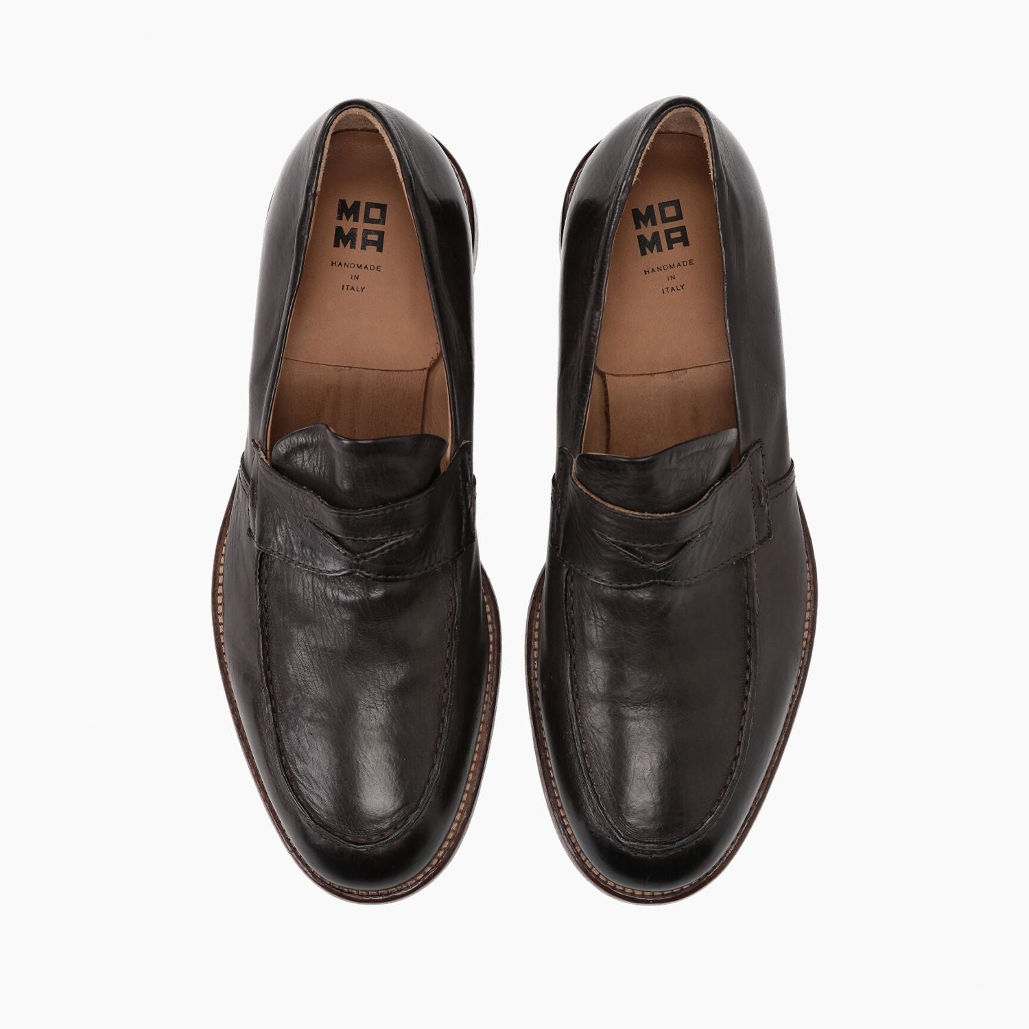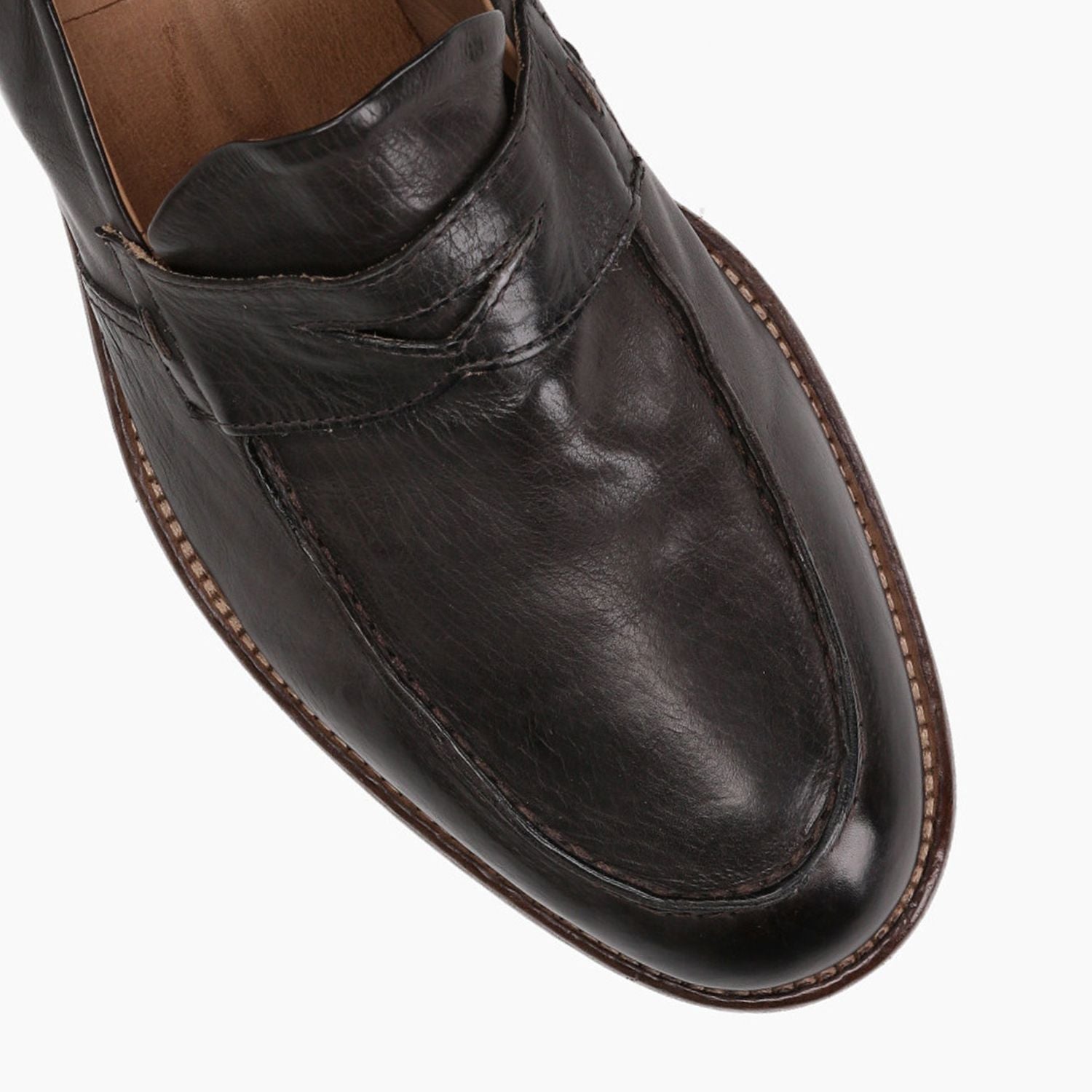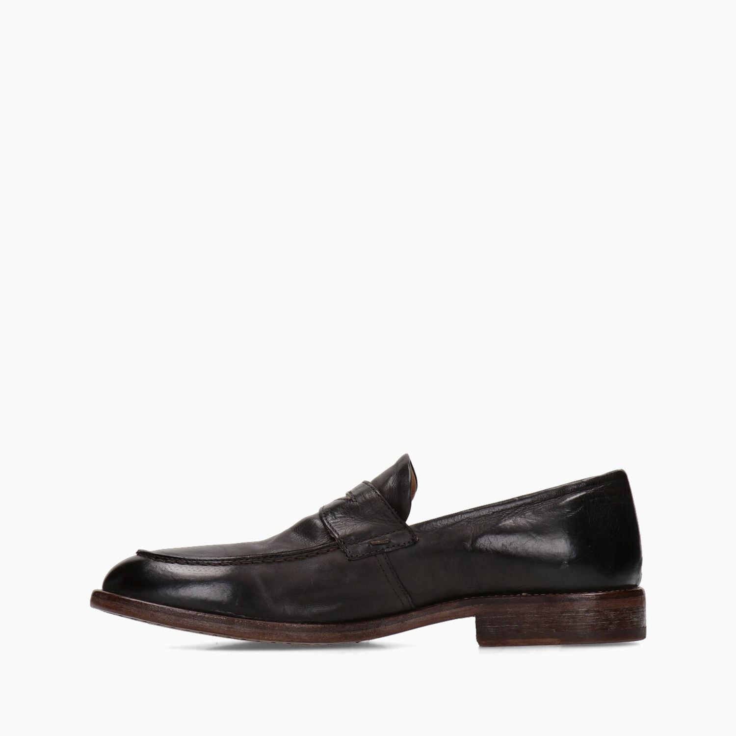 Coffee-colored leather loafers, 25 cm heel, leather and stitched rubber sole.