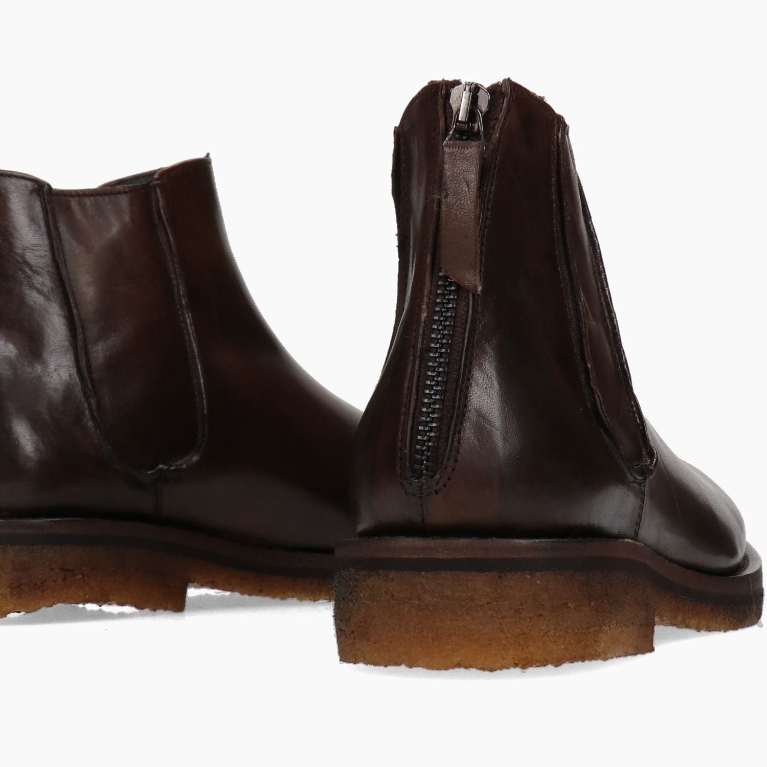Brown leather ankle boot with faux side insert. Back zip closure. Round toe. Leather lining. Rubber sole with 3 cm heel. Ernesto Dolani men's Fall/Winter collection.