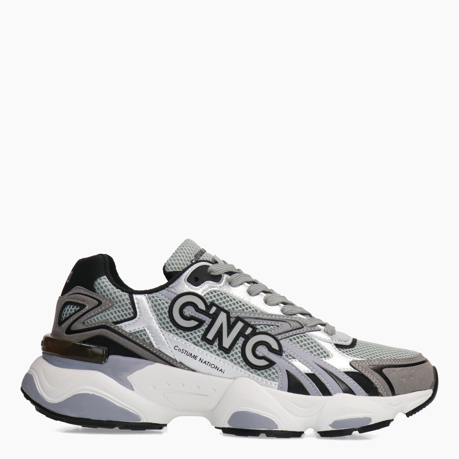Sneakers with gray nylon uppers and silver laminated faux leather inserts. Lace-up closure. Logo tongue. Fabric lining with removable insole. 4 cm rubber sole. C'N'C Costume National men's collection.
